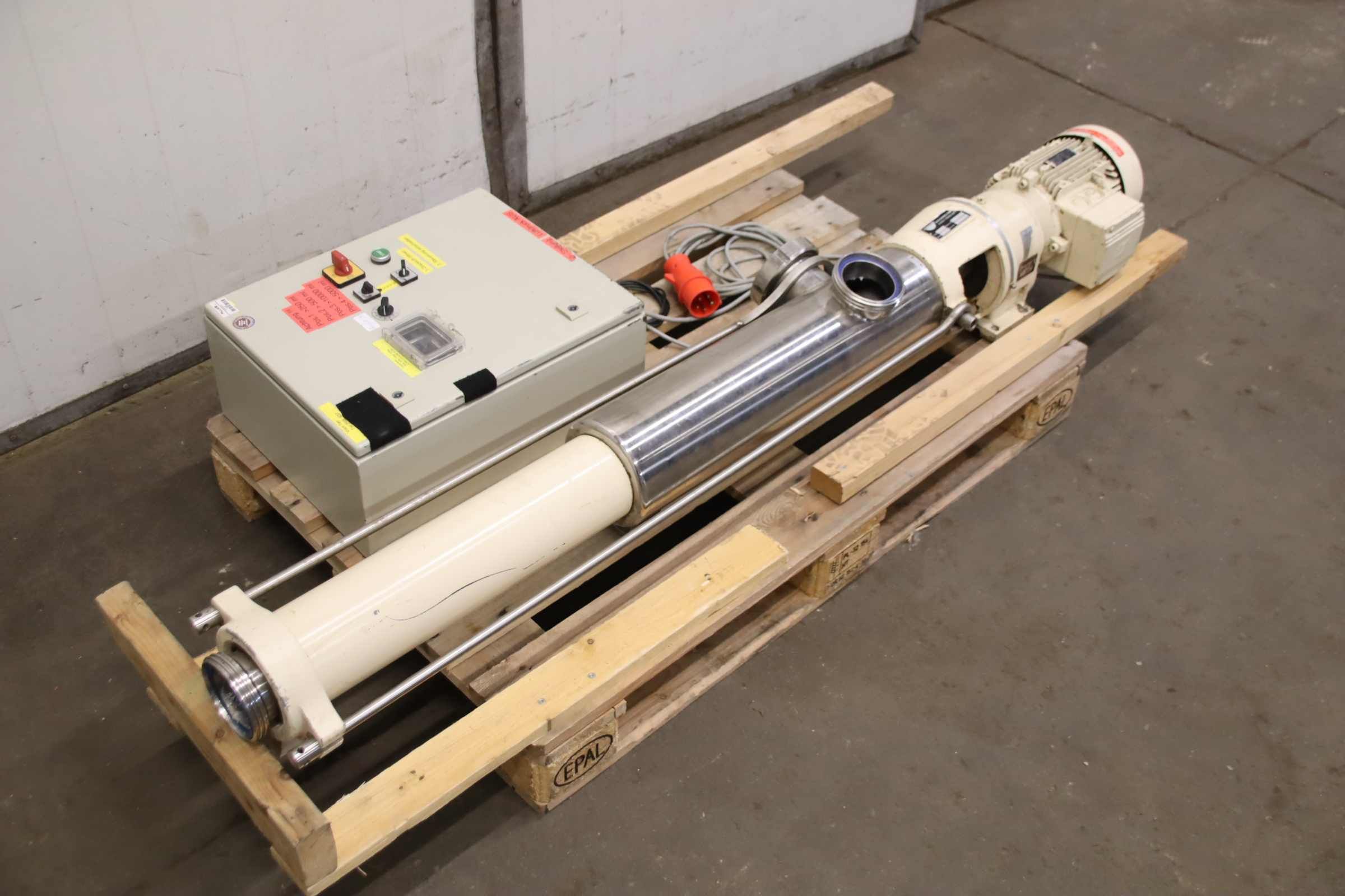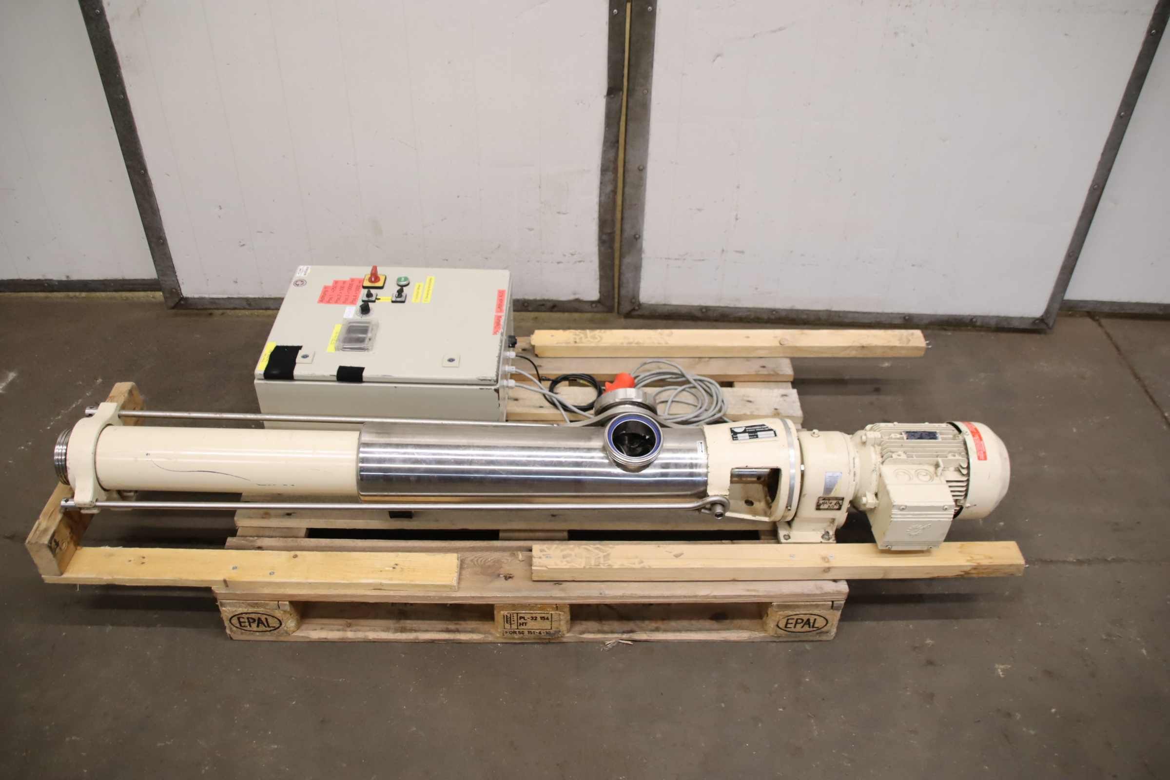 Mono pump, metering pump, high-pressure pump, water pump, screw pump, progressive cavity pump, transport screw, screw conveyor, conveying technology, tubular screw conveyor, metering screw, screw metering -Manufacturer: Resch, dosing screw type RBL50D -Dosage: stepless, with frequency-controlled operation -Drive motor: 2.2 kW -Dosing control: Ströter Speed Commander Vector Digital -Inlet/outlet opening: Ø 80 mm, see photos -Usage: The pump was used to dispense ultrasound gel -Transport dimensions: 1810/730/H270 mm -Weight: 152 kg