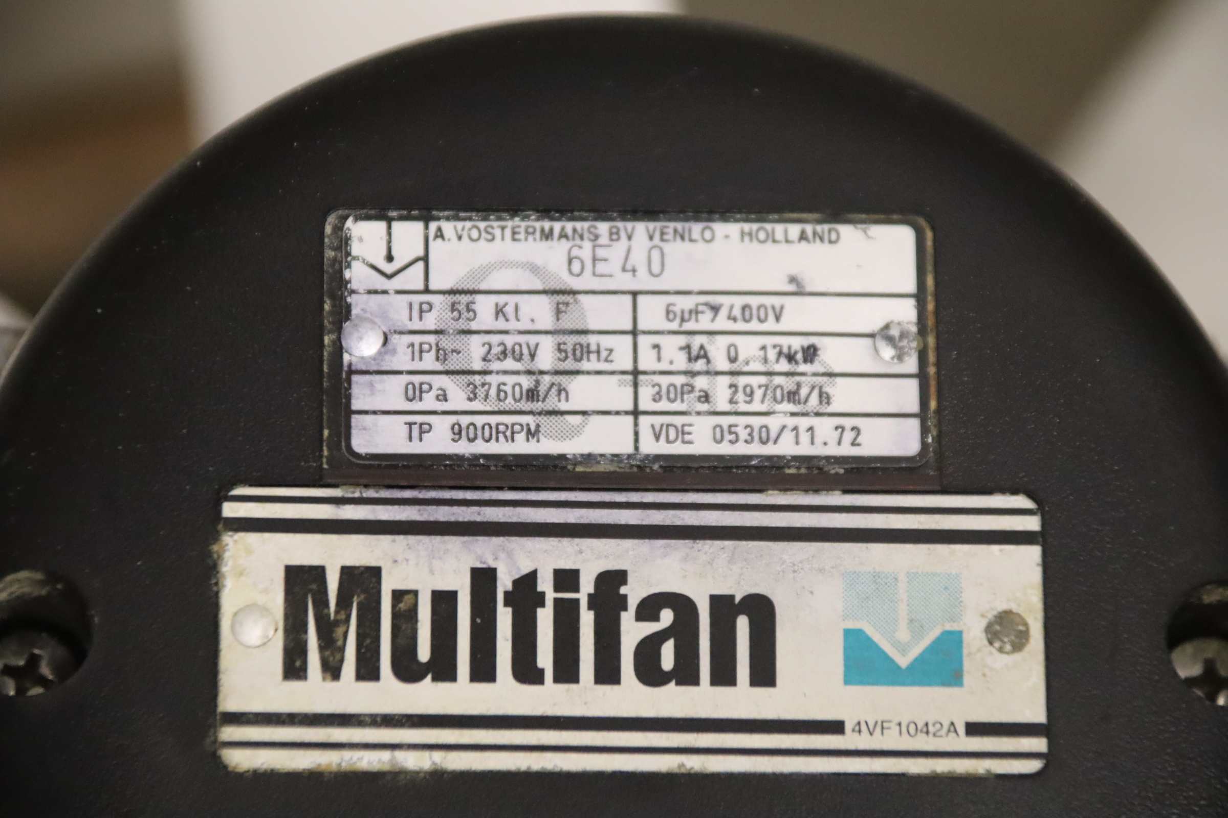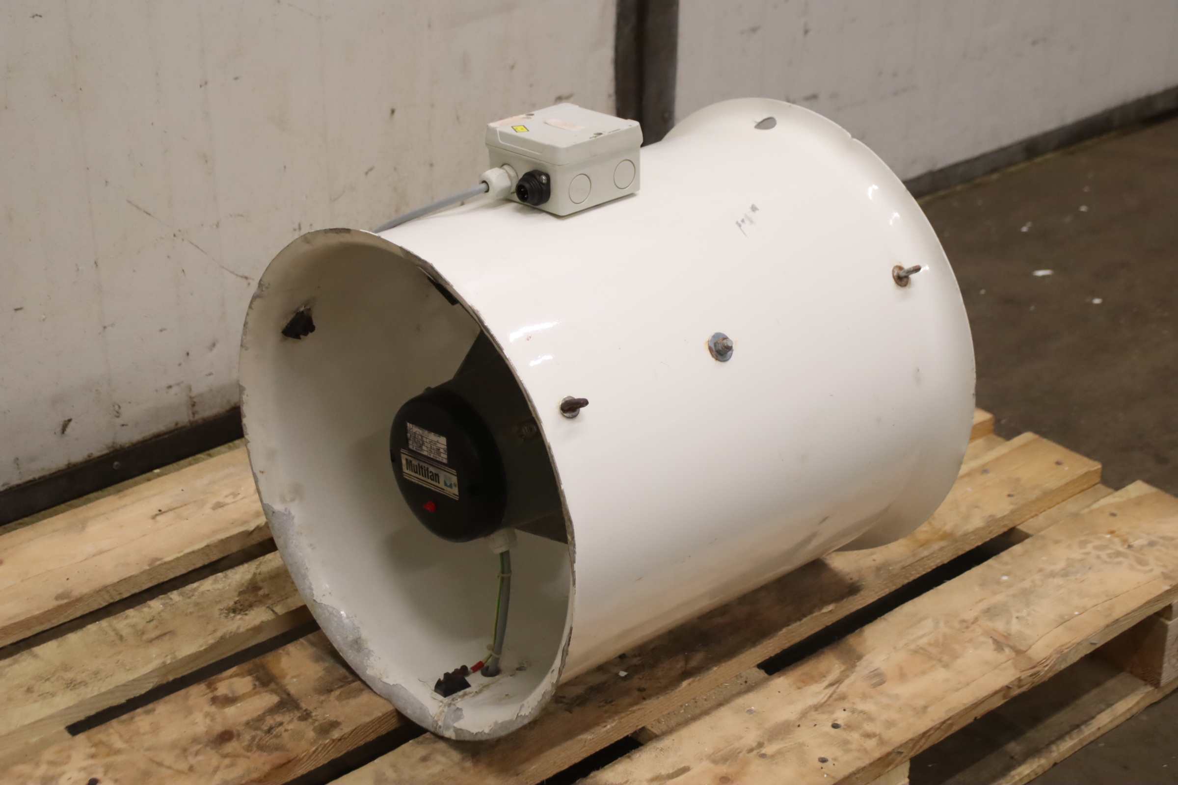 Fan, blower, electric motor, blower, emergency ventilation fan, flue gas fan, axial fan, axial ventilator, axial fan, axial ventilator, suction fan, high-performance axial fan, stable fan -Manufacturer: Multifan, Axial fan, Duct fan type 6E40 -Motor: 0.17 kW 900 rpm -Flow rate: 3760 m³/h -Protection class: IP 55 -Number: 1x fan available -Dimensions: 500/450/H480 mm -Weight: 10 kg