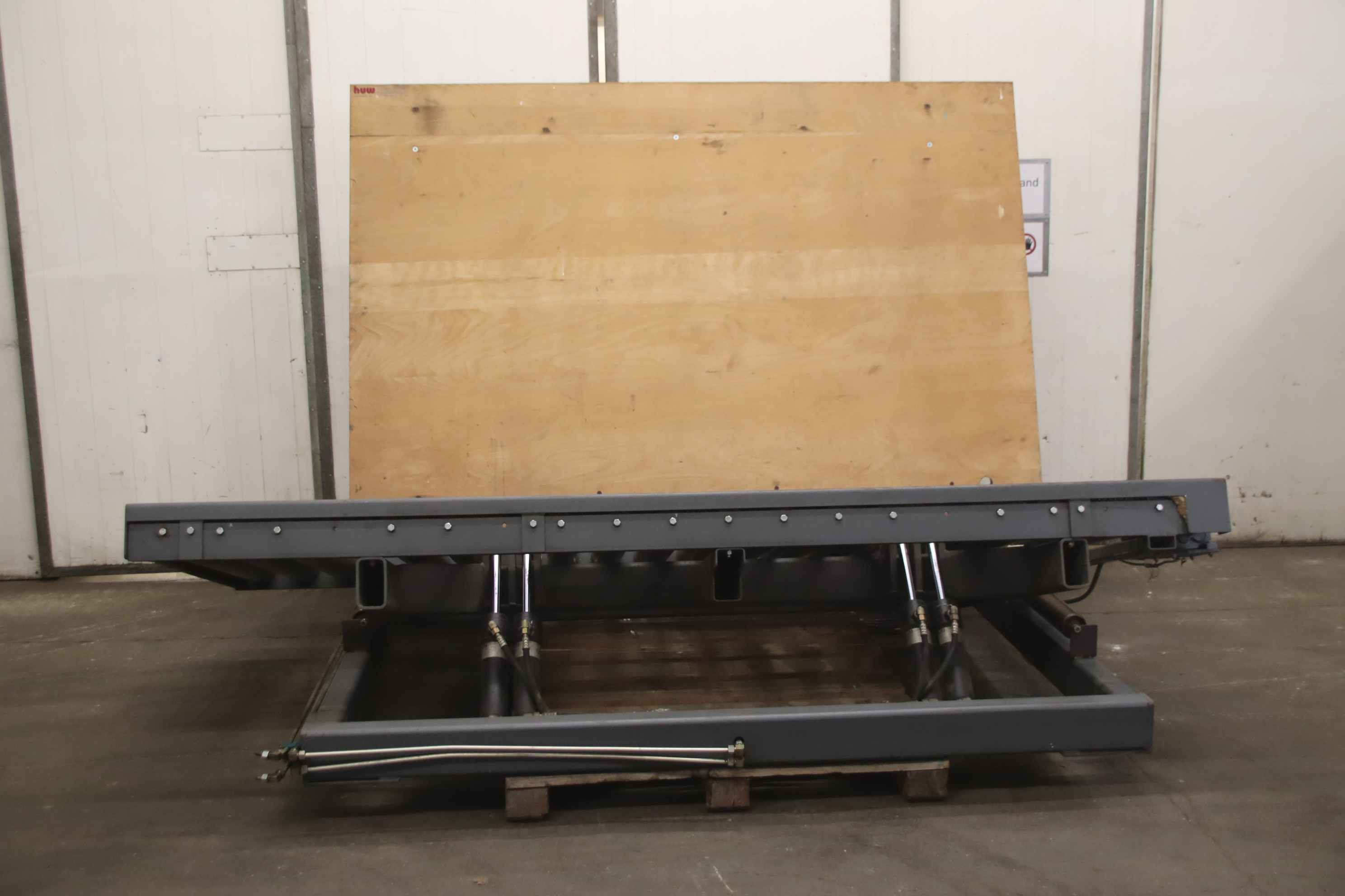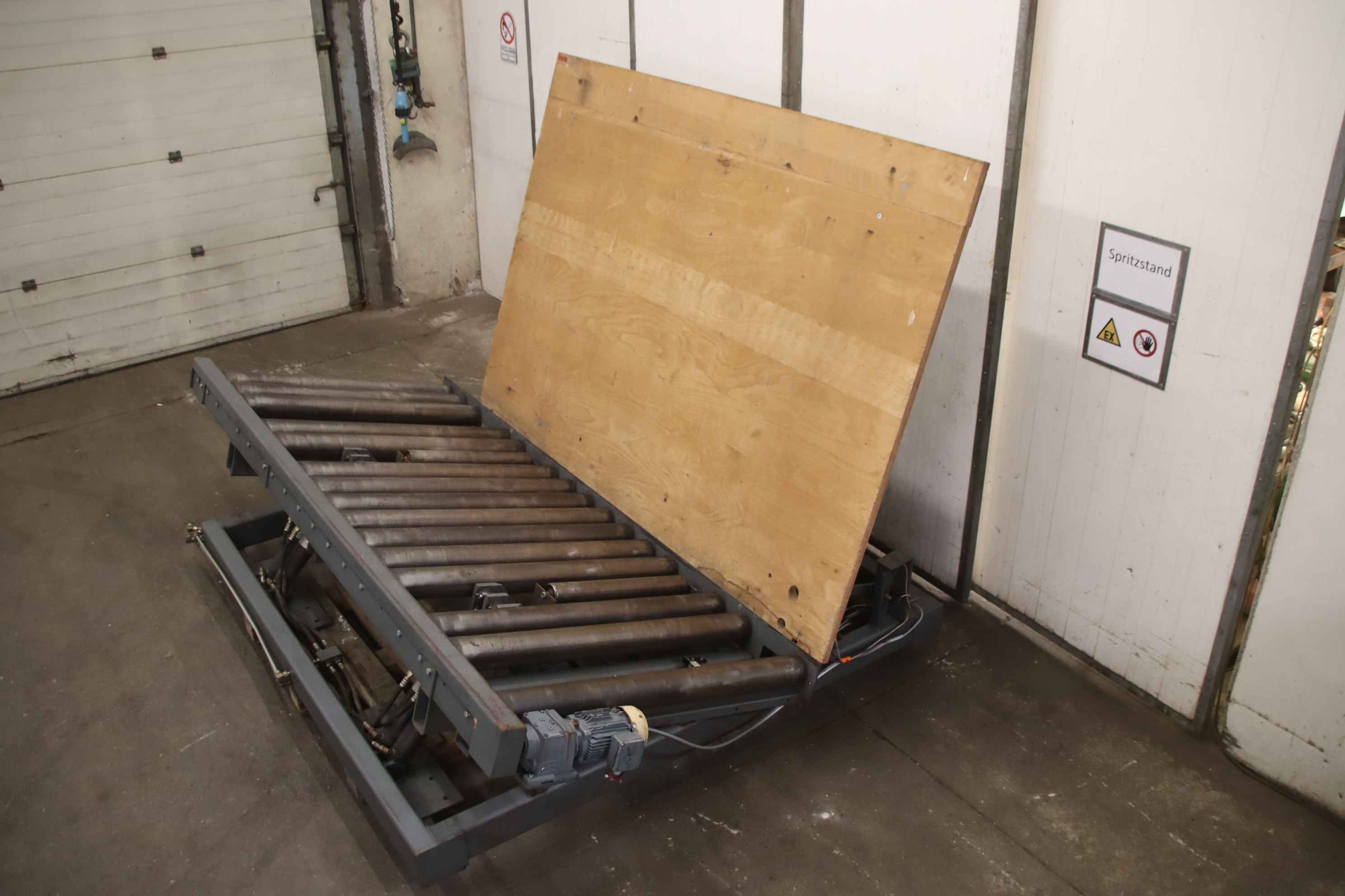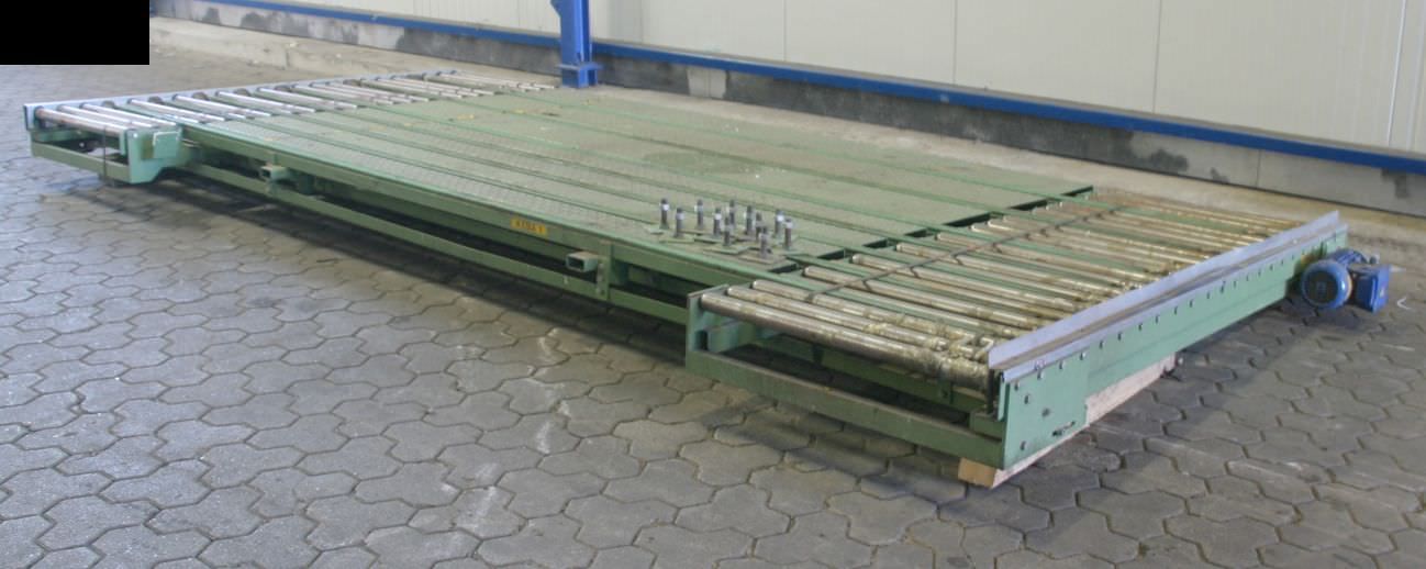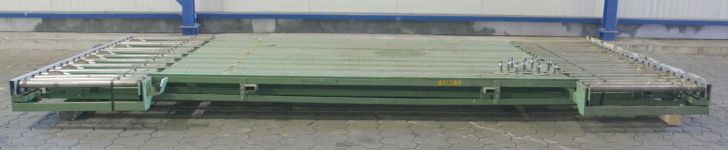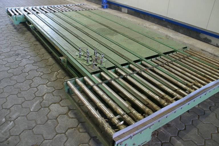 roller conveyor, roller track, driven roller conveyor, roller conveyor -Roller conveyor: with tilting function, solid design -Speed: 14 m/min -Roll width: 1200 mm -Roll diameter: 108 mm -Axle distance: 150 mm -Conveyor length: approx. 2800 mm -Tilt function: hydraulic, approx. 20° -Total dimensions: 3100/2300/H2000 mm -Weight: 1390 kg
