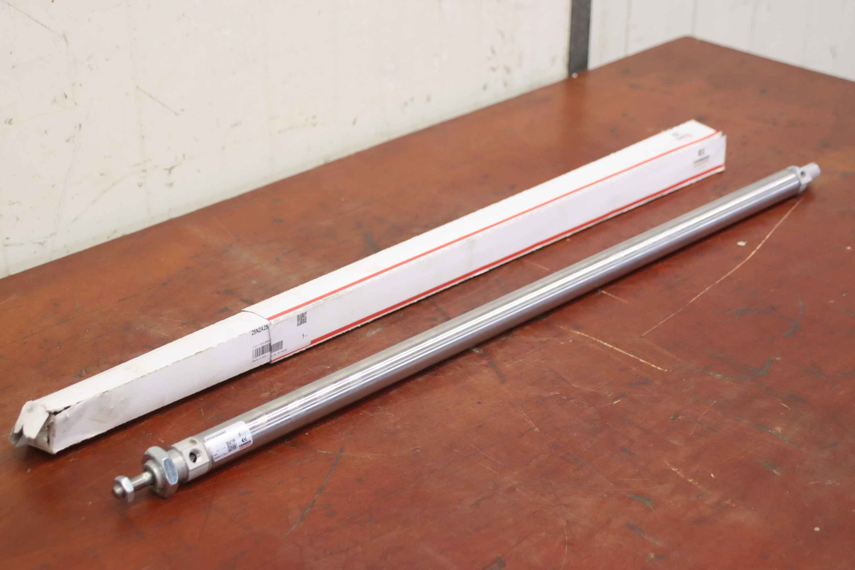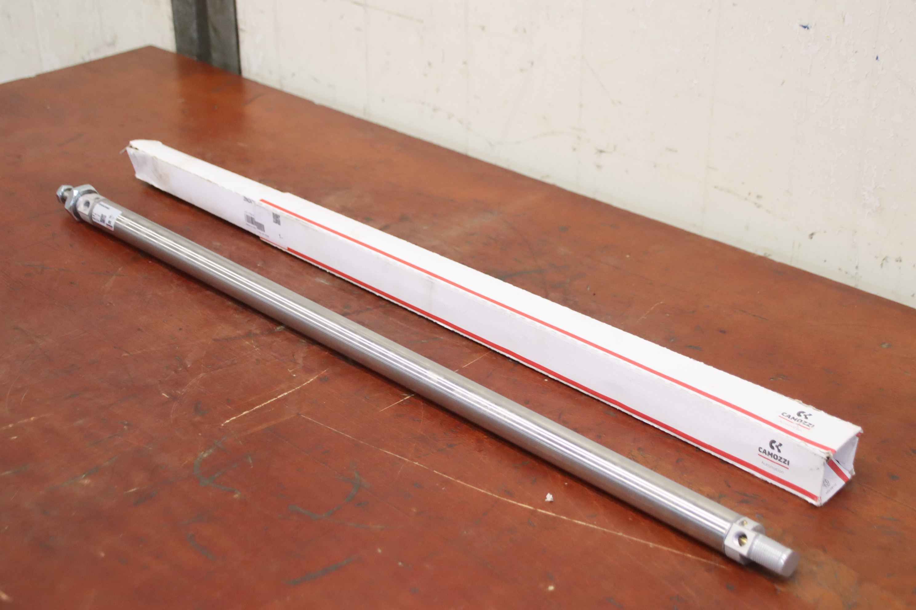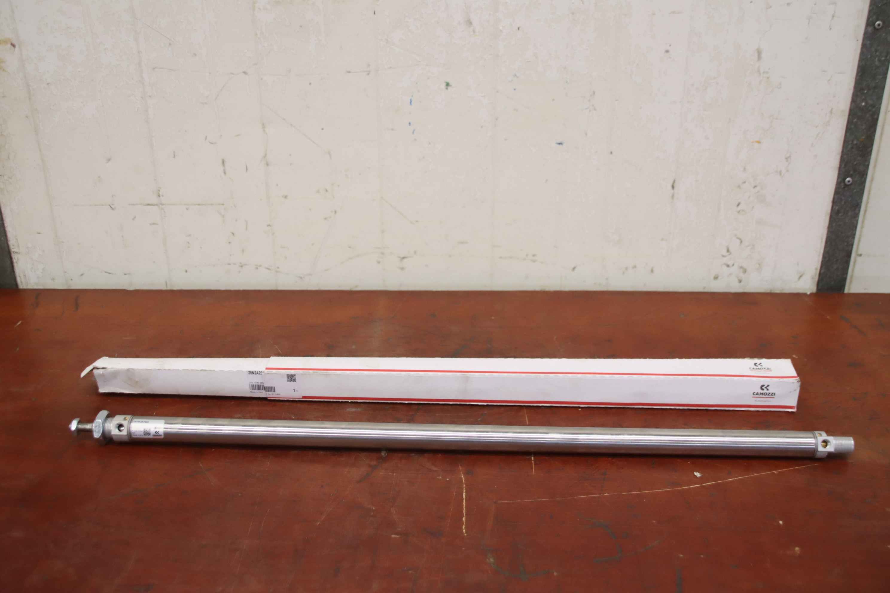 Pneumatic cylinder, air cylinder, pneumatic stamp, air stamp, standard cylinder-Manufacturer: Camozzi, pneumatic cylinder type 25N2A25A660 unused Ovp-Stroke: 660 mm-Piston: Ø 25mm-Piston rod: Ø 10 mm-Number: 2x cylinders available-Price per piece-Dimensions: Ø 27 x 800 mm-Weight: 1.0 kg/piece