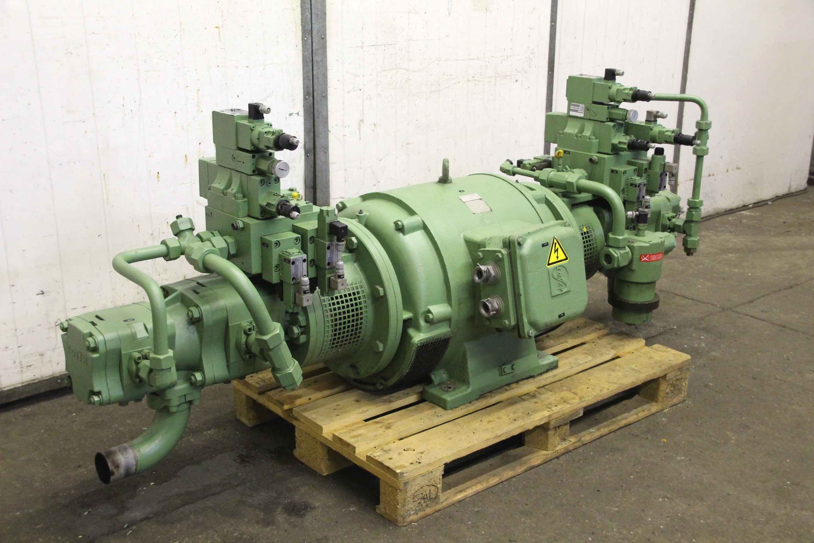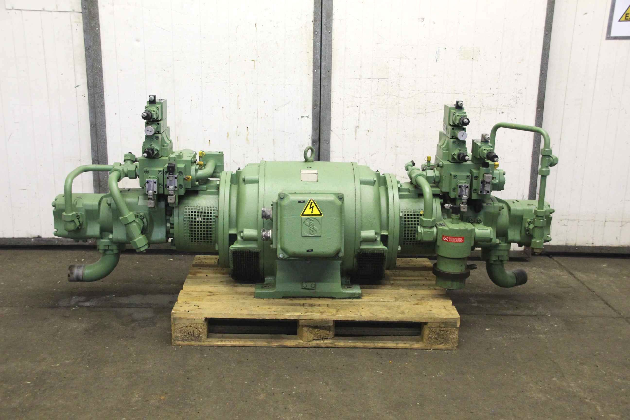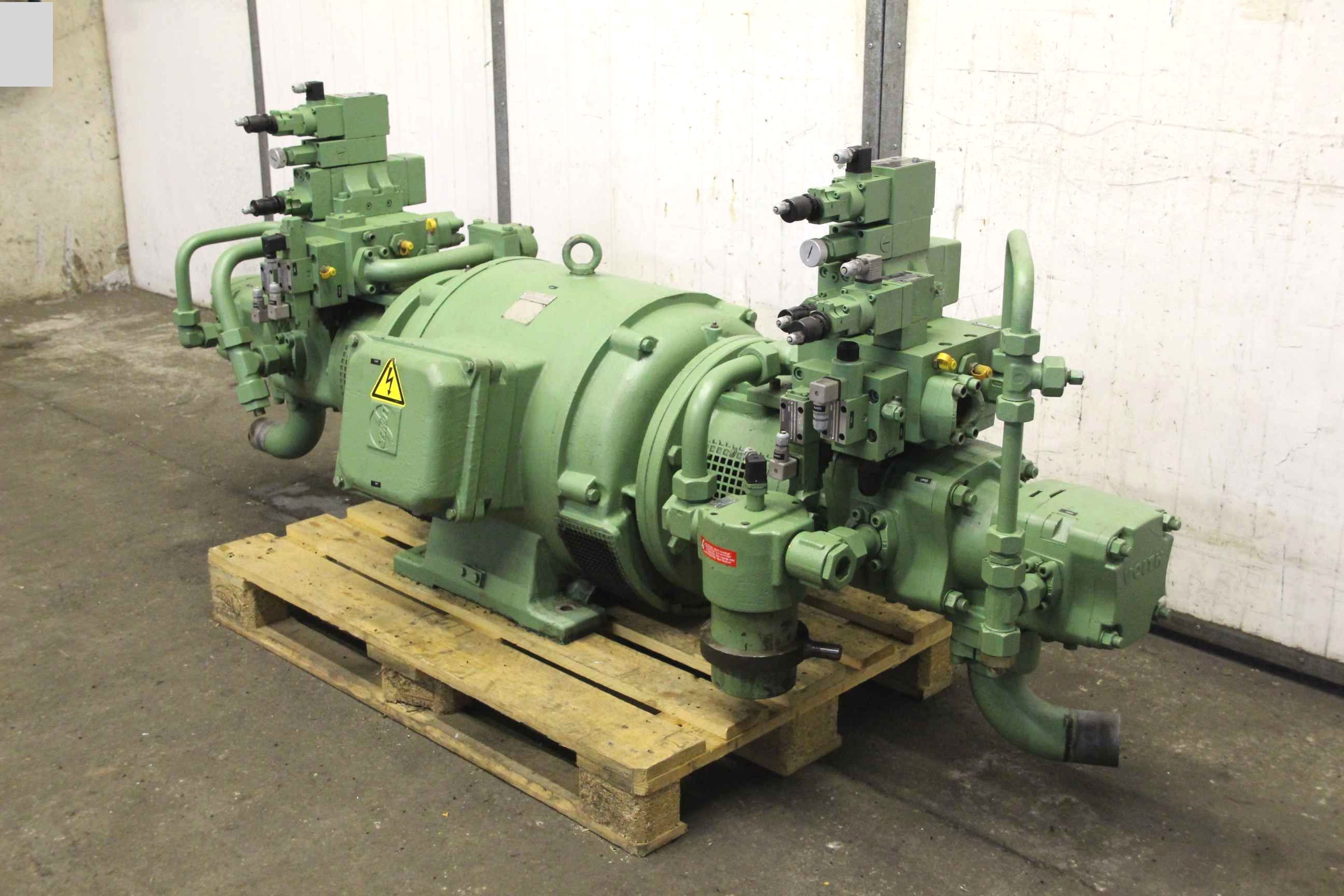 Hydraulic pump, oil pump, gear pump, vane pump, hydraulic power unit, double hydraulic pump -Double hydraulic pump: from KHS Krauss Maffei KM 1000-5000A injection molding machine -Pump 1: Voith type IPH 6/5-125/50 300 bar -Pump 2: Voith type IPR/H 6/5-125/40 210/300 bar -Drive: Loher 75 kW 1500 rpm -Individual components: filters/valves, see photos -Dimensions: 2285/800/H900 mm -Weight: 1132 kg