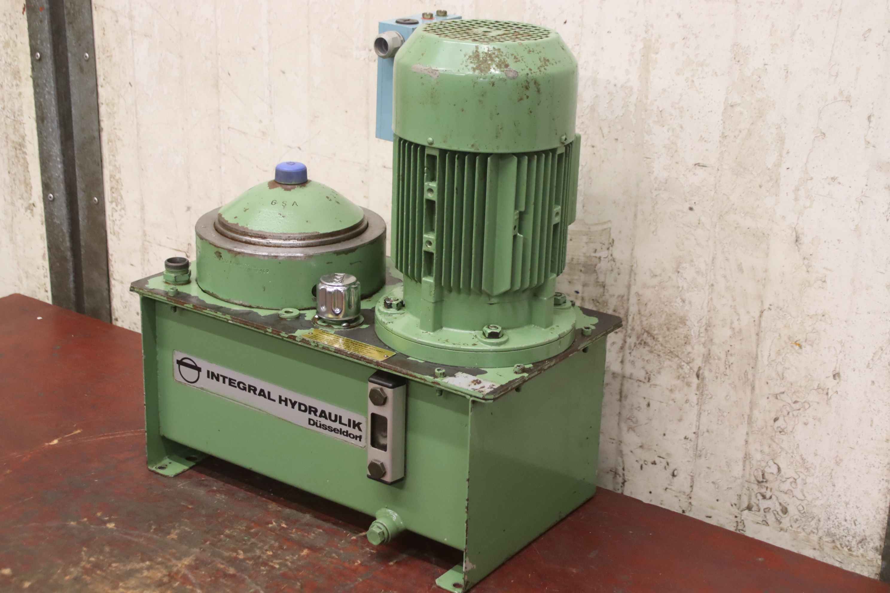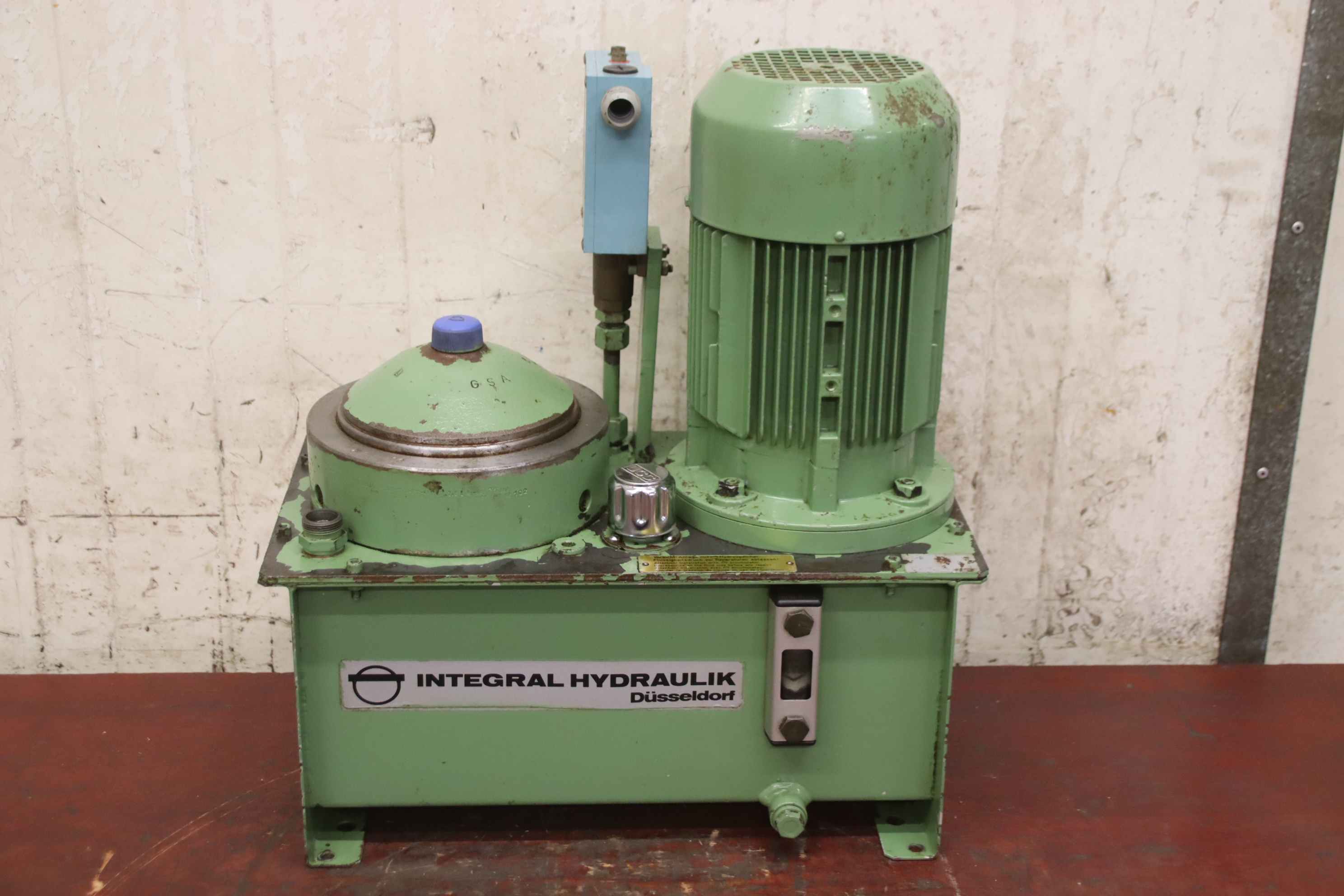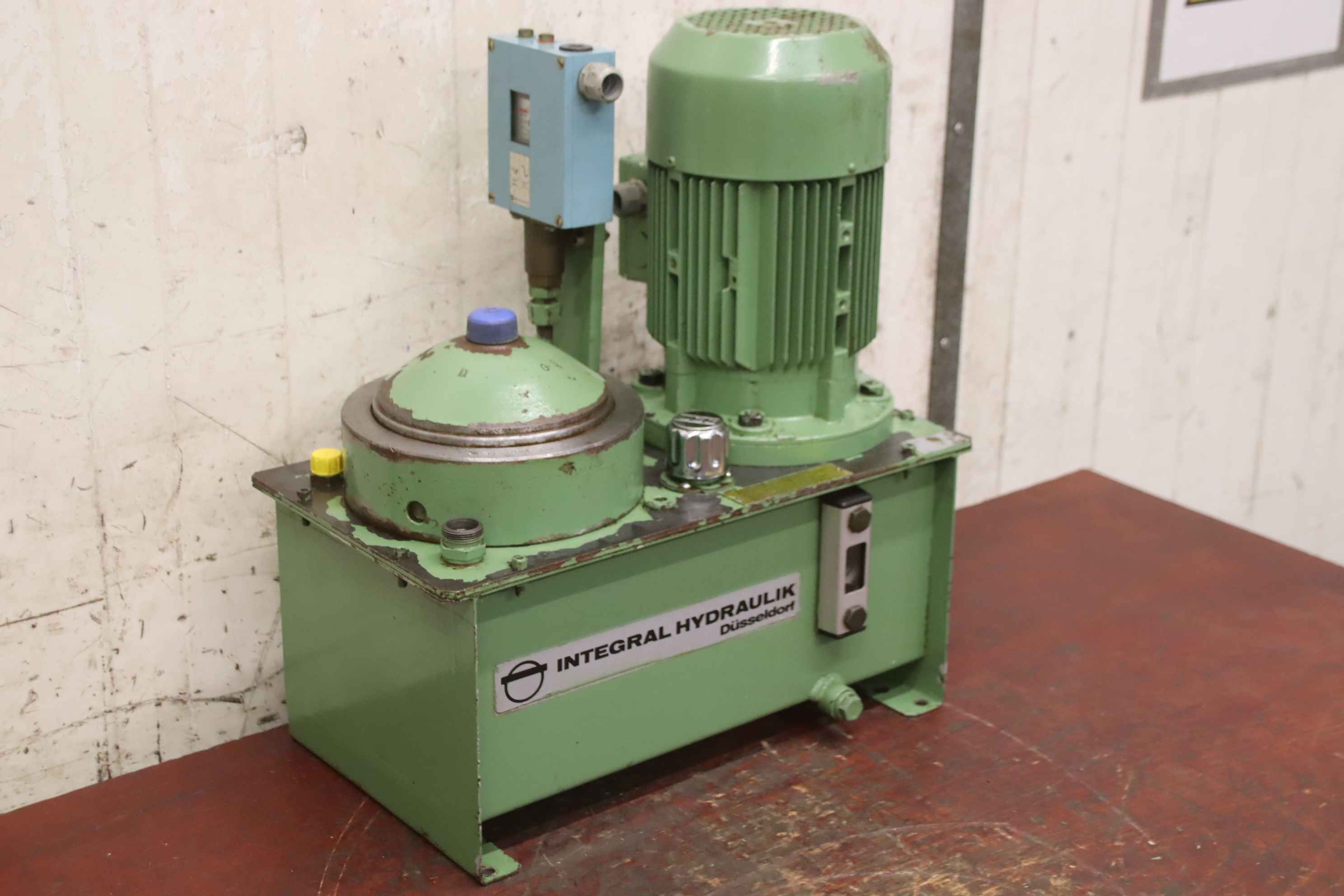Hydraulic power unit, hydraulic pump, universal power unit, hydraulic station -Manufacturer: Integral Hydraulik, hydraulic power unit with pressure switch -Pressure: up to 30 bar -Flow rate: 6 l/min -Pressure switch: Telemecanique XMG-B140 -Hydraulic reservoir: with pressure accumulator and level indicator -Individual components: see photos -Dimensions: 465/260/H510 mm -Weight: 48 kg