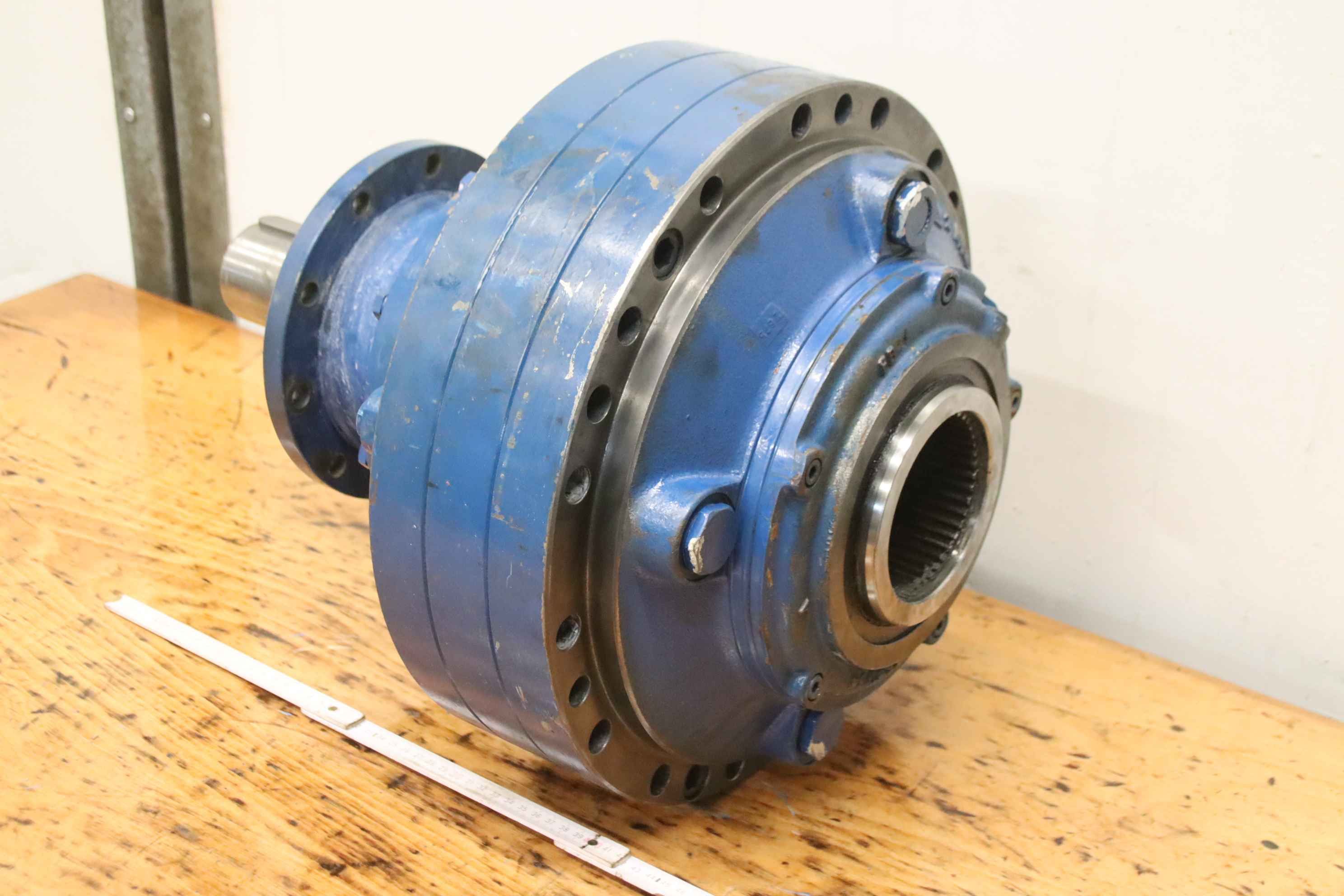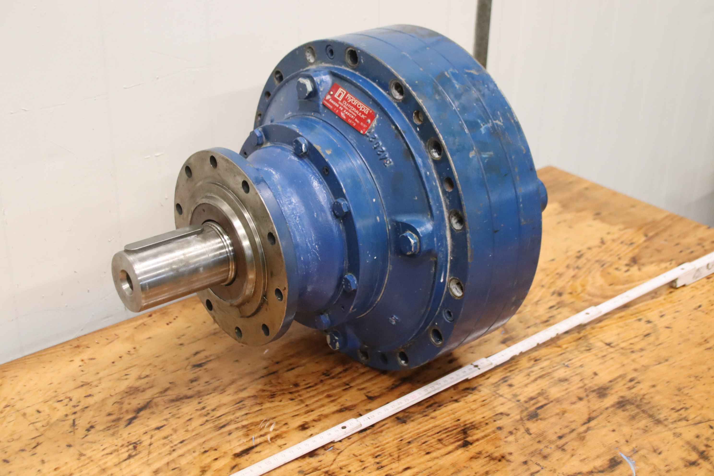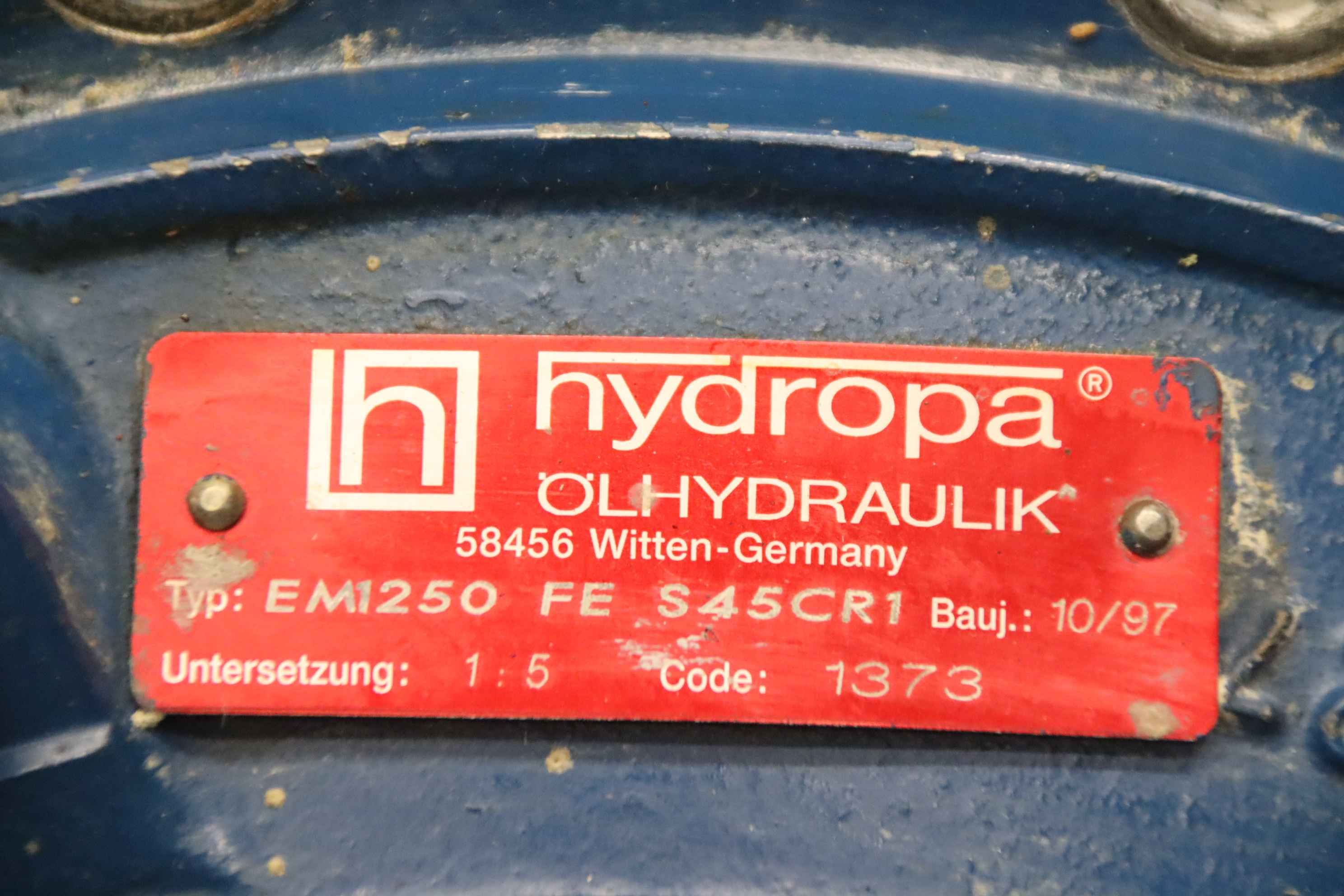 Planetary gearbox, gearbox, gearbox for hydraulic motor, hydraulic motor, oil motor, hydraulic pump, hydraulic gear motor, -Manufacturer: Hydropa, gearbox for hydraulic motor -Type: EM1250 FE S45CR1 -Reduction ratio: 1 : 5 -Shaft: Ø65 x 105 mm -Hole shaft: Ø 100 / 94 mm -Number: 2x gearboxes available -Price: per piece -Dimensions: Ø 400 x 500 mm -Weight: 133 kg/piece