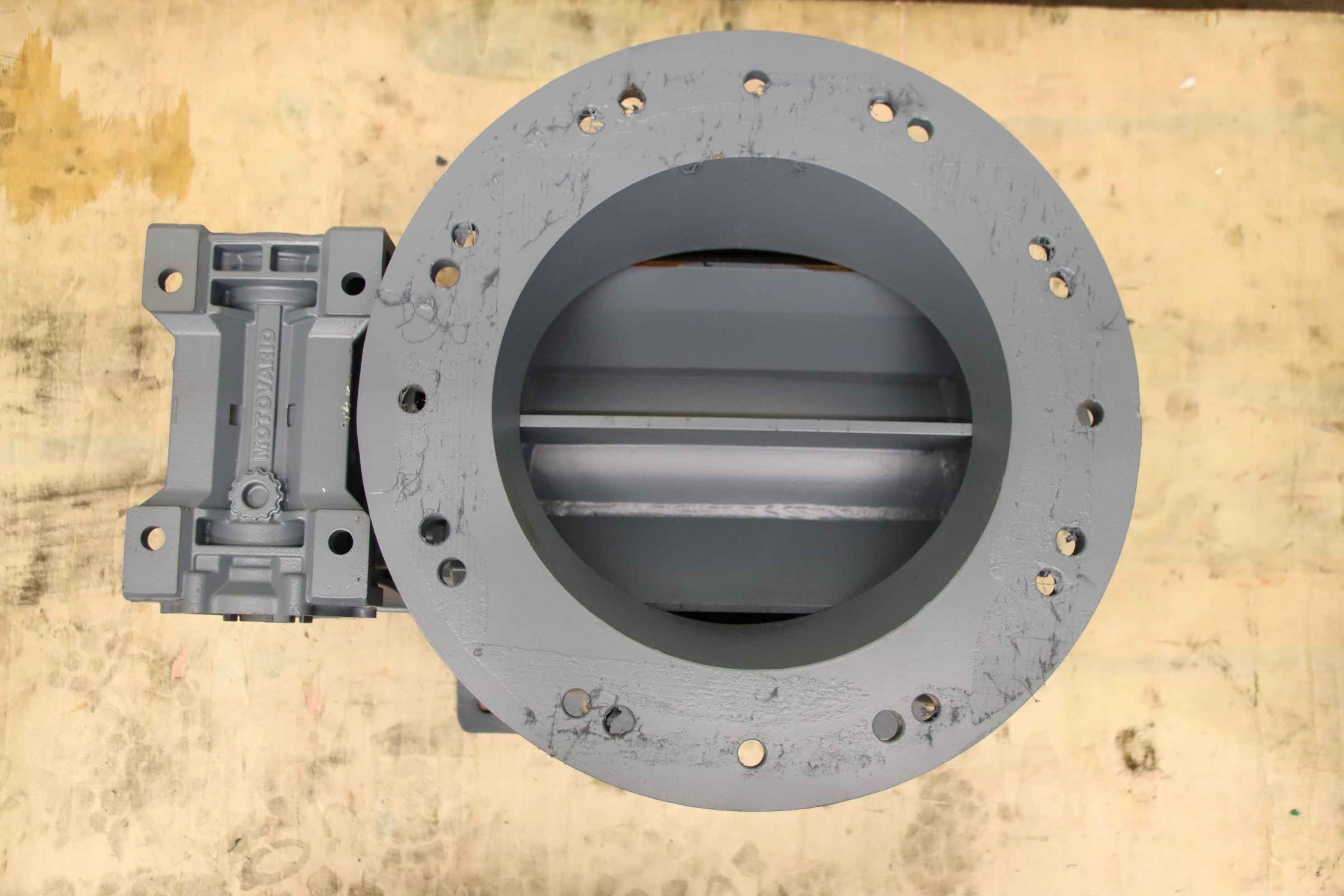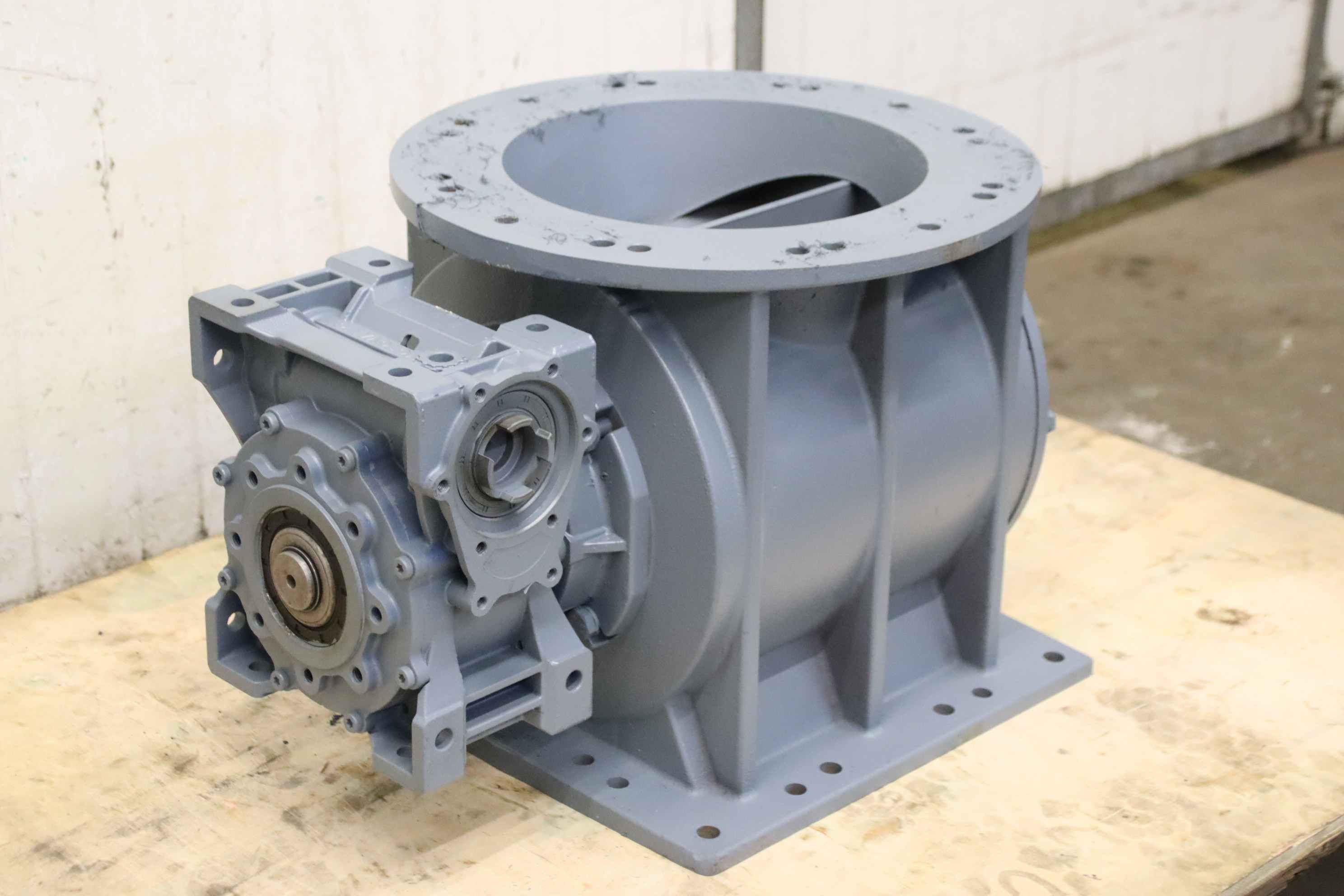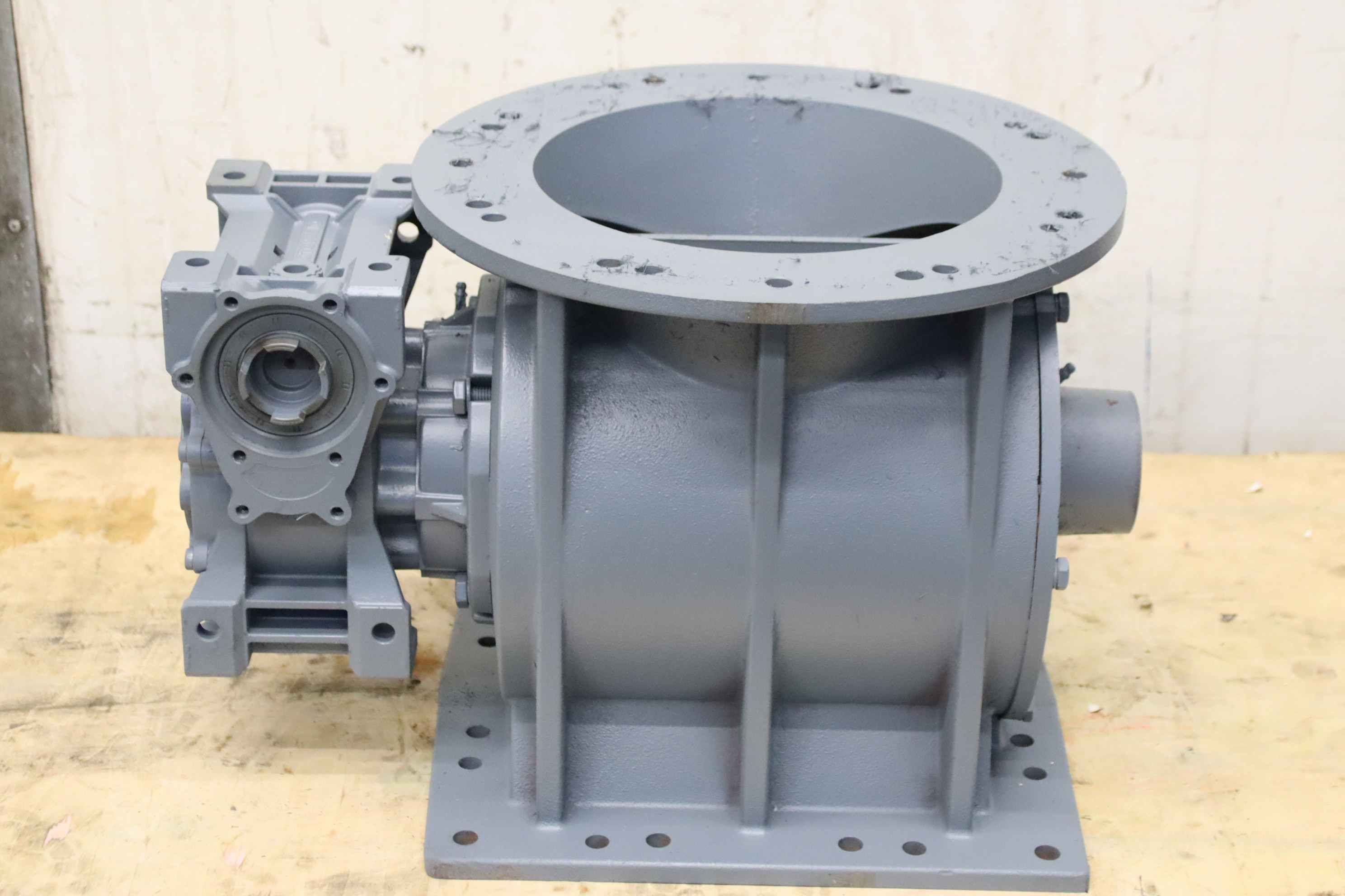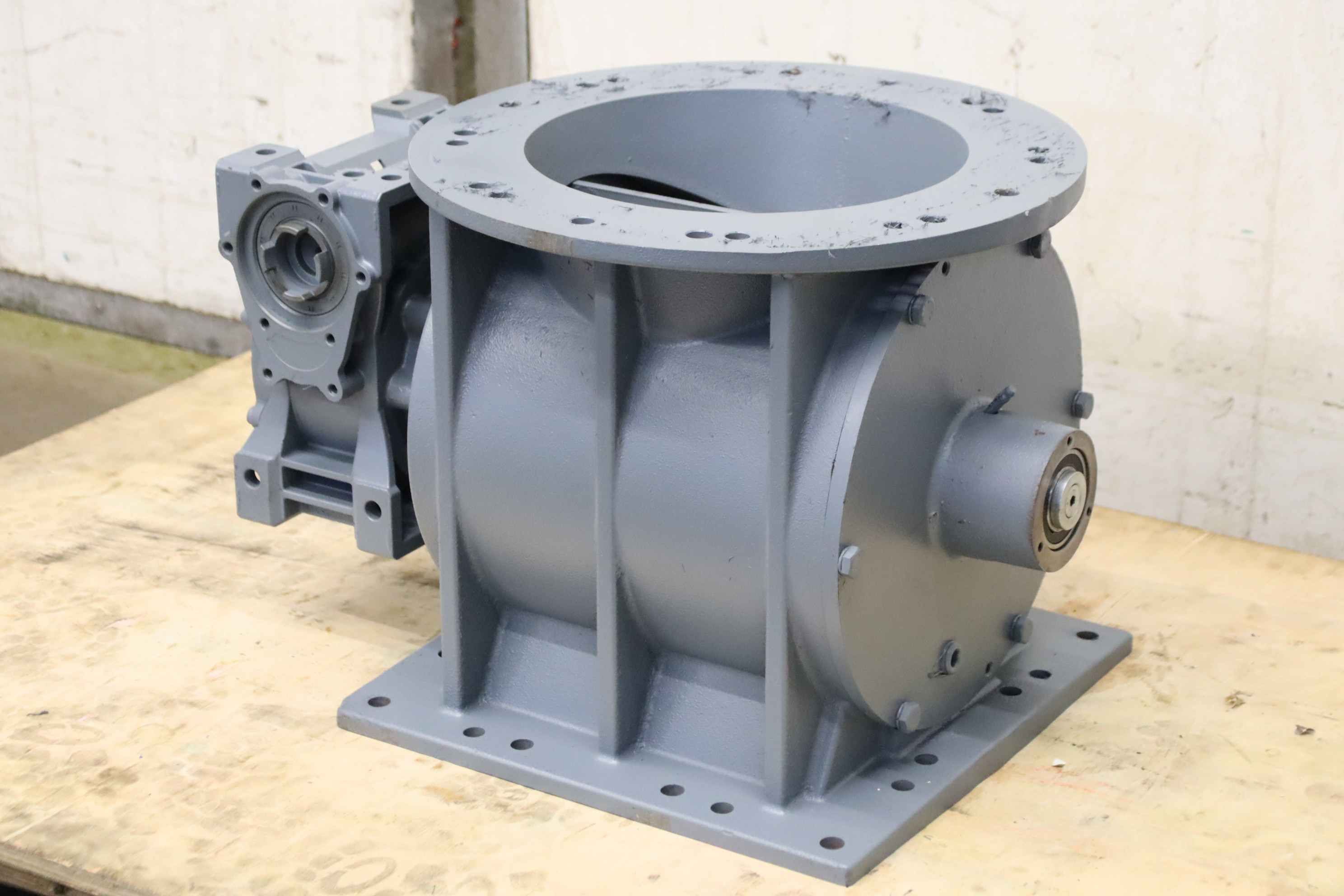 Dosing rotary valve, rotary valve, dosing lock, rotary valve for conveyor screw, transport screw, screw conveyor, conveyor technology, pipe conveyor screw-Manufacturer: Torex, 8-blade rotary valve with gear-Inlet opening: Ø 265 mm-Outlet: 250 x 245 mm-Transmission: Motovario i= 50-Drive shaft: see photos for dimensions-Dimensions: 540/410/H360 mm-Weight: 100 kg