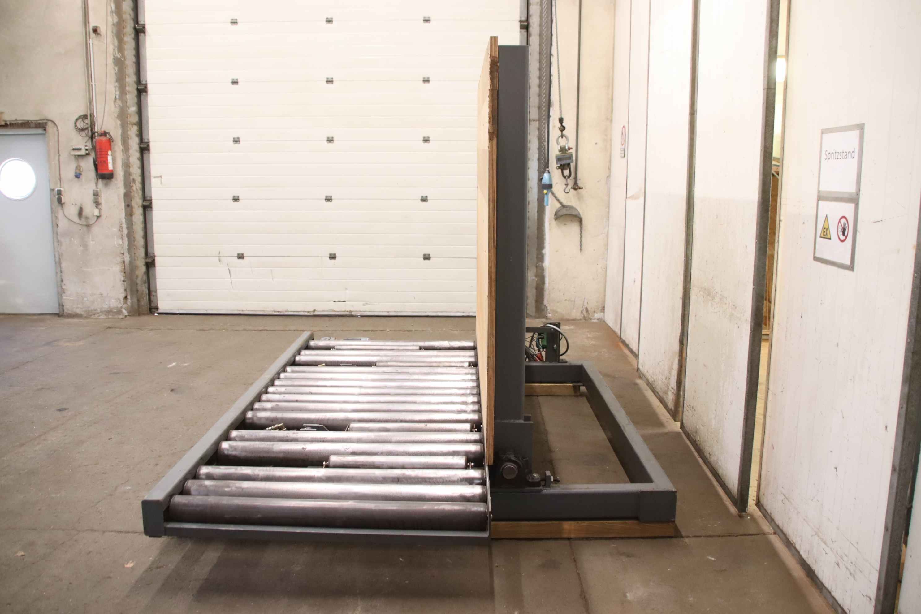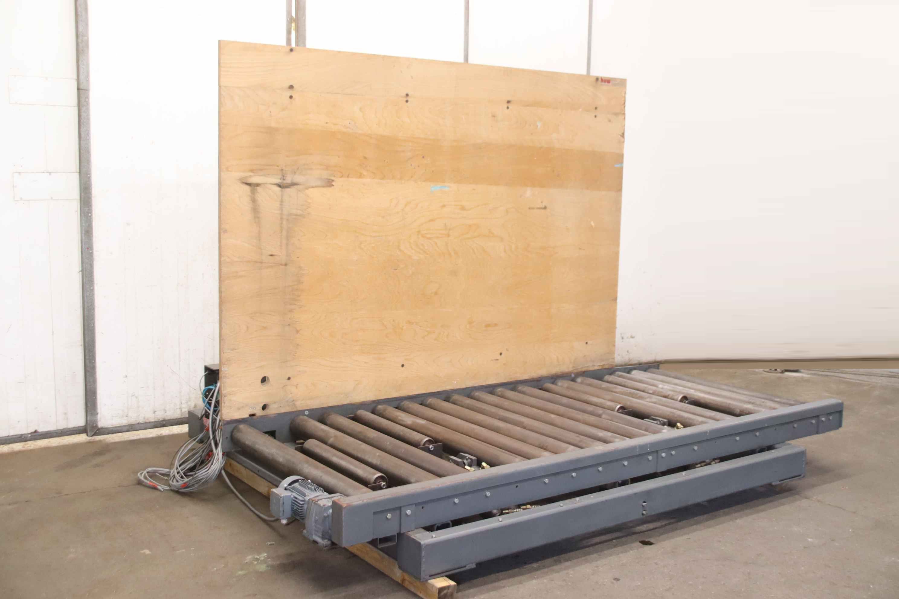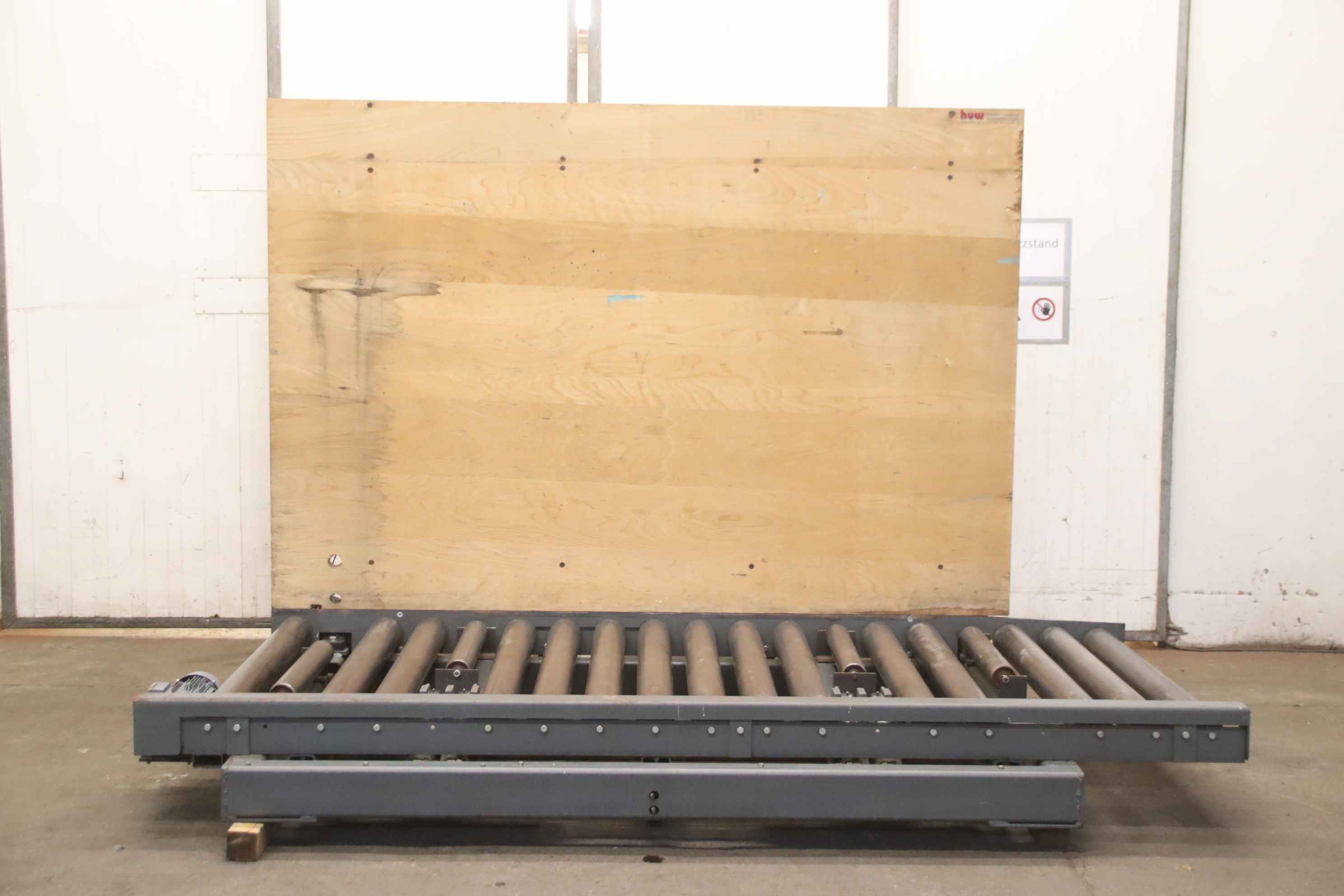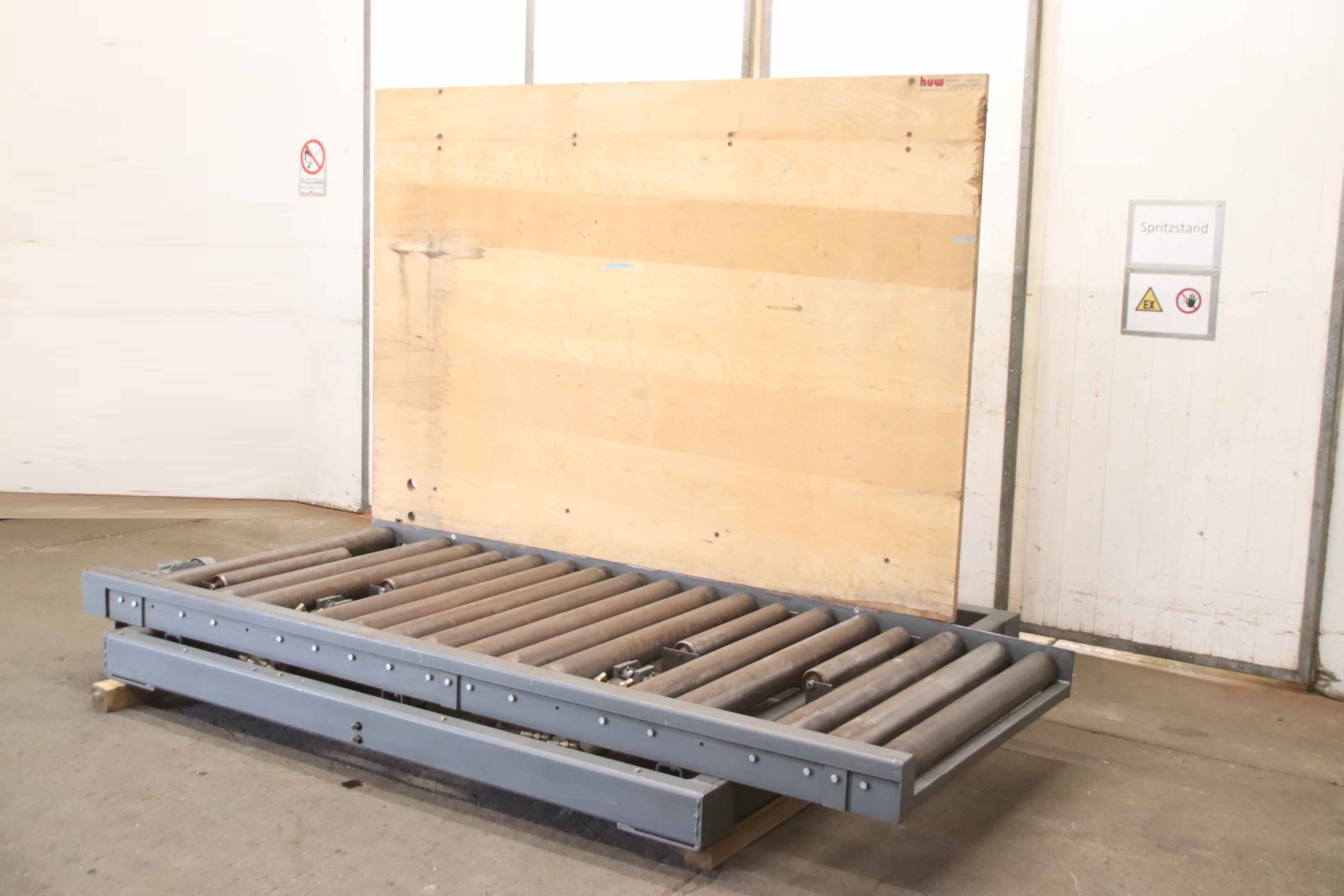 roller conveyor, roller track, driven roller conveyor, roller conveyor-Roller conveyor: with tilting function, without hydraulic unit-Drive motor: kW rpm-Speed: 14 m/min-Roll width: 1200 mm-Roll diameter: 110 mm-Axle distance: 150 mm-Conveyor length: 2800 mm-Tilt function: hydraulic, approx. 20°-Wooden board: 2500 x 1700 mm-Total dimensions: 3100/2300/H2000 mm-Weight: 1180 kg