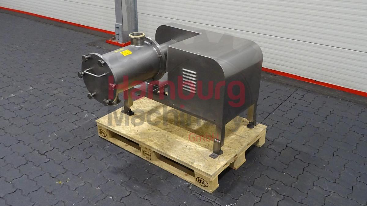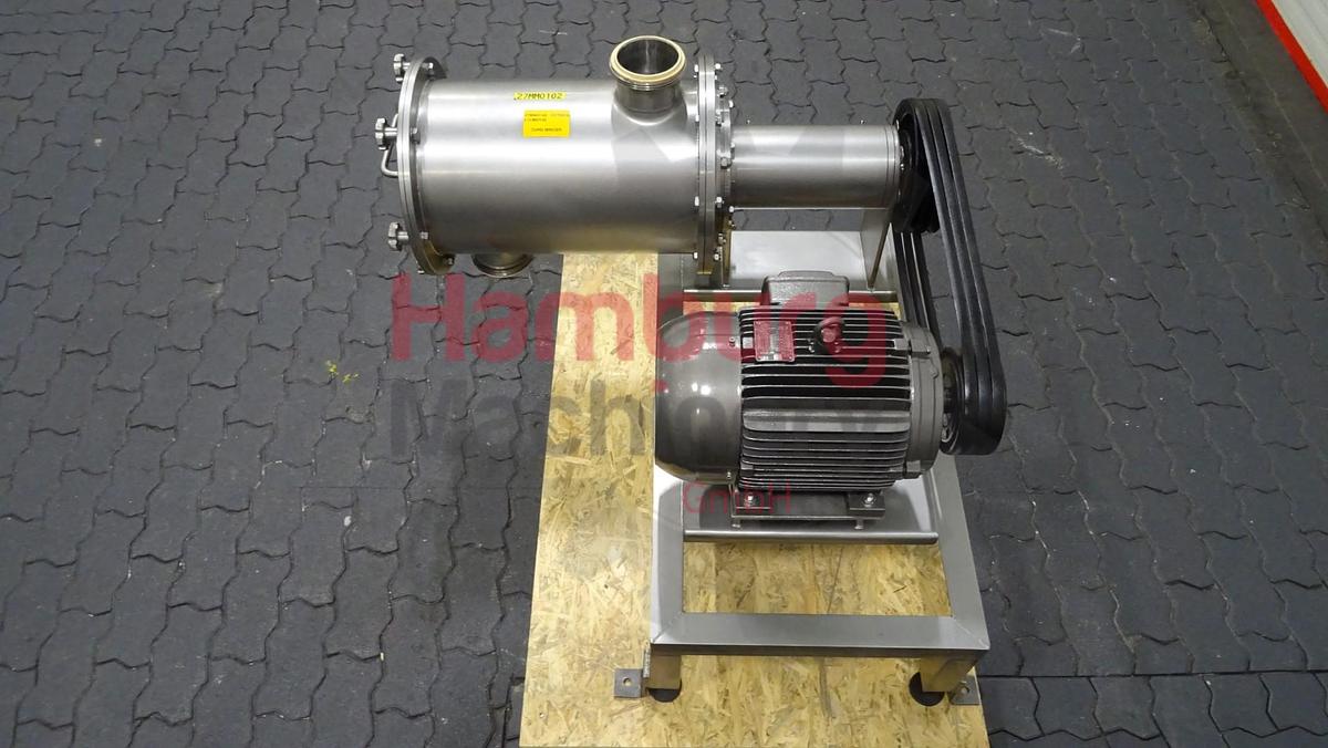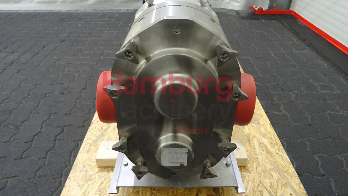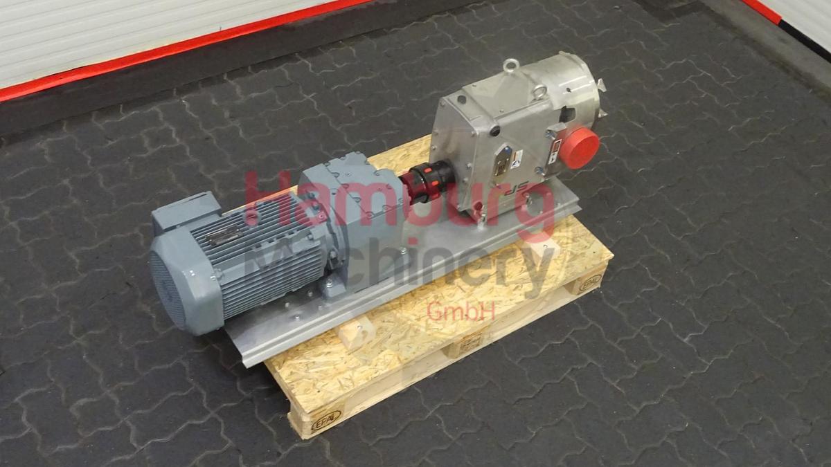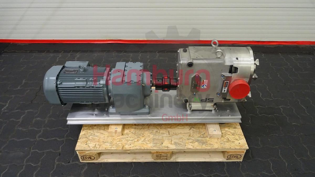 The SPX Waukesha Cherry-Burrell 220 U1 is a rotary positive displacement pump which can handle dairy products (e.g., yoghurt, quark, curd and butter), solids (e.g., cherries and olives), slurries, pastes, and a variety of liquids. If wetted, they offer self-priming performance. A gentle pumping action minimizes product degradation. They also offer continuous and intermittent reversible flows and can operate dry for brief periods of time. Flow is relatively independent of changes in process pressure to, so output is relatively constant and continuous. Duo - twin wing stainless steel lobes. Nominal displacement: 1,976 liter per revolution. Maximum nominal capacity: 70,4 m3/h. Inlet connection: 3. Outlet connection: 3. Maximum product pressure: 13,8 bar Maximum pump speed: 600 rpm. The pump is used in a dairy for product pumping. The current motor with this pump is 7,5 kW - 1.445 rpm - 400 ...