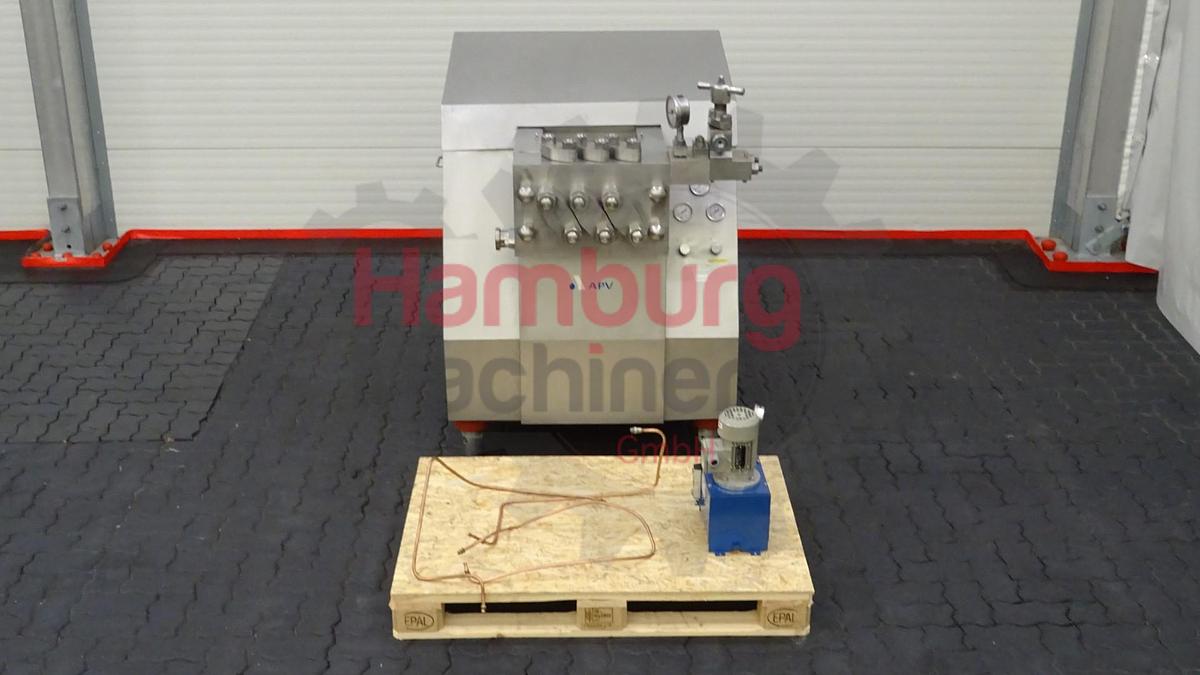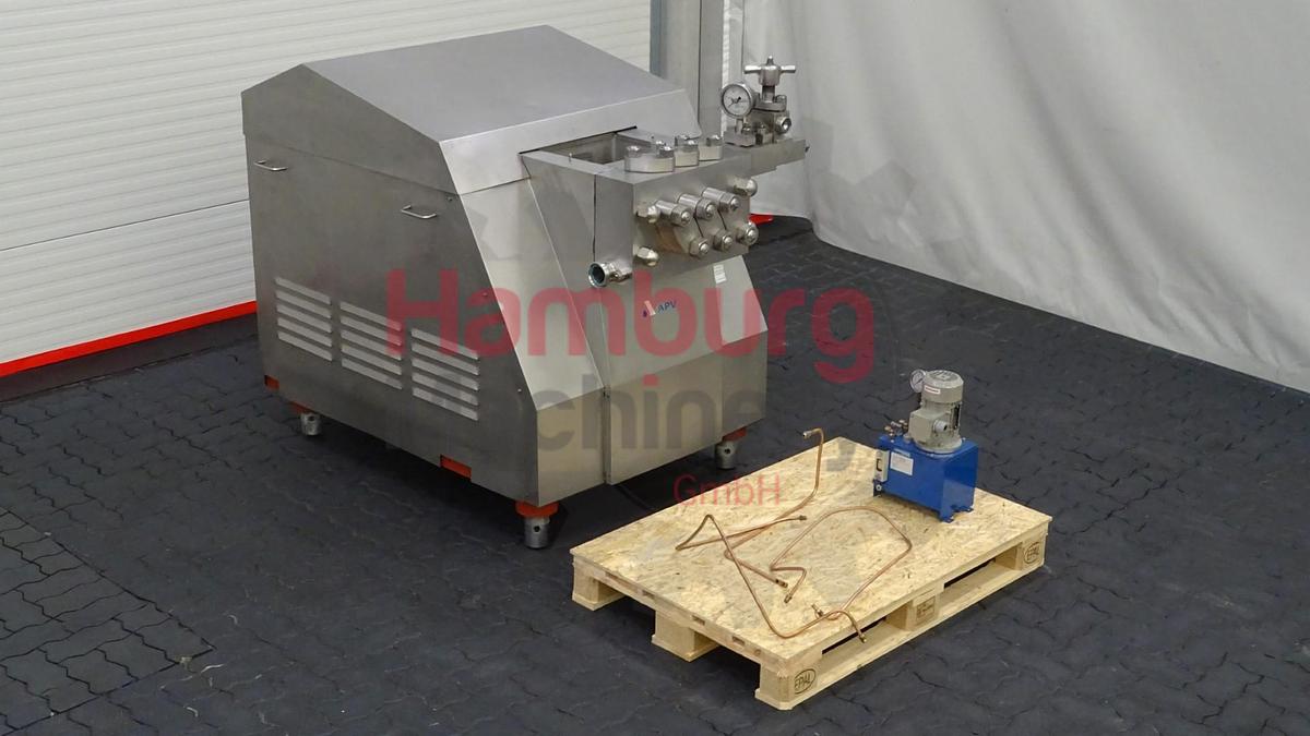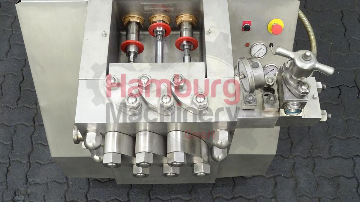 This APV Gaulin 264 MC 15-8TBS homogeniser is a 3-cylinder machine which is designed for 1.000 liter per hour with a maximum pressure of 500 bar. The homogensier is equipped with 2-stages with ball valve cylinder, 1 stage hydraulic controlled, 1 stage manual controlled. Manometer. Motor: 22 kW - 380 V - 44 Amp - 50 Hz - 1.465 rpm. Stainless steel cladded. Oil pumping system outside the machine., Type of Machine: Homogeniser, Capacity: 1.000 liter per hour, Stages: 2 Stages, Max. Pressure: 500 bar, Valve cylinder: Ball valves, Product: Dairy, Piston diameter: 51 mm, Motor: 22 kW - 380 V - 44 Amp - 50 Hz - 1.465 rpm, Dimensions: 180 x 110 x 180 cm, Weight: 2.115 kg