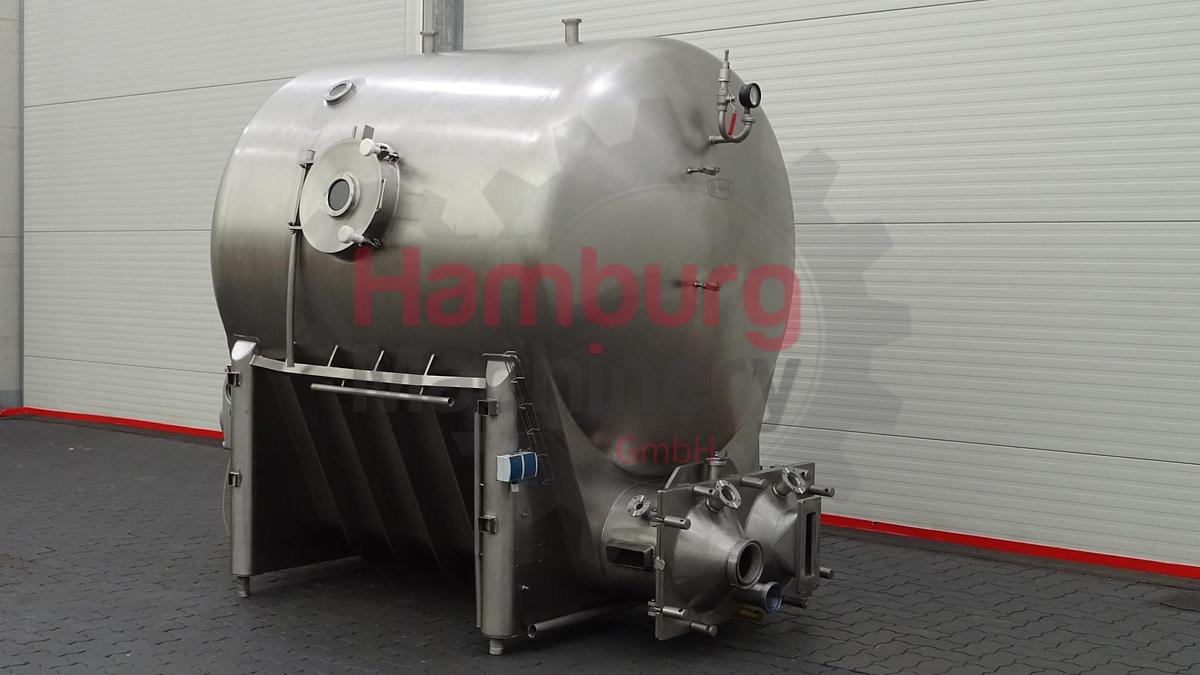 Closed stainless steel butter silo. Single jacketed. Vacuum on the silo is possible (manometer 0 / - 1,0 Bar). The horizontal buffer silo is equipped with 2 augers (driven by 1 main motor of +/- 3 kW - 380 V - 50 Hz - 1.420 rpm - n2: 14 rpm, no nametag on motor, only on drivework). Total capacity: 3.000 kg. Manhole, round, on one side and a sight glass on the same side. 1x infeed possibilities for direct connection of the outfeed pipe from a Continuous Butter Machine (CBM) on the back side and one on the side of the QHK butter silo (DN100). CIP cleanable with spraybowl in the top. Outfeed plate with 1x rectangular flange and 1x round DN100 flange on the outfeed of the silo. Excluding control panel or outfeed butterpumps., Type of Machine: Buttersilo, Capacity: 3.000 kg, Motor: +/- 3 kW - 380 V - 50 Hz - 1.420 rpm - n2: 14 rpm, Dimensions: ± 275 x 200 x 225 cm, Weight: ± 1.500 kg