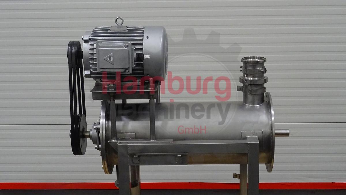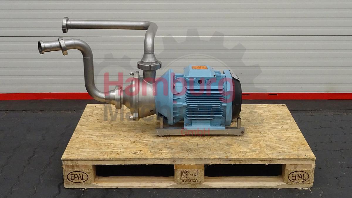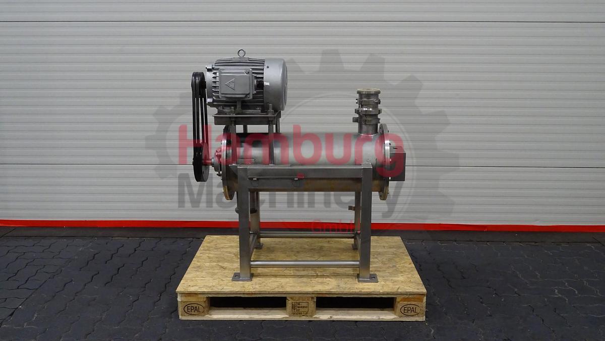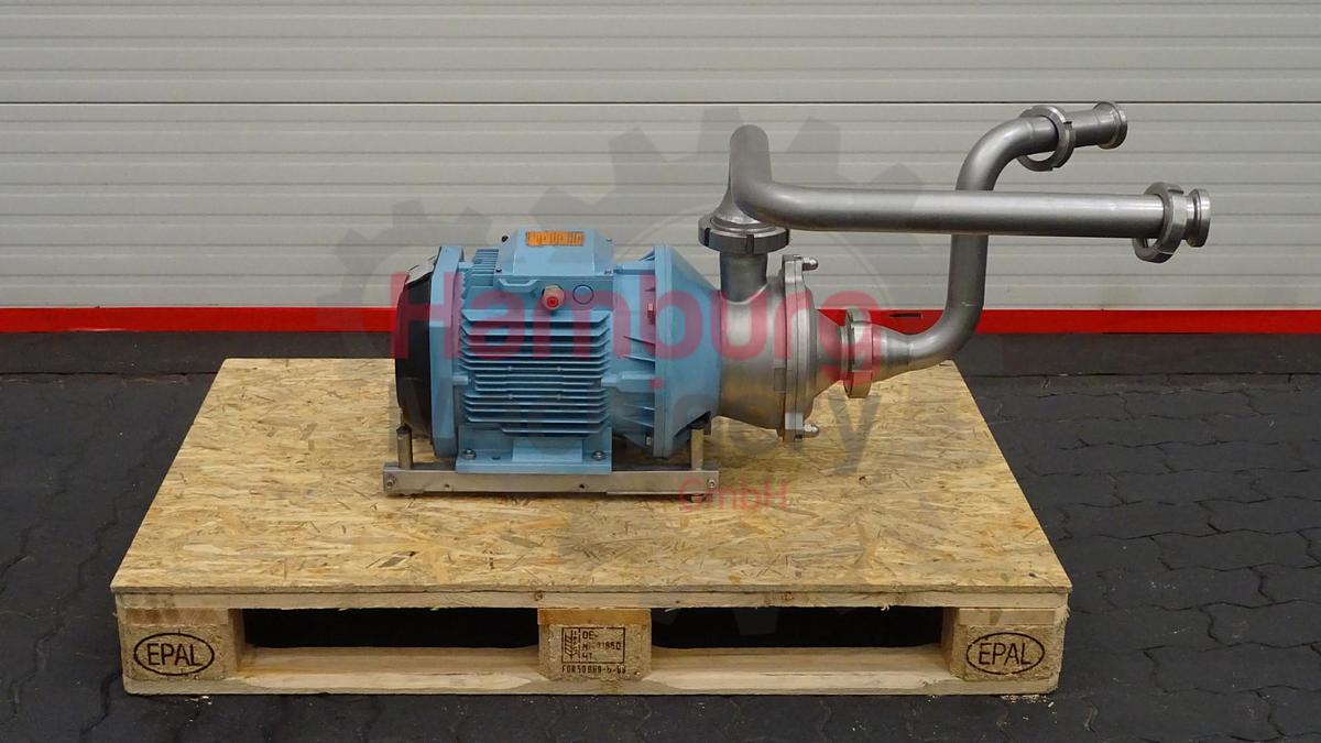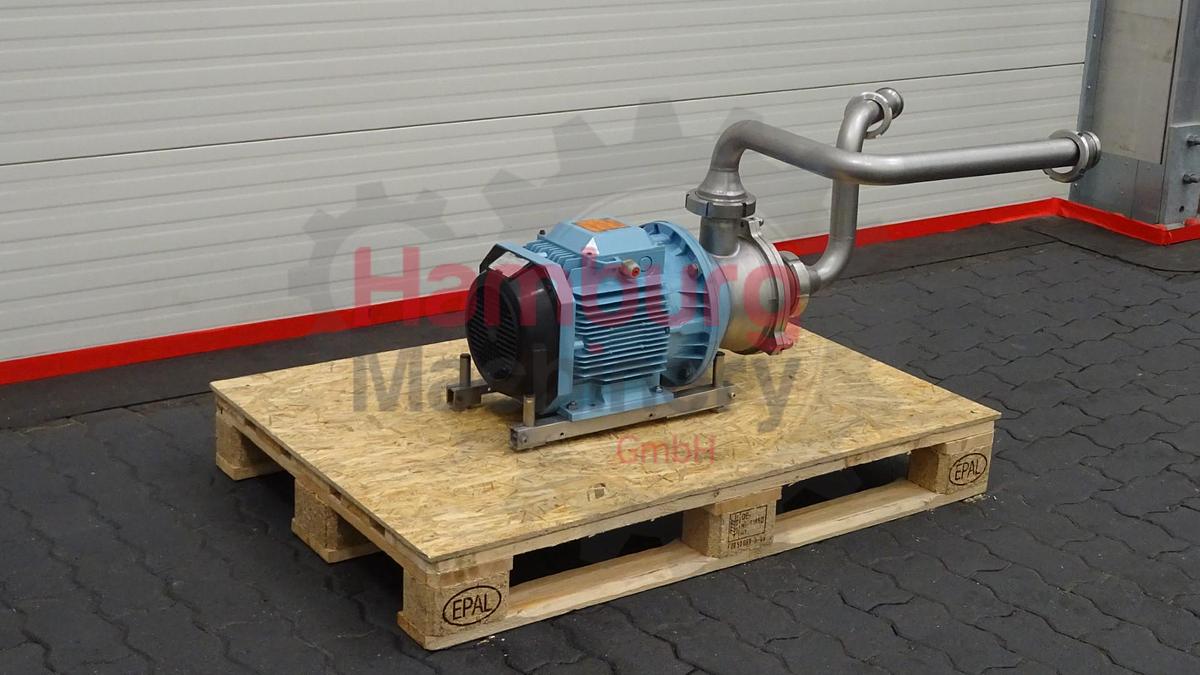 The Alfa Laval MR-200 Sanitary Self Priming Liquid-ring Pump is a pump specially designed for food, chemical, pharmaceutical and other industries where acid-resistant steel is resistant to the products to be pumped. All products wetted parts, i.e. pump casing, casing cover and impeller are made of acid-resistant steel AlSl 316. Clamp screws and legs are made of stainless steel AlSl 304. lntermediate part is in cast iron which is zinc coated and laquered making it highly corrosion resistant. Motor: 7,5 kW - 380/420 V - 50 Hz - 1.450 rpm - 15,3 A. Impeller diameter: 199 mm. Connections on the inlet / outlet: SMS 76 mm (3). Current maximum capacity (based on the available Alfa Laval performance curves and the current motor): 48.000 ltr/h @ 0 Bar., Type of Machine: Sanitary Self Priming Liquid-ring Pump, Stock Number: 1511, Diameter of the impellor: 199 mm, Motor: 7,5 kW - 380/420 V - 50 Hz ...
