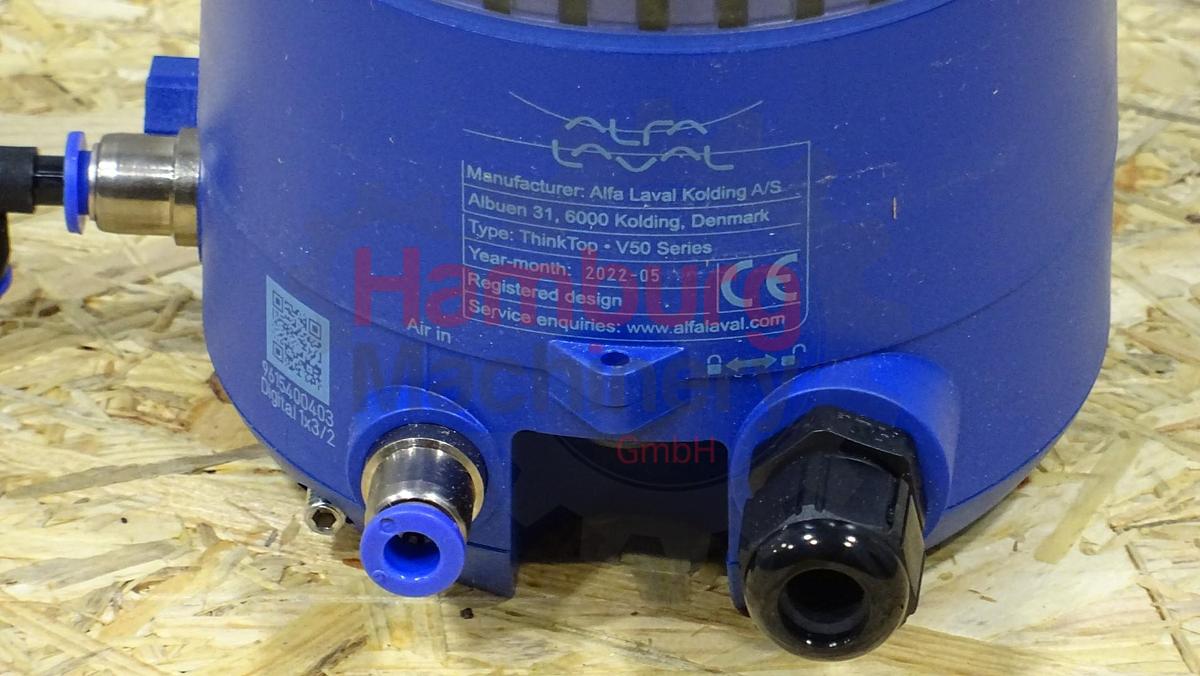 Unused Alfa Laval ThinkTop V50 is a valve-top control unit that provides surveillance and control of valves during the fluid handling process. The control unit has been developed with user friendliness and robustness in mind. The V50 series is the compact option with a feature set tailored to valves that require only one solenoid valve such as butterfly and single seat valves. Solenoid valves 1 x 3/2. Digital 24 VDC. Article number: 9615400403., Type of Machine: Valve-top control unit, Art. no.: 9615400403