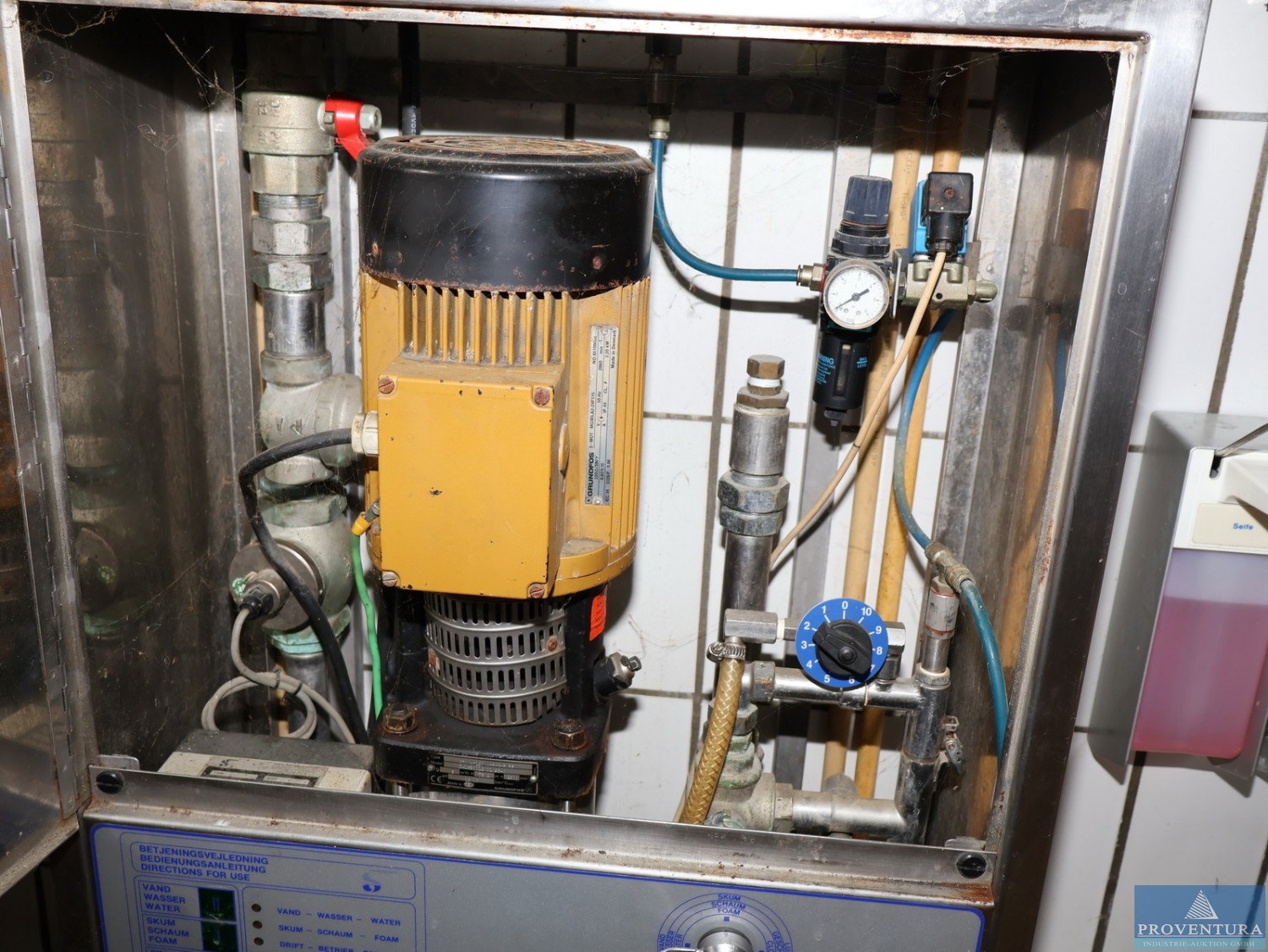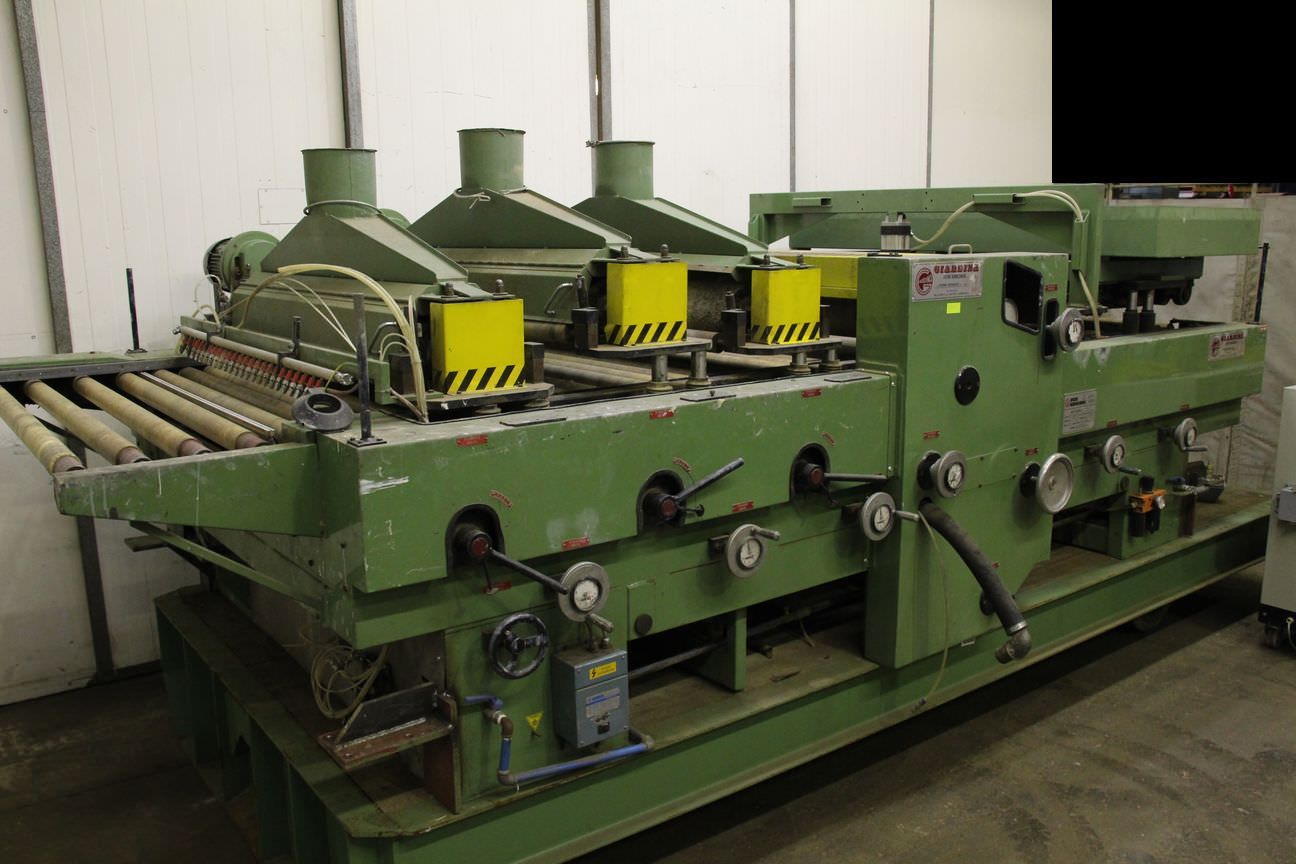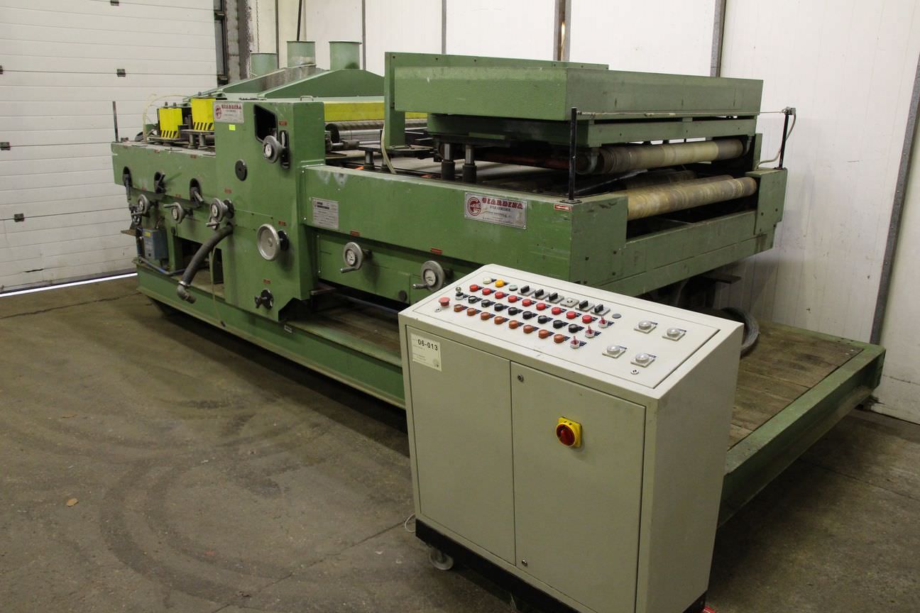 Coating roller machine, roller application machine-Transfer in current condition as seen-Manufacturer: Giardina-Max. Width: 1260 mm-Casting gap: adjustable-with: 3x brush units-Connection power: 11 kW-Dimensions: 4600/2360/H1600 mm-Weight: approx. 4000 kg