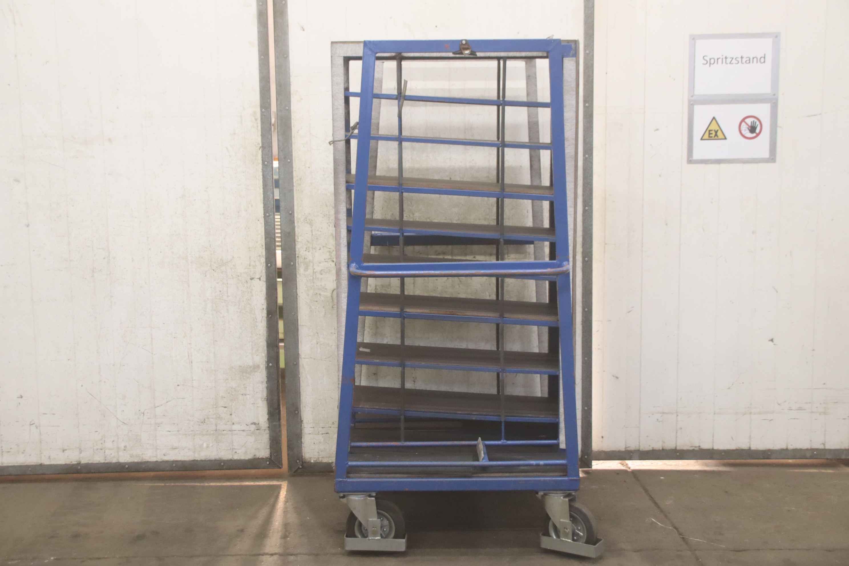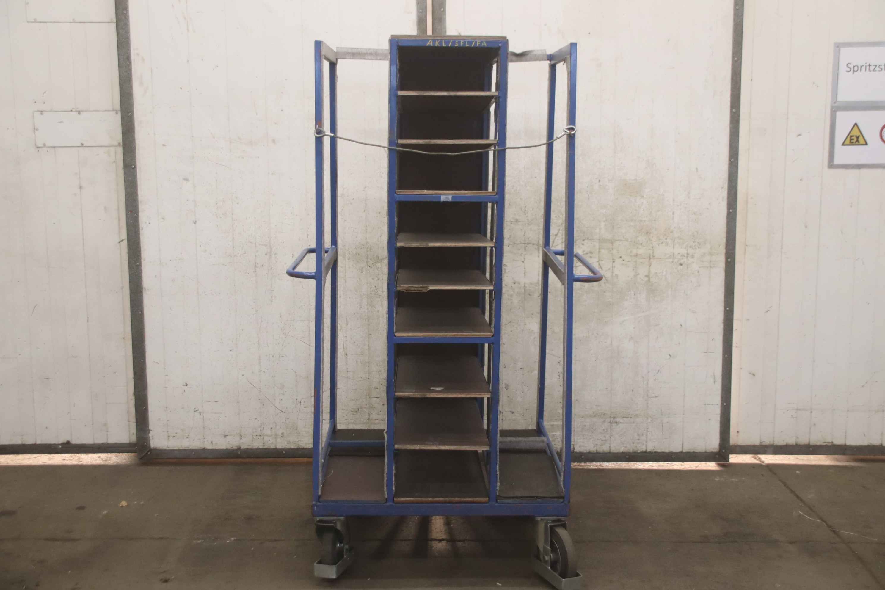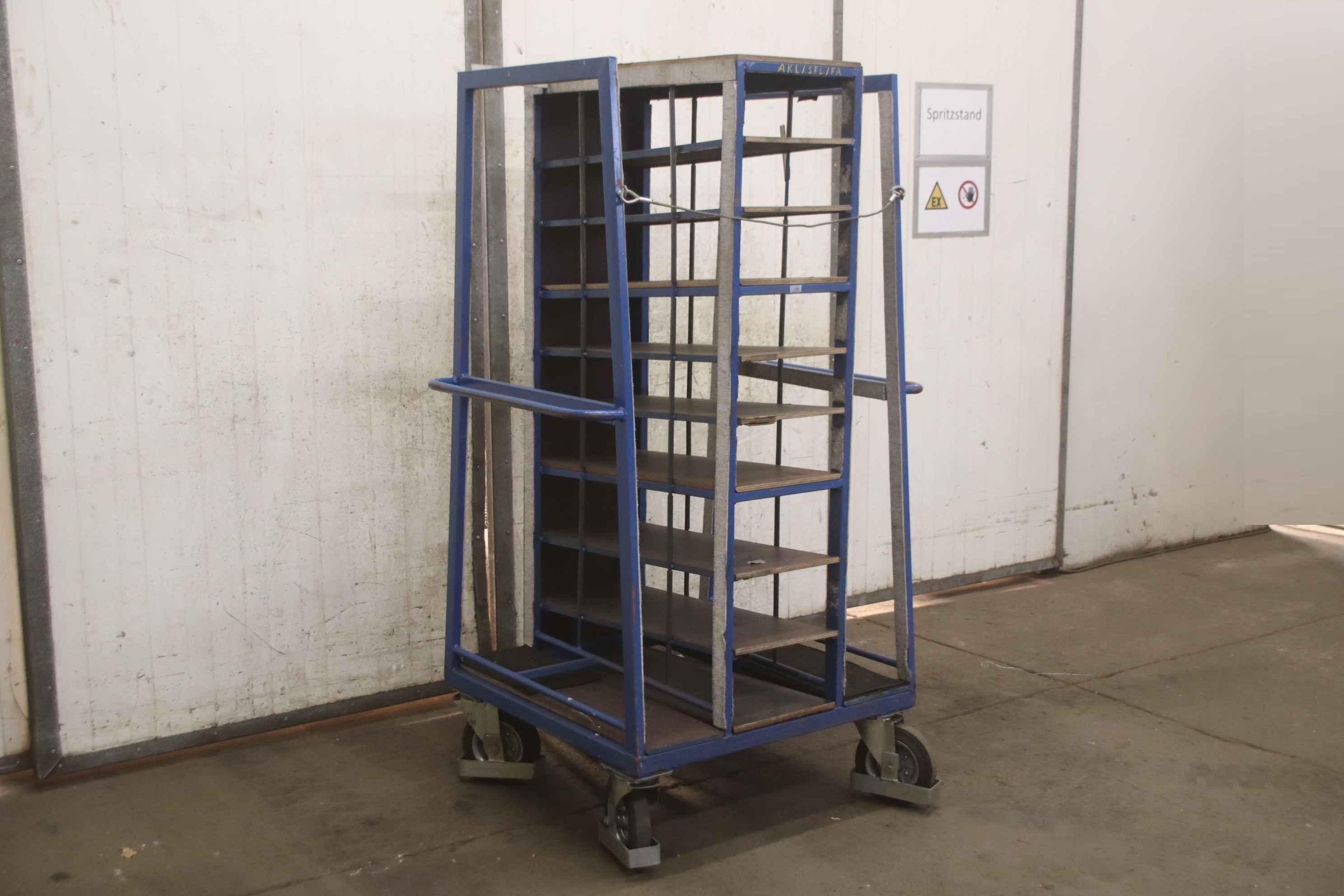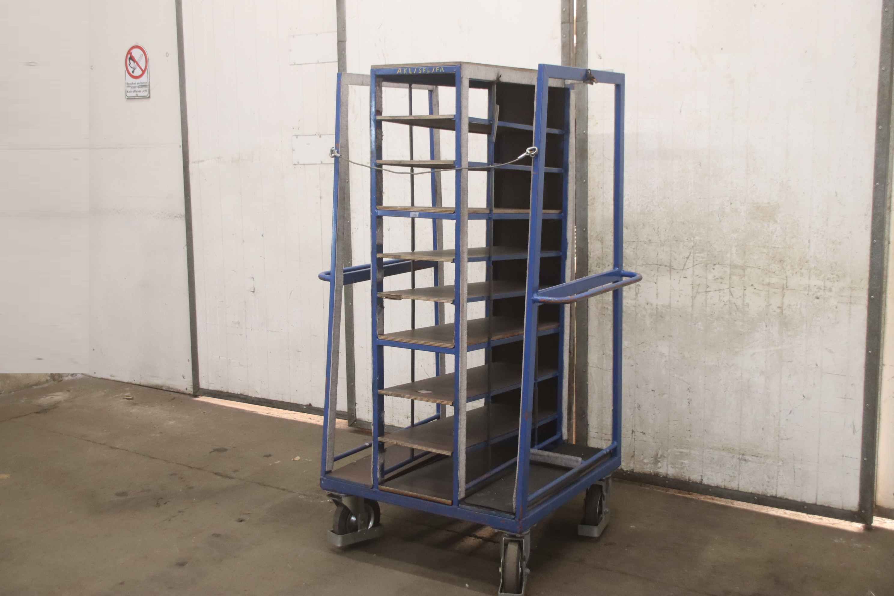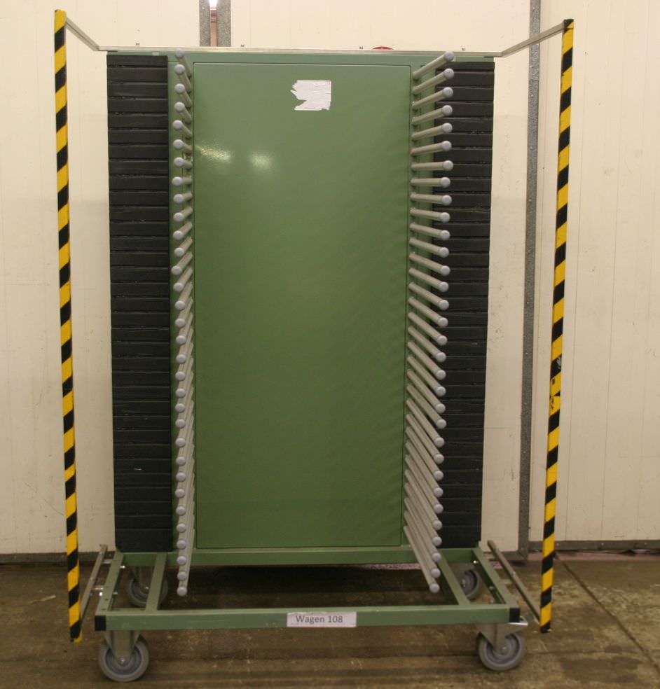 Tier trolleys, transport trolleys, shelf trolleys, sorting trolleys, picking trolleys, mobile shelves, tray trolleys, embroidery trolleys-Transport trolley: Commission trolley, floor trolley-Tiers: 9 borders arranged diagonally-Border dimensions: see photos-Chassis: 4 swivel castors-Total dimensions: 1000/800/H1700 mm-Weight: 103 kg