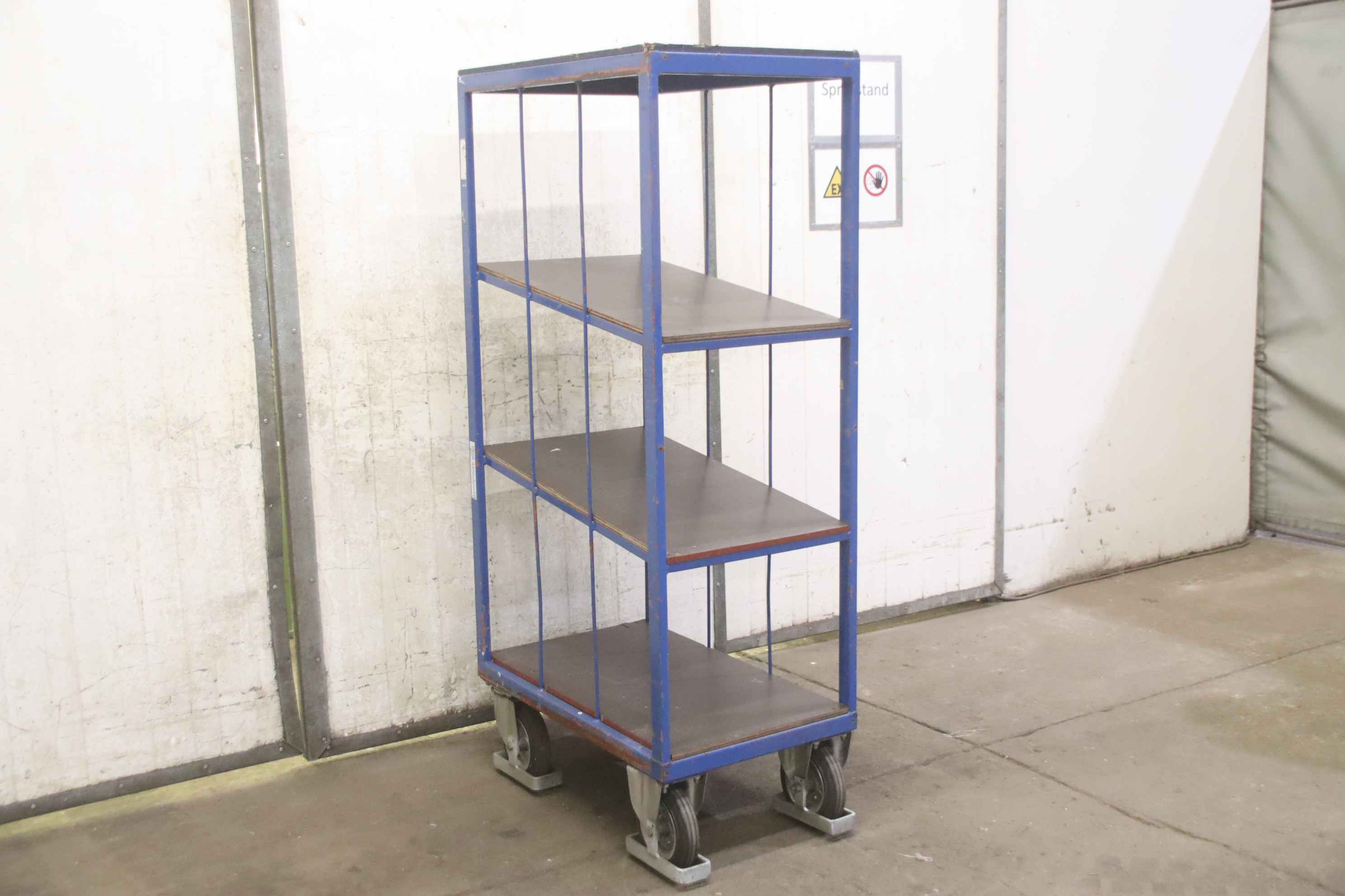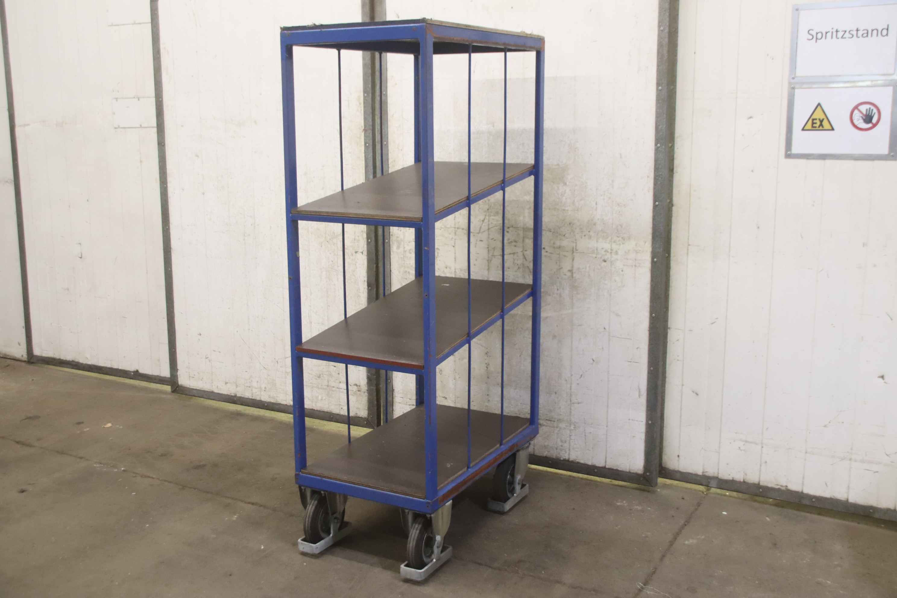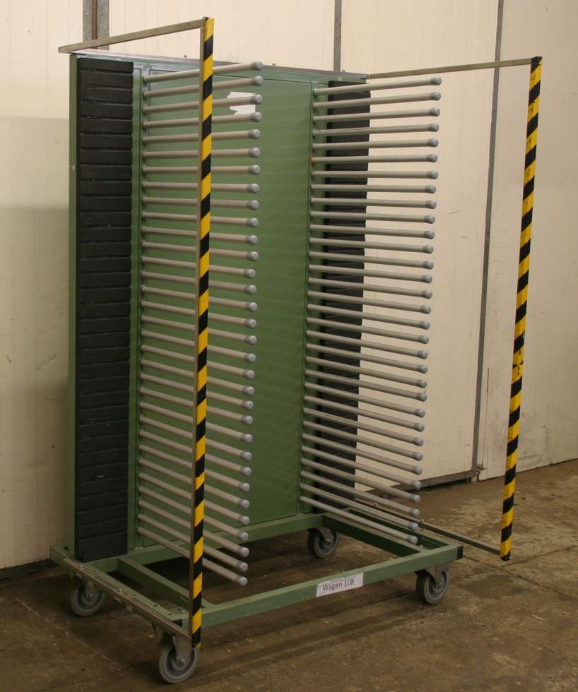 Tier trolleys, transport trolleys, shelf trolleys, sorting trolleys, picking trolleys, mobile shelves, tray trolleys, embroidery trolleys-Transport trolley: Commission trolley, floor trolley-Tiers: 4 borders arranged diagonally-Border dimensions: see photos-Chassis: 2 swivel castors / 2 fixed castors-Total dimensions: 810/500/H1650 mm-Weight: 69 kg