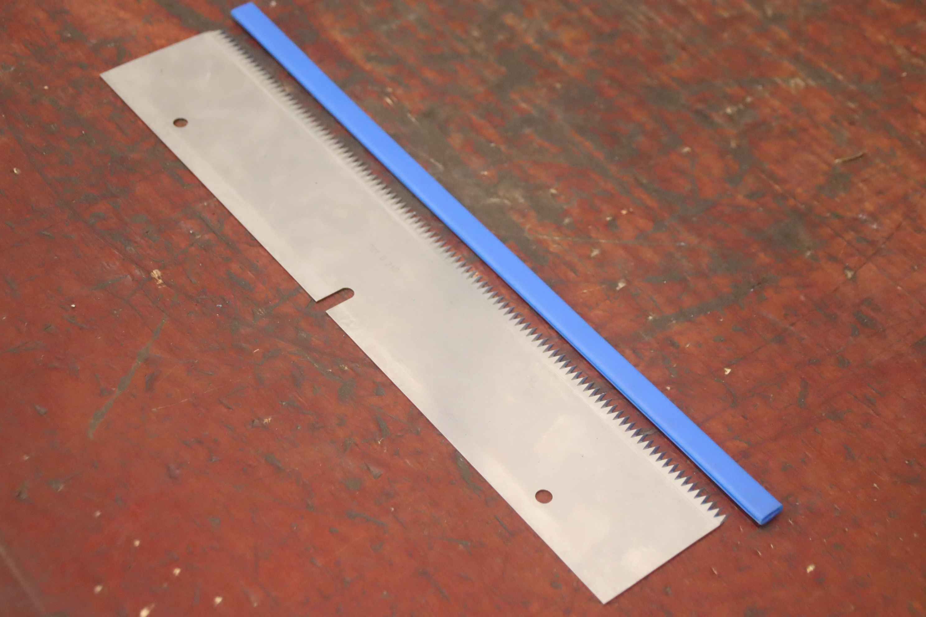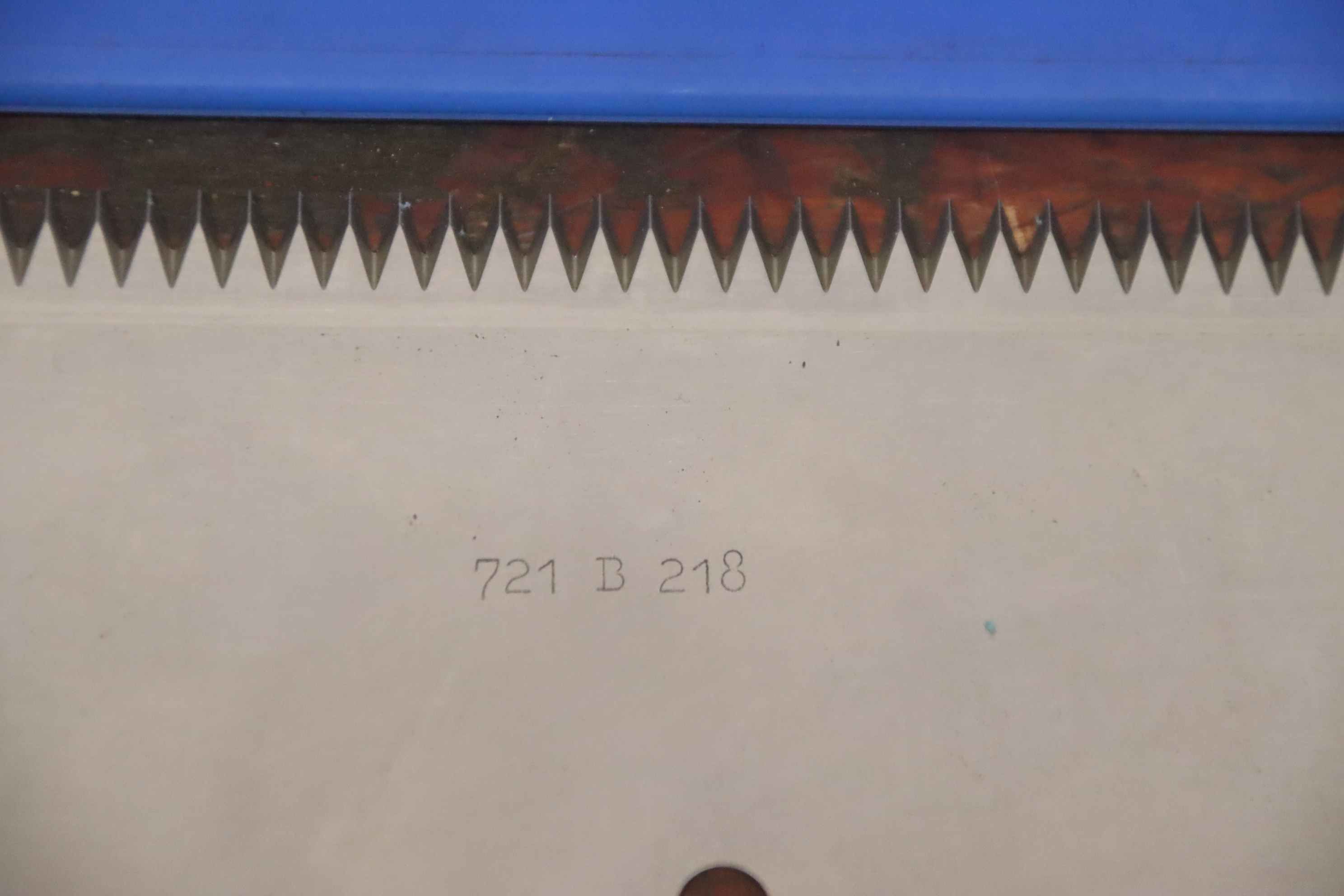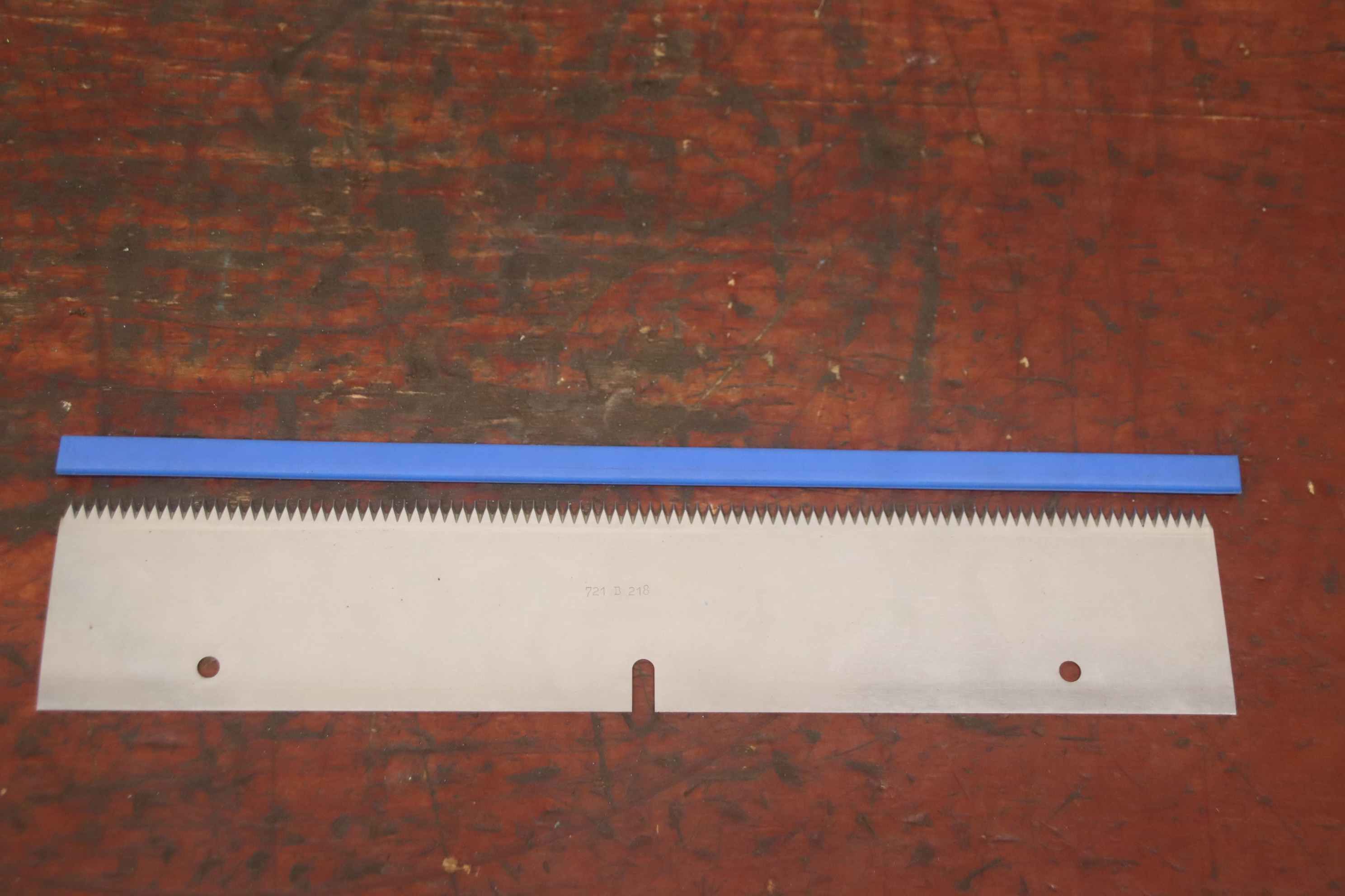serrated knife, scraper knife, machine knife, knife -Scraper knife: blade insert 6 pieces -Type: 721 B 218 -Hole diameter: Ø 6.5 mm -Number: 6x blades available -Price/Delivery:complete -Dimensions: 345/65/1 mm -Weight: 0.2 kg/piece