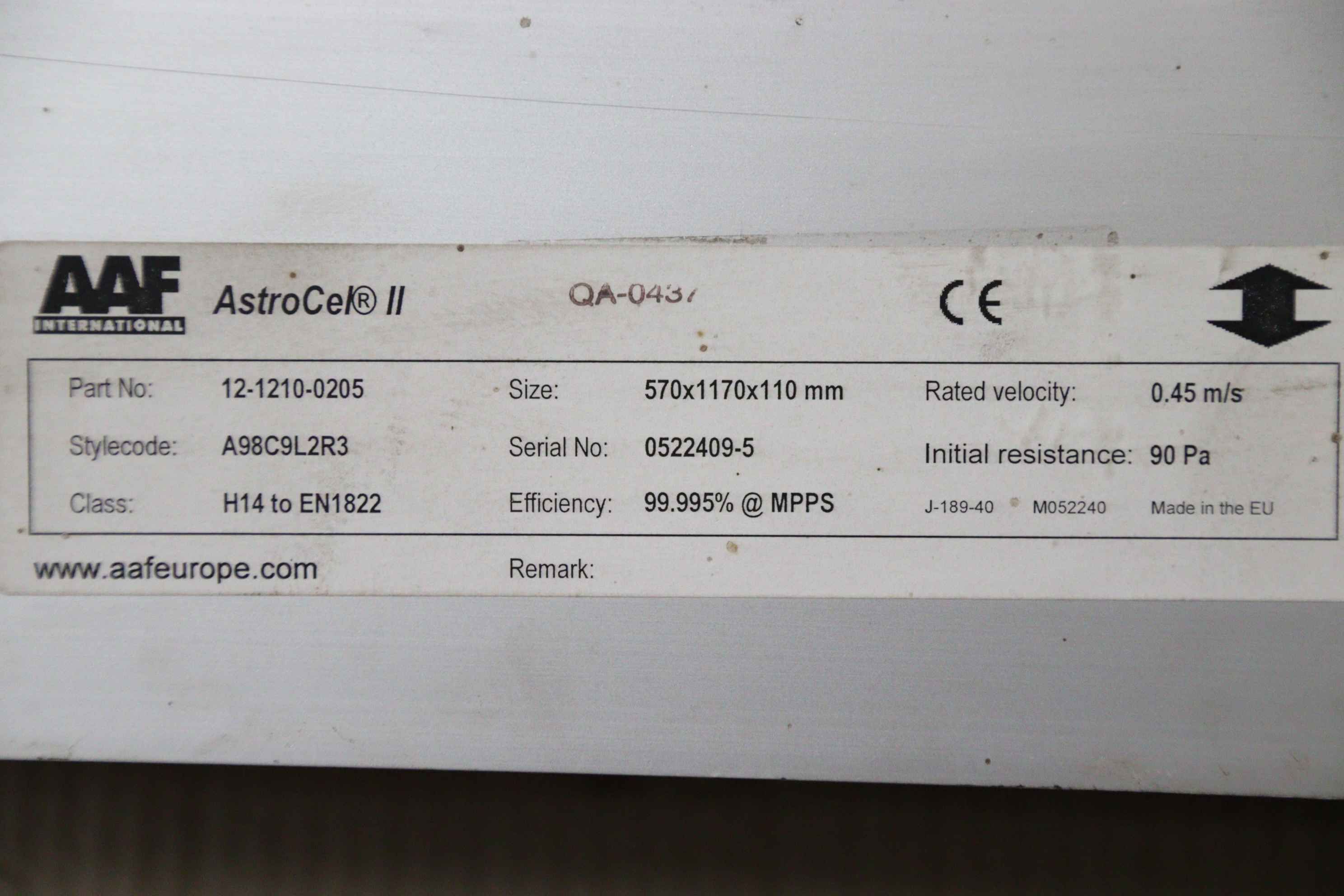 Filter system, clean air filter, fine filter, filter, compact filter, particulate filter, filter cassette -Manufacturer: AAF International, air filter type AstroCel ® II -Part No: 12-1210-0205 -Front frame dimensions: 570x1170x110 mm, see photo type plate -Number: 2x air filters available -Price: per piece -Dimensions: 1170/110/H570 mm -Weight: 11 kg/piece