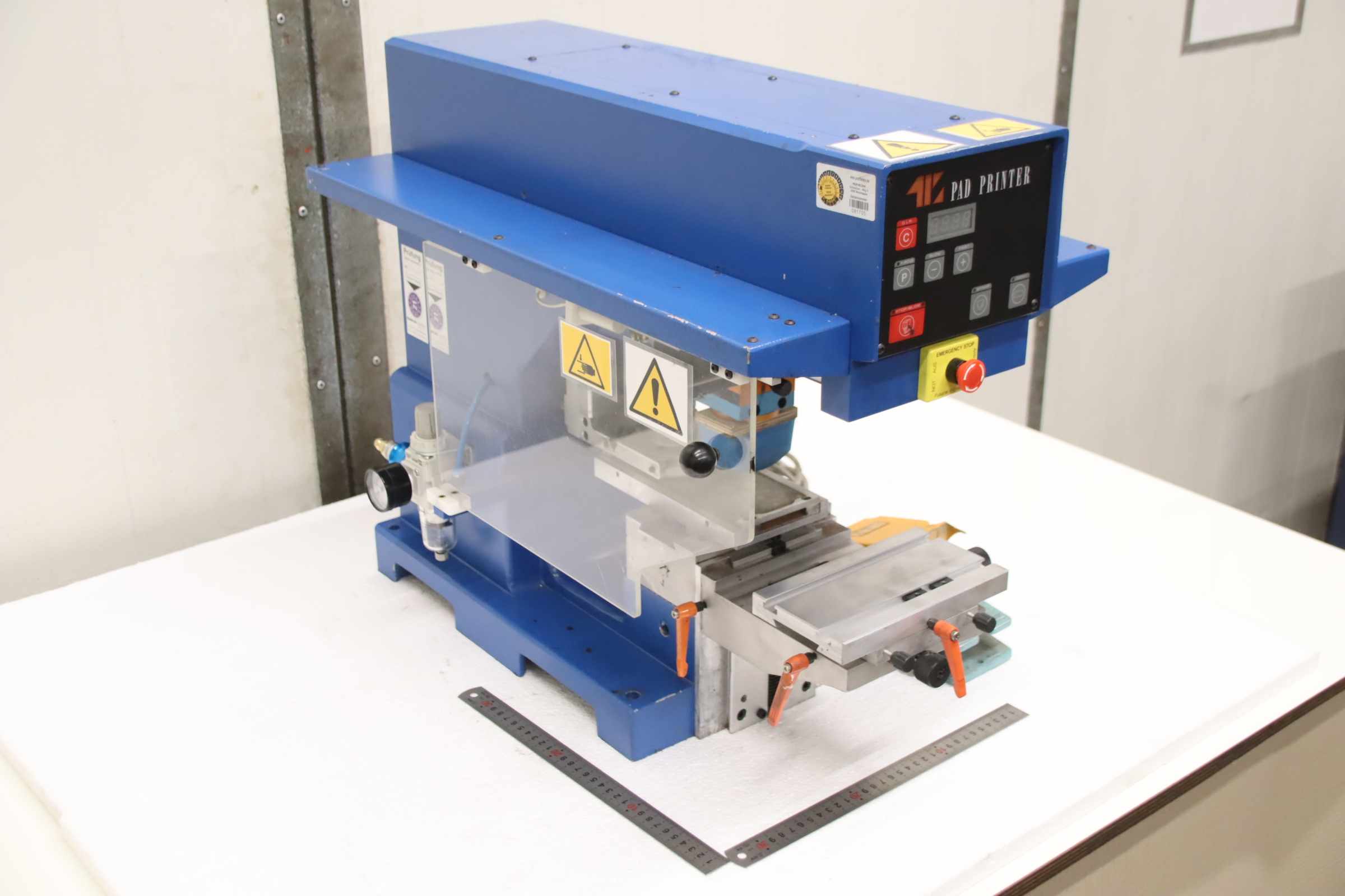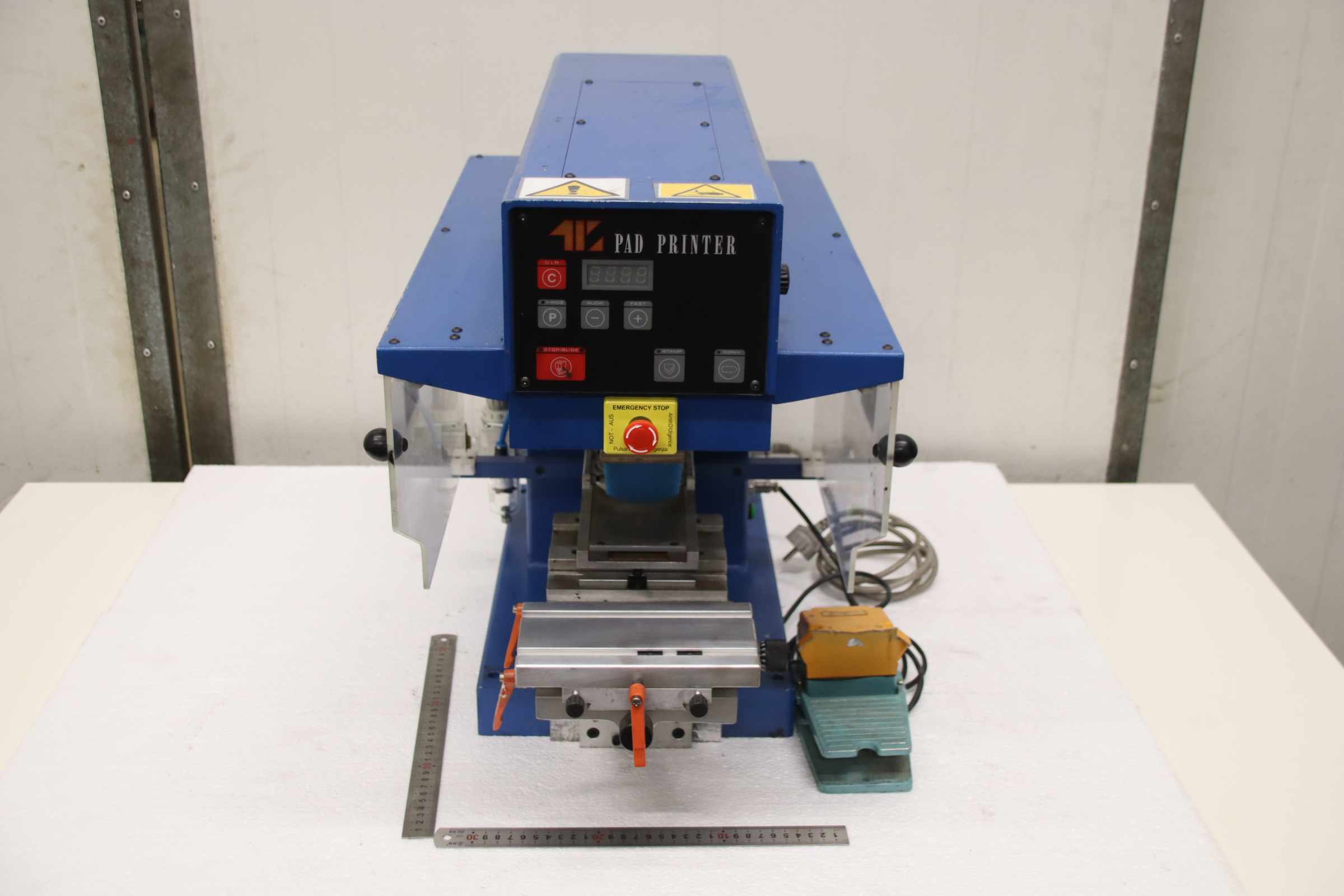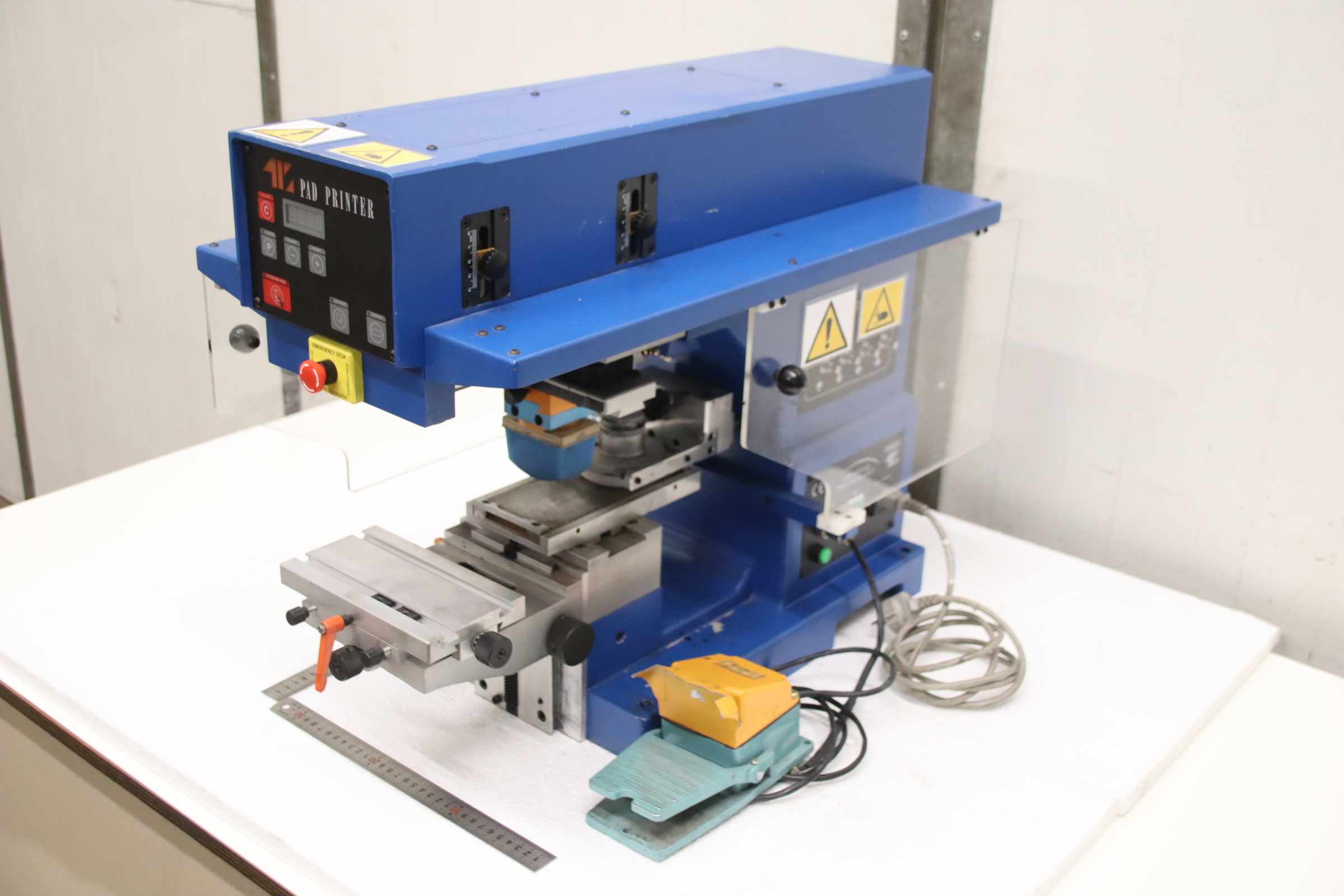 Pad printing machine, screen printing machine, rotary printing machine, pad printer -Manufacturer: Eickmeyer, screen printing machine, pad printing machine -Type: TIC 121 SC -Voltage: 230 V -Table size: 180 x 100 mm -Protrusion: 165 mm -Operation: with foot pedal -Number: 2x pad printing machines available -Price: per piece -Transport dimensions: 670/400/H530 mm -Weight: 50 kg/piece