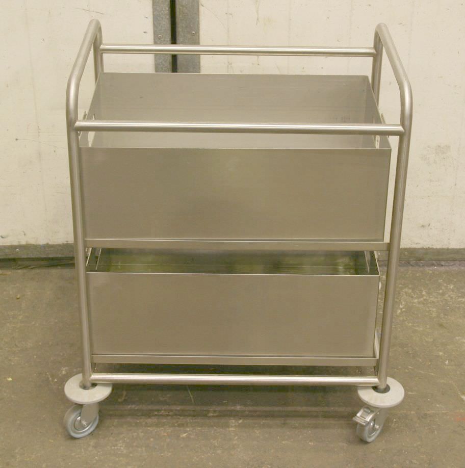Tier trolleys, transport trolleys, shelf trolleys, sorting trolleys, order picking trolleys, mobile shelves, tray trolleys, embroidery trolleys-Transport trolley: Commission trolley, floor trolley-Tiers: 2 borders arranged diagonally-Border dimensions: see photos-Chassis: 4 swivel castors-Total dimensions: 810/500/H1645 mm-Weight: 63 kg