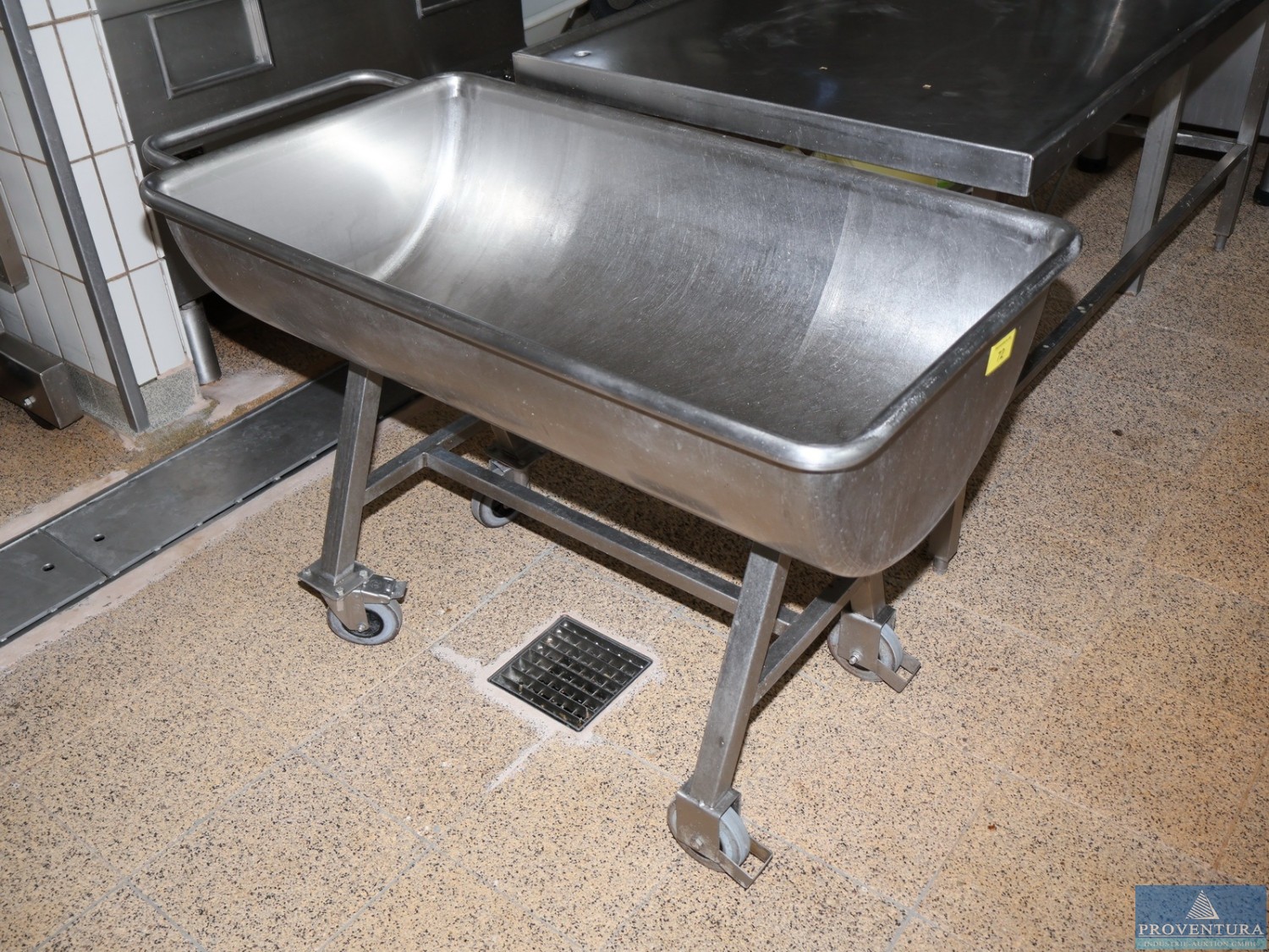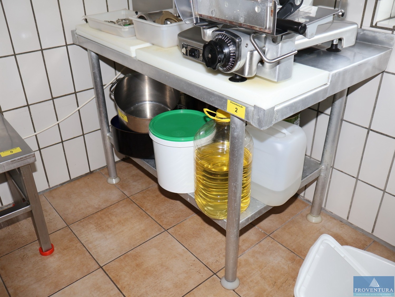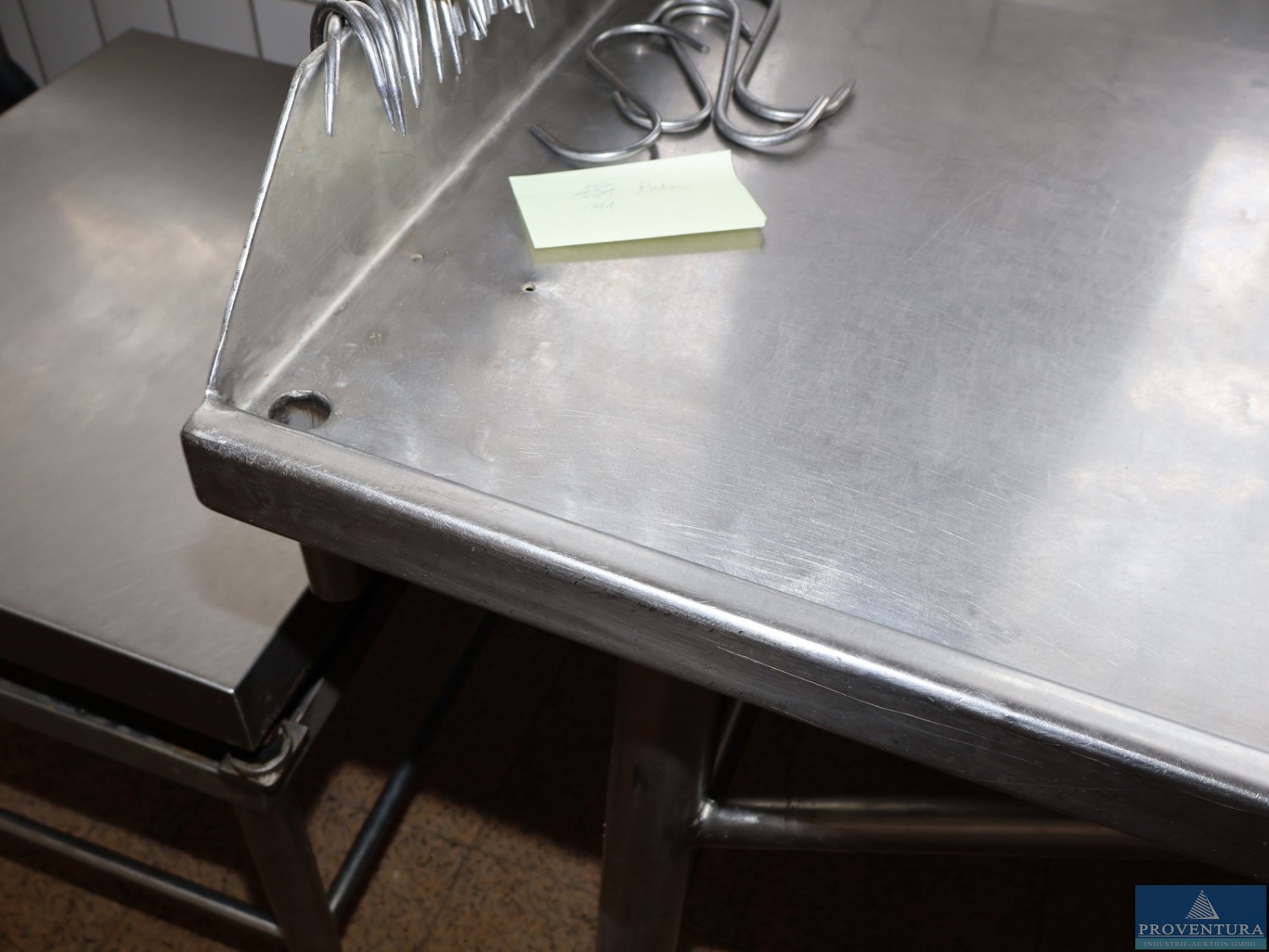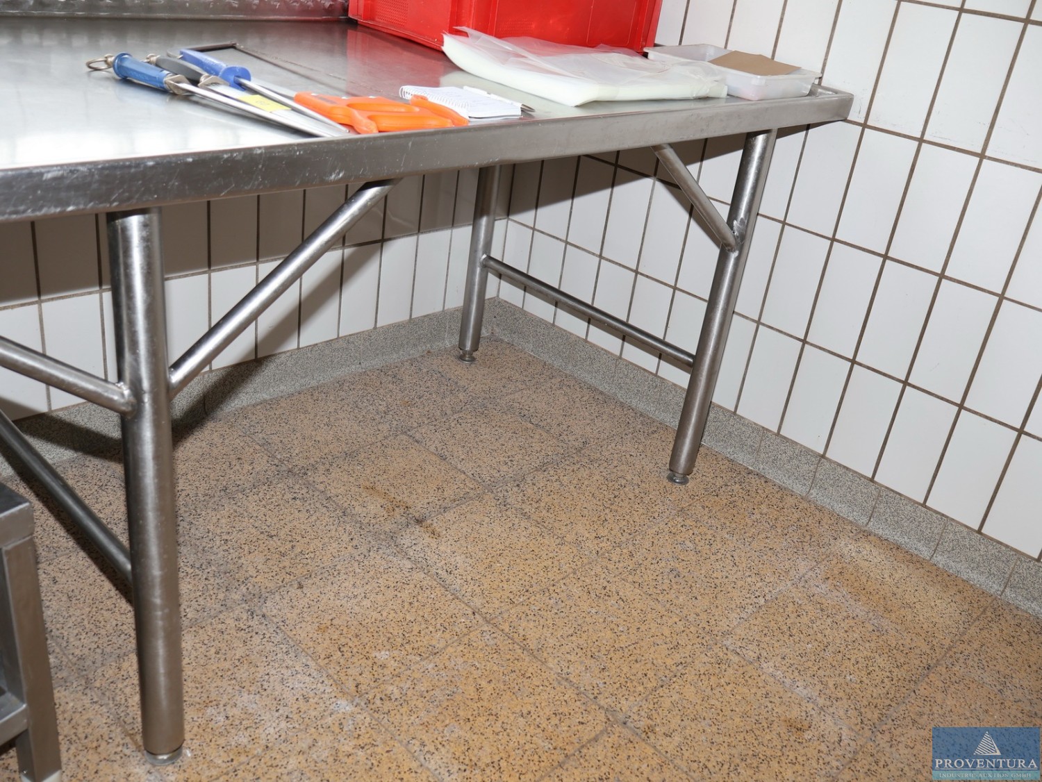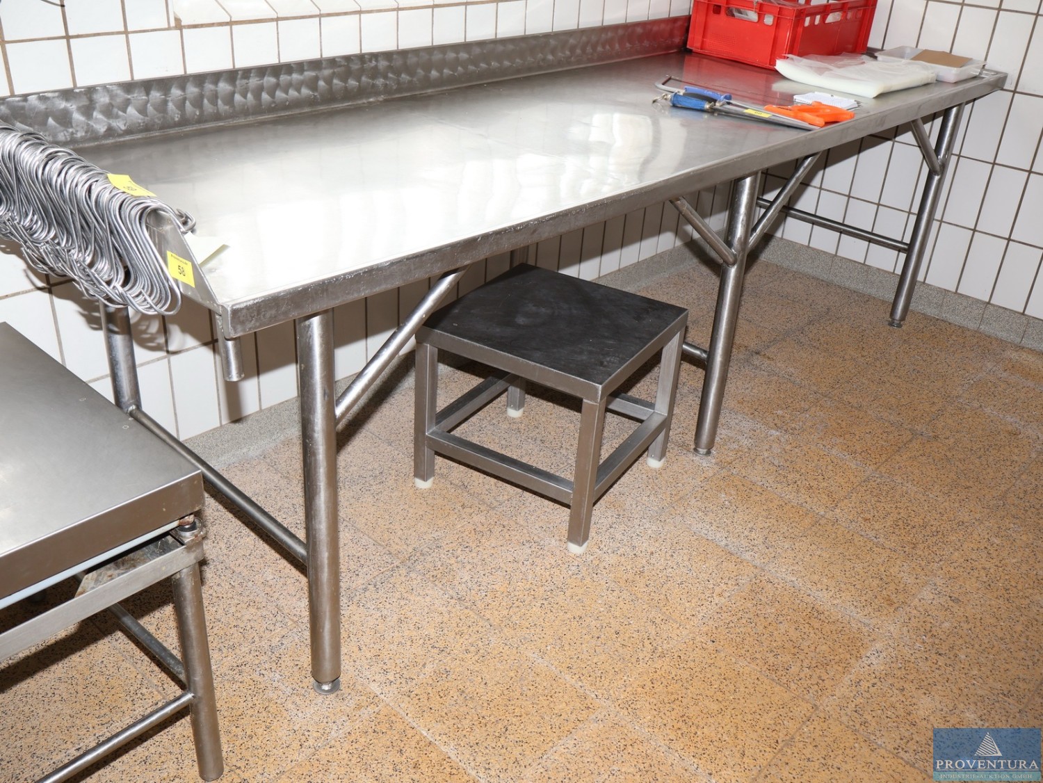 Стол для резки из нержавеющей стали примерно 300x90 см, слив слива, фартук сзади и слева, частично сваренный, без содержимог