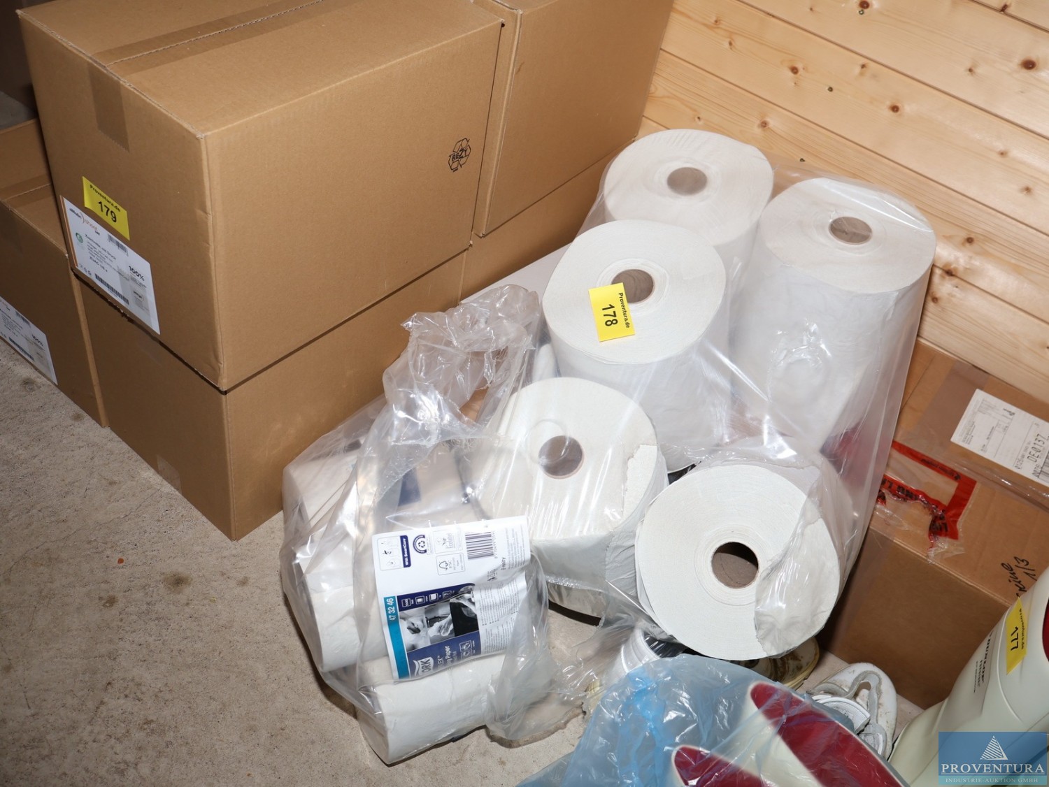 Рулоны бумажных полотенец TORK белые, 6 кусков шириной, 4 кусочки маленькие, плюс ещё один картон примерно 3 штуки большого размер