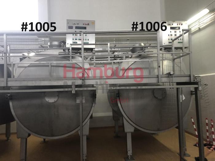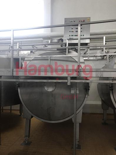 Tebel OST-IV Closed cheese vat of 8.000 ltr. Double jacketed for injection of steam or hot water so the temperature of the milk inside the vat can be indirectly adjusted. Stirring, cutting tools, welded to a horizontal shaft. This is driven by a drive unit with frequency converter. During cutting the tools rotate in the opposite direction as during stirring. The coagulum is cut by sharp radial knives of stainless steel. Whey can be drawn off through a perforated pipe (whey suction device). This pipe is lowered into the whey until it is only just immersed. The curd is discharged through the bottom valve. The vat is inclined (4%) toward the bottom valve to facilitate emptying. After a production run the vat is cleaned by four rotating CIP nozzles located in the top. All parts are made of stainless steel AISI 304 except the drive unit. Stainless steel MCC panel at the backside, close to the ...