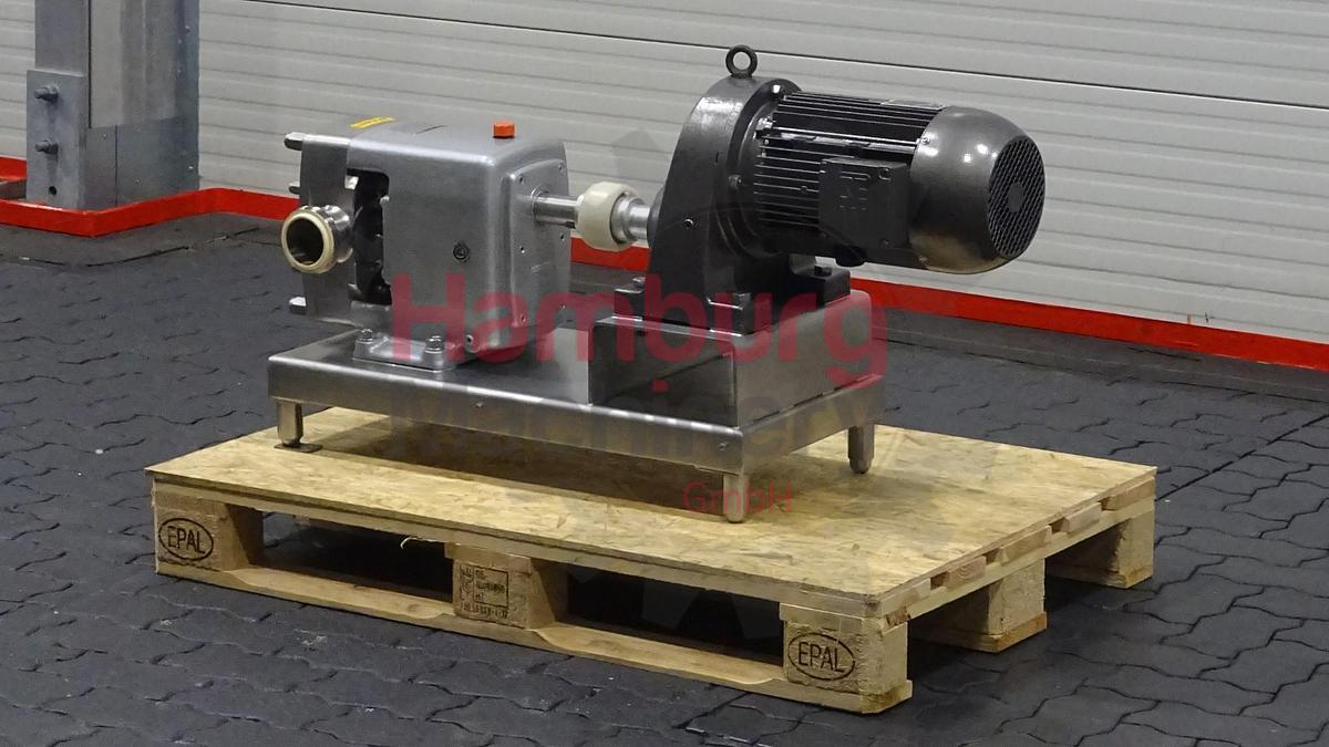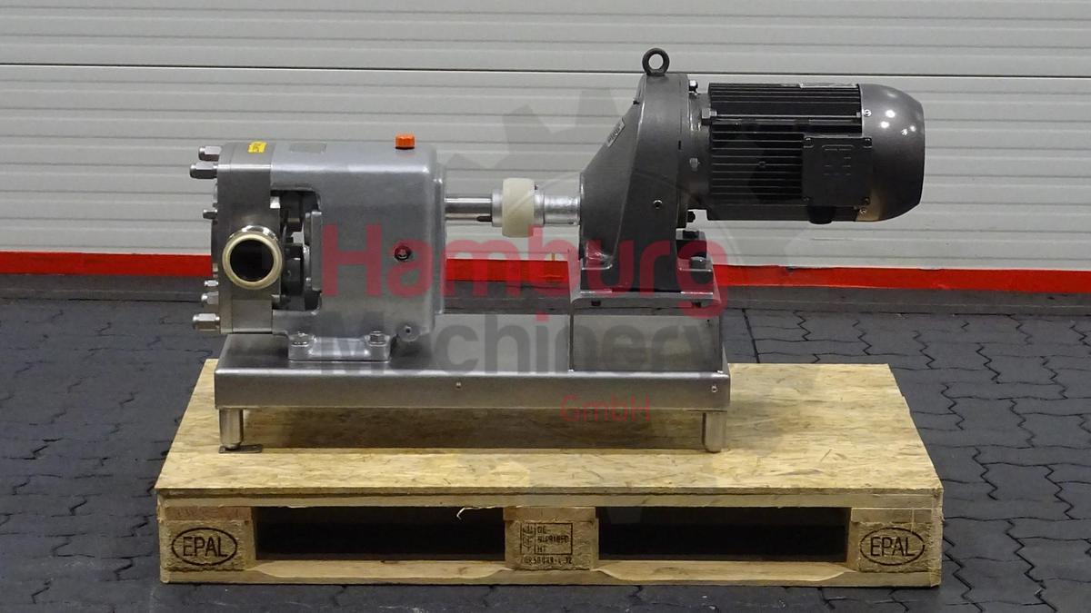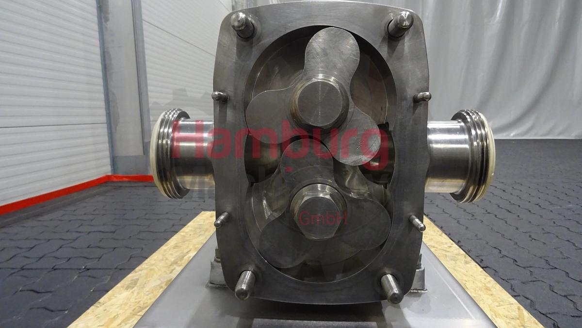 The APV Cleanline CL3/078/20 is a positive displacement rotary lobe pump with sanitary design which can handle dairy products (e.g., yoghurt, quark, curd and butter), foodprocessing, beverage, cosmetics, pharmaceutical and fine chemicals industries. This pump is perfect for managing all kinds of fluid, of either low or high viscosity, as well as for filtering and bottling applications. Products containing fragile solids such as curd can be pumped without damage thanks to the specially designed lobes. Tri-lobe stainless steel lobes / rotors. Nominal displacement: 0,780 liter per revolution. Maximum nominal capacity: 33,7 m3/h. Inlet connection: 80 mm. Outlet connection: 71 mm. Maximum product pressure: 7 bar Maximum pump speed: 720 rpm. Maximum temperature: 110 °C. The pump is used in a dairy for product pumping. The current motor with this pump is 5,5 kW - 1.430 rpm - 400 V - 50 Hz - 11 ...