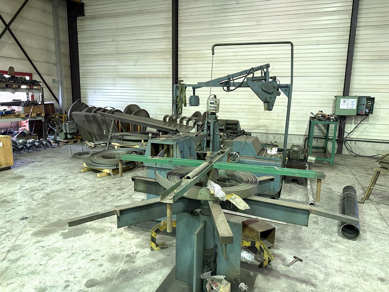 Continue spiraalschroefmachine voor de productie van industriële schroeven. Spiraalvormige schoepen worden gevormd door een metalen strip onder druk door conische rollen te leiden. Maximale strookbreedte: 200 mm Maximale stripdikte: 11 mm spiraalrichting naar links of naar rechts optimale rolsnelheid: 80 tpm Spoelcapaciteit: 5 ton Gewicht van de machine: 12 ton vermogen: 75 pk Inclusief rolslijphulpstuk: hiermee kunnen de conische rollen opnieuw geslepen worden zonder ze uit de machine te hoeven verwijderen. Inclusief hydraulische guillotines: geschikt voor het doorsnijden van alle soorten vleugels. Standaard steek: de buitendiameter is gelijk aan de steekmaat. Korte spoed: de spoed is kleiner dan de buitendiameter. Lange spoed: de spoed is groter dan de buitendiameter. Lintvlucht: vergrote binnendiameter door gebruik van smal basismateriaal. Komvormige vliegwiel: het vliegwielblad staa ...