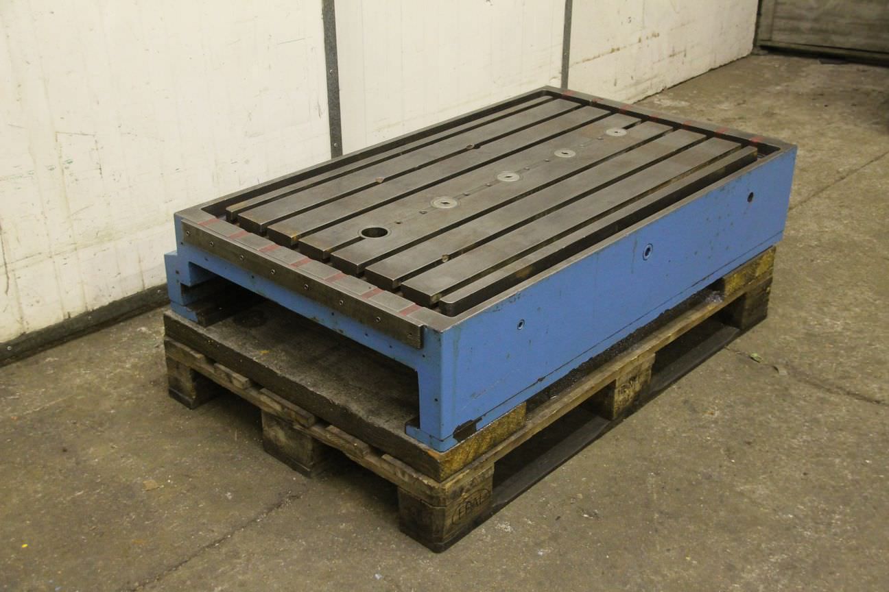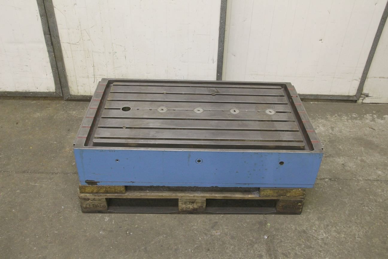 Clamping plate with T-slots and cross table, plate field, welding table, welding table, plate boring machine, T-slot plate -T-slot plate comes from: a Fluri milling machine type 14SE -Width: 720 mm -Length: 1200 mm -Height: 235 mm -Plate thickness: mm -Plate: Solid -Groove width: mm -Dimensions: 770/1200/H235 mm -Weight: 906 kg
