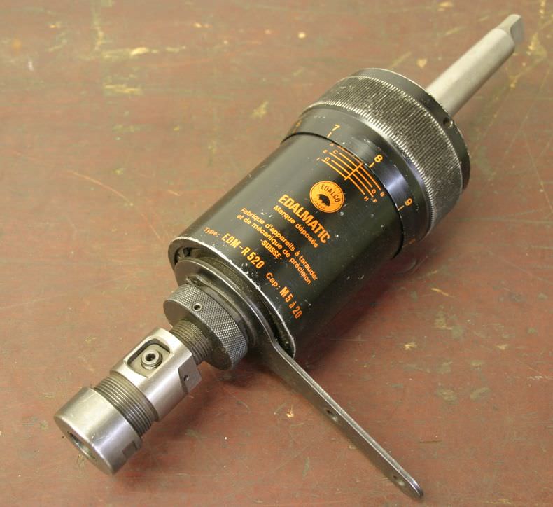 Thread cutting chuck, thread chuck, tap chuck, thread cutting apparatus -with slip clutch -Integrated reversing gearbox with quick return -Thread cutting sizes: M5-M20 -Recording: MK4 -Dimensions: 380/95 mm -Weight: 4.1 kg