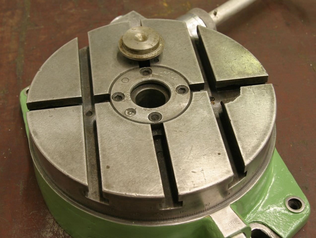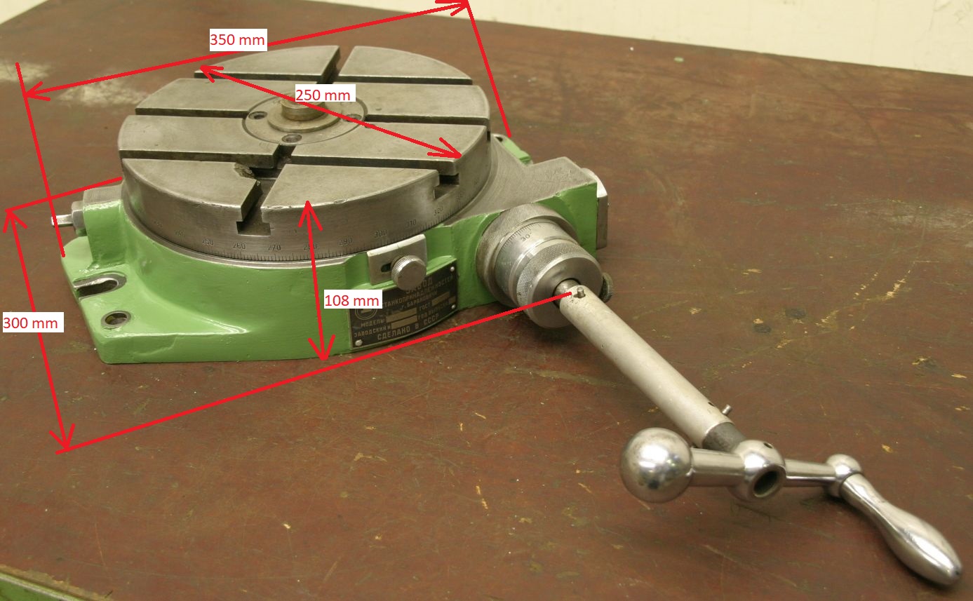 Rotary table, rotary indexing table, dividing head, dividing head -Clamping surface: Ø 250 mm -Groove: 20 mm -Height: 108 mm -Dimensions: 580/350/H120 mm -Weight: 36 kg