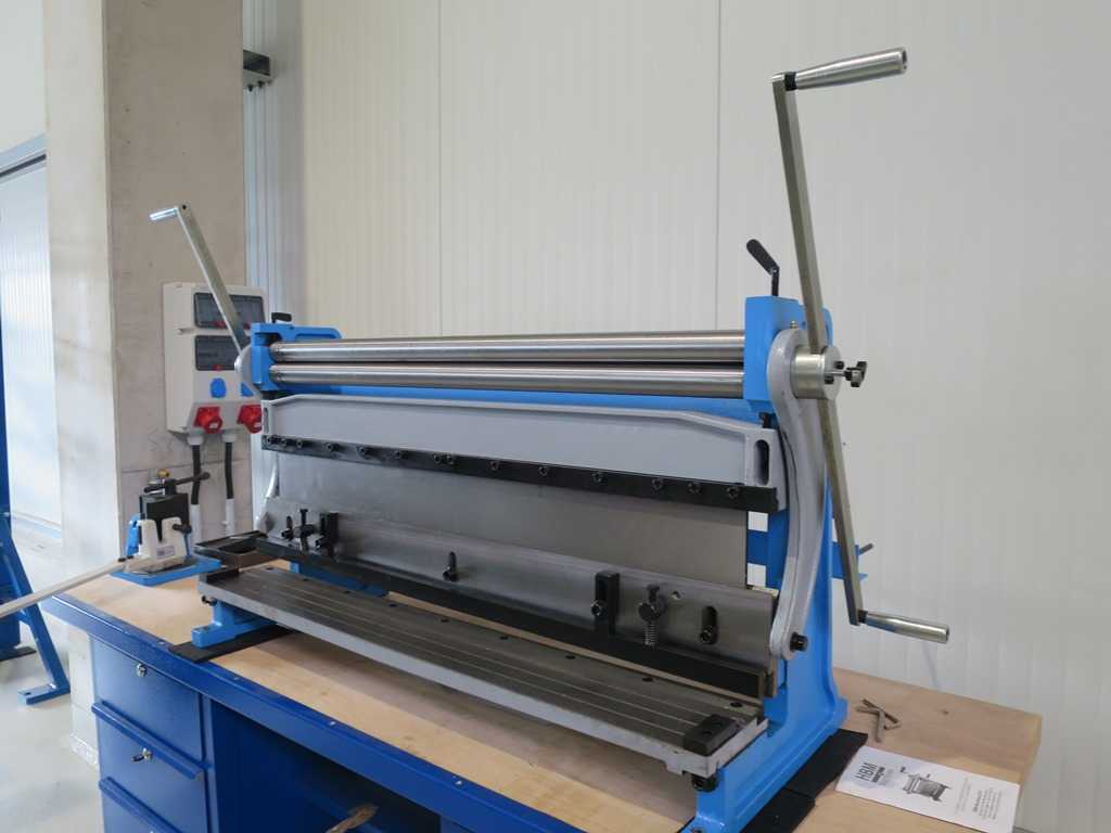 Combined sheet metal processing machine with:>br> bending, tool widths 25 - 50 - 75 - 150 - 200 - 250 - 300 mm.>br> rolls, roll diameter 42mm>br>- shears, max. 1015 x 1mm>br>>br>material width 1015 mm>br>material thickness 1 mm>br>speed by hand >br>weight 0.25 t>br>Dimensions L x W x H 1.4 x 0.6 x 0.75 m>br> >br>Condition: never used / new (5)