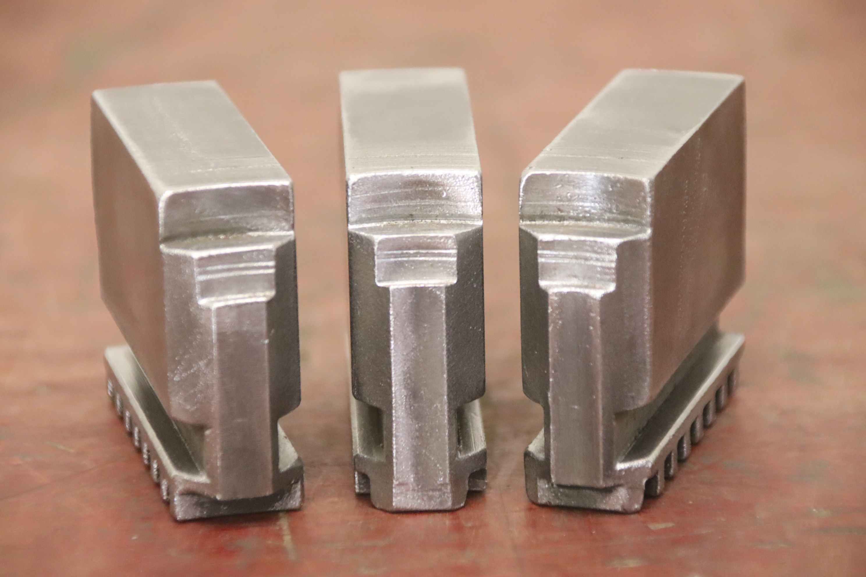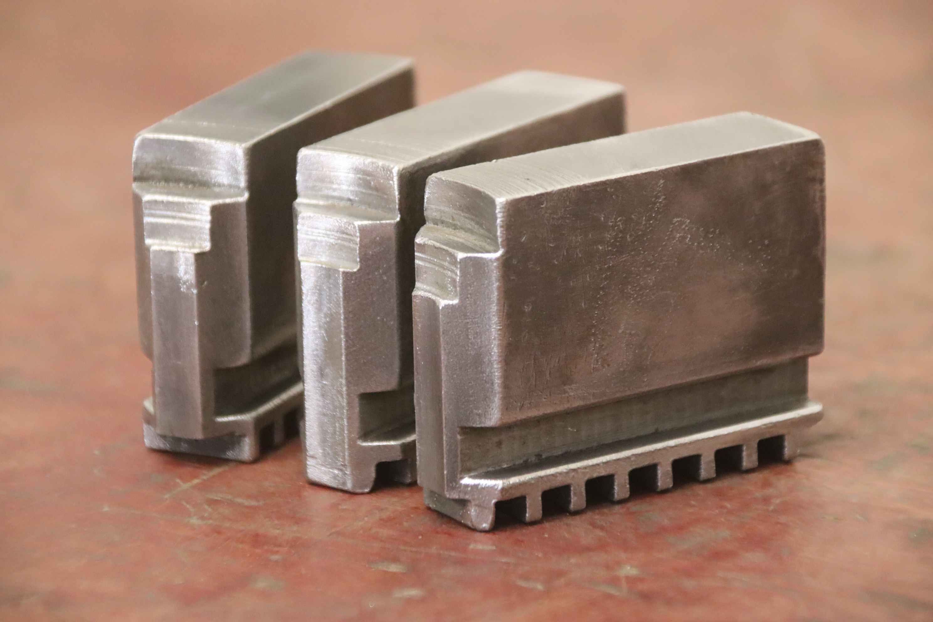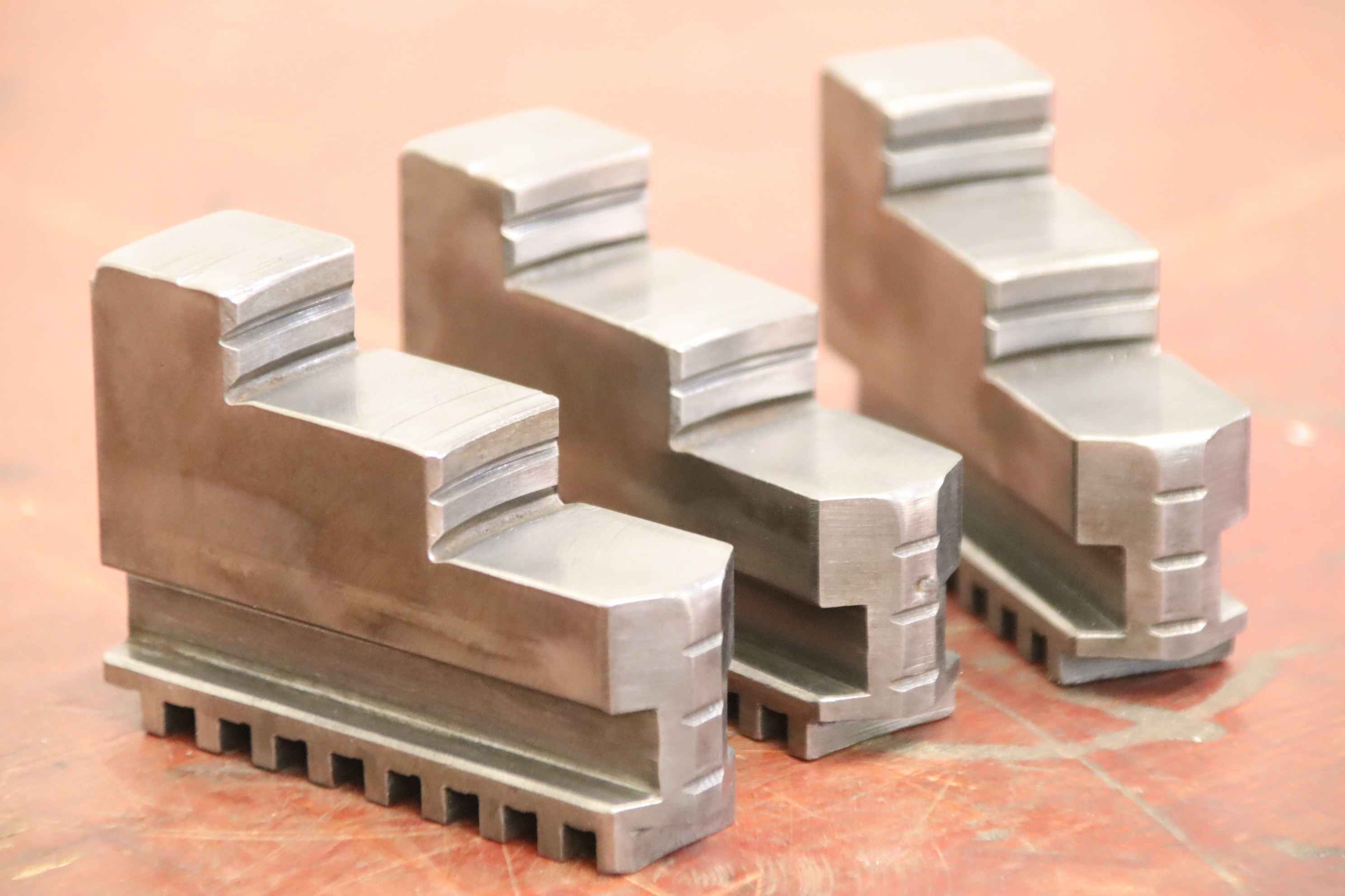 Interchangeable jaws, top jaws, three-jaw chucks, segment jaws, clamping jaws, step block jaws, step top jaws, block jaws, base jaws, interchangeable jaws, wedge bar chucks, interchangeable jaws, power chucks-Top jaws: Base jaws for key bar chucks, helical toothed-Jaw width: 22 mm-Dimensions: see photo technical drawing-Number: 4 sets of base jaws available-Price: per set-Total dimensions: 90/65/H35 mm / 90/67/H35 mm/ 90/70/H45 mm with screws-Total weight: 1.1 kg/set
