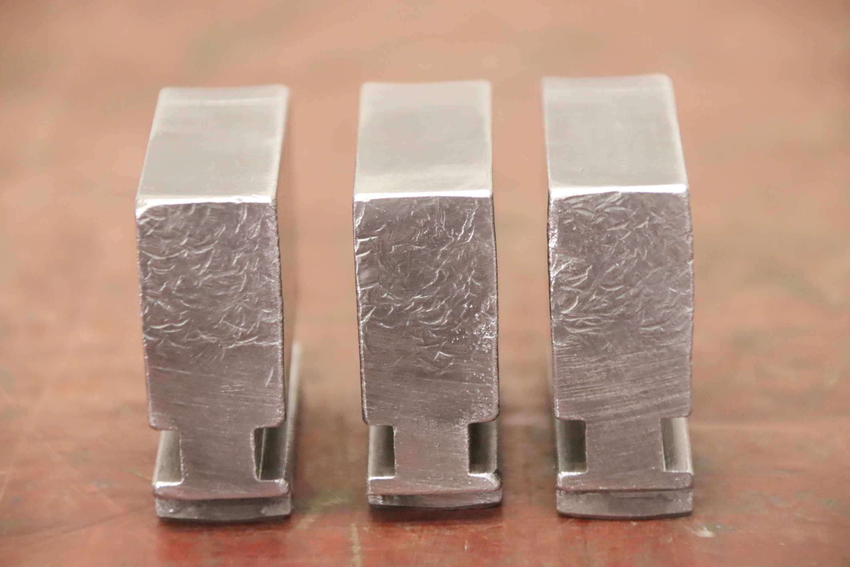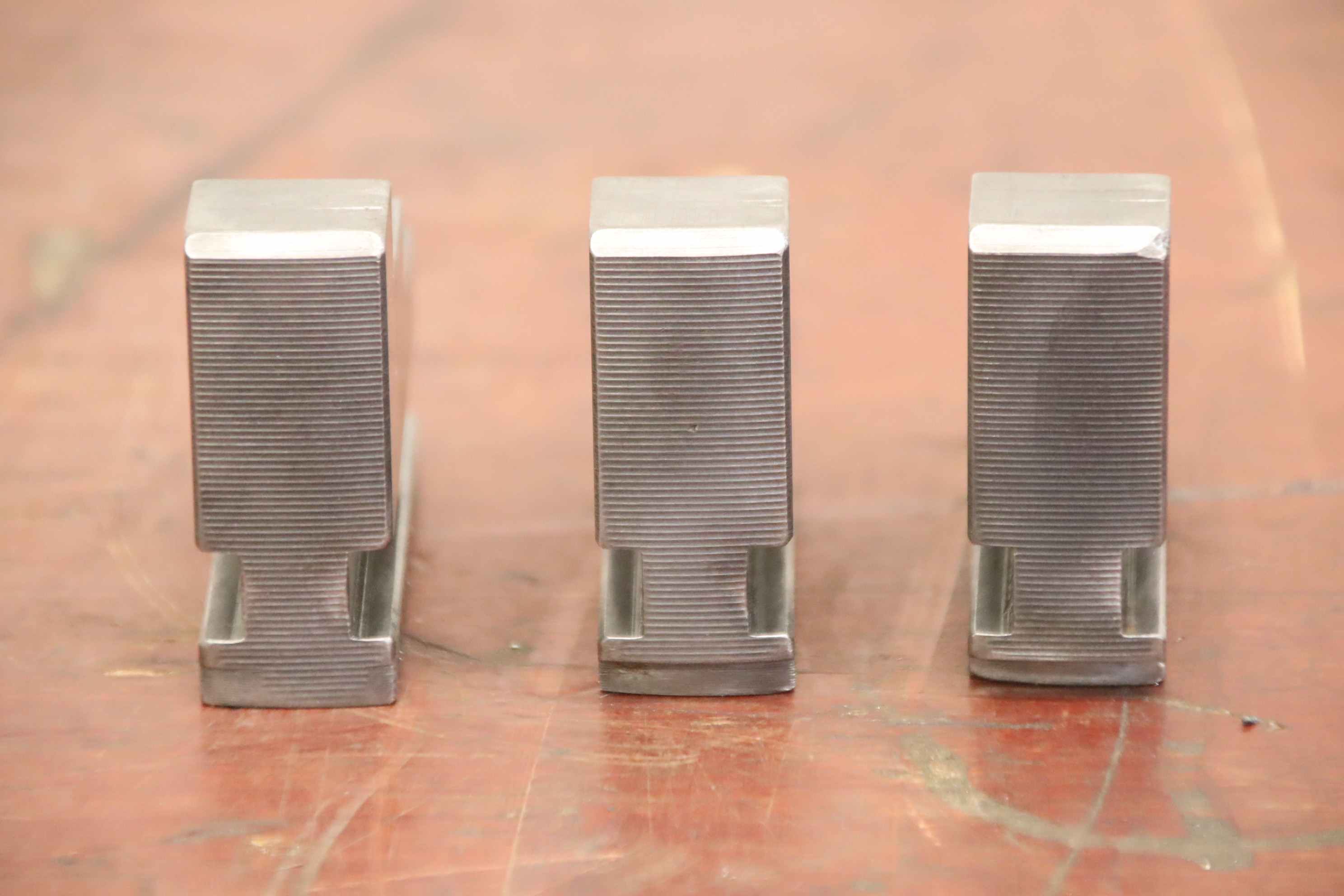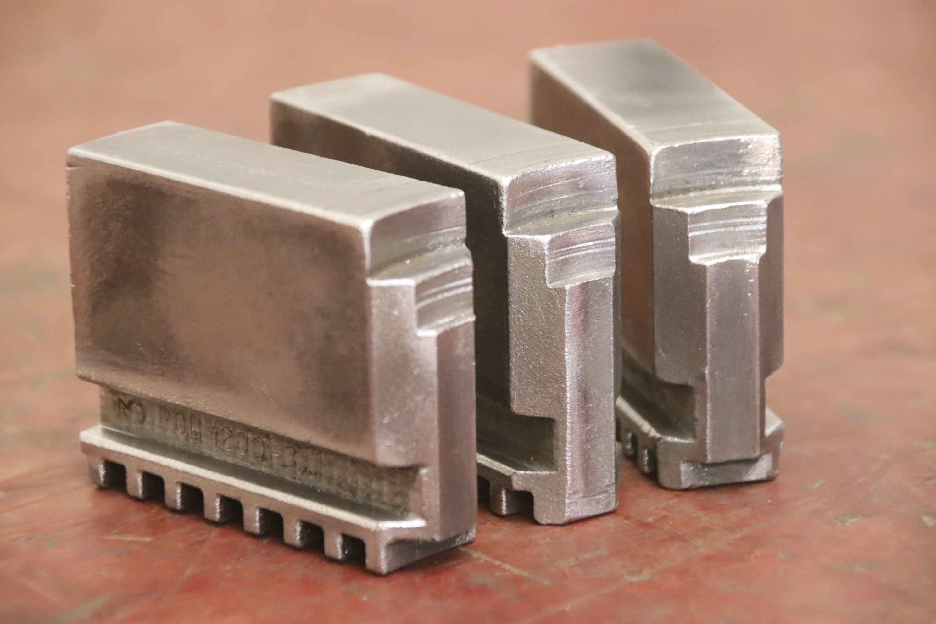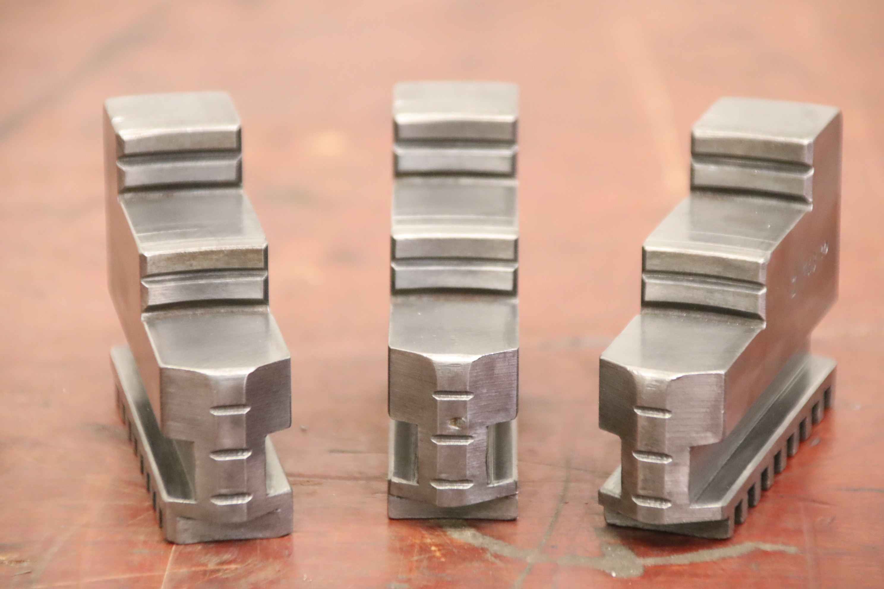 Interchangeable jaws, top jaws, three-jaw chucks, segment jaws, clamping jaws, step block jaws, step top jaws, block jaws, base jaws, interchangeable jaws, wedge bar chucks, interchangeable jaws, power chucks-Top jaws: Base jaws for key bar chucks, helical toothed-Jaw width: 22 mm-Dimensions: see photo technical drawing-Number: 4 sets of base jaws available-Price: per set-Total dimensions: 90/65/H35 mm / 90/67/H35 mm/ 90/70/H45 mm with screws-Total weight: 1.1 kg/set