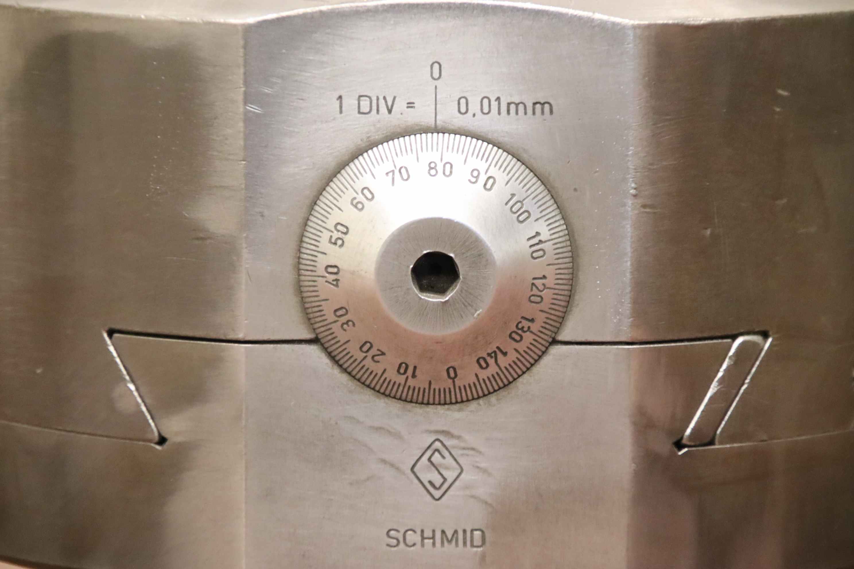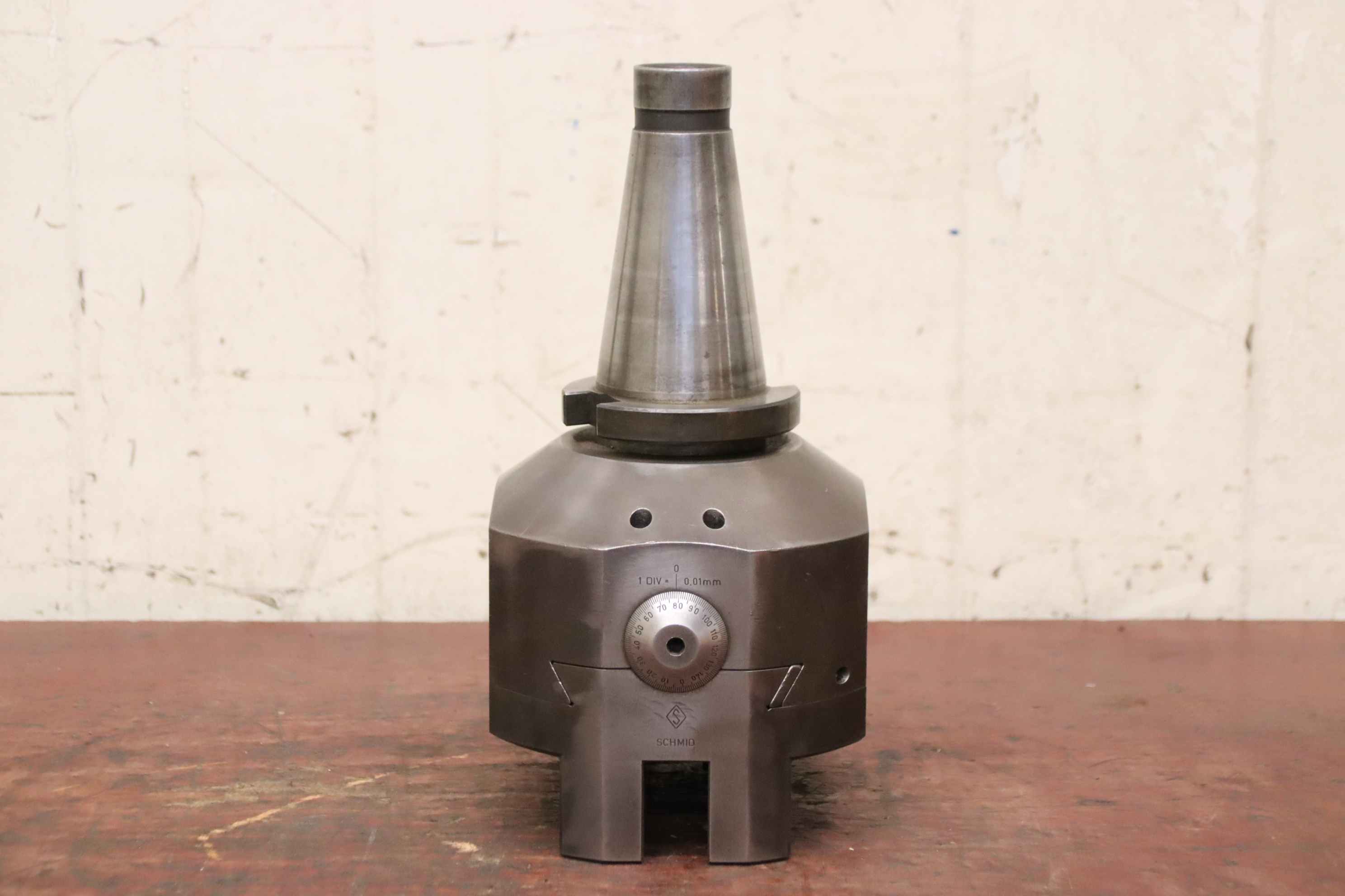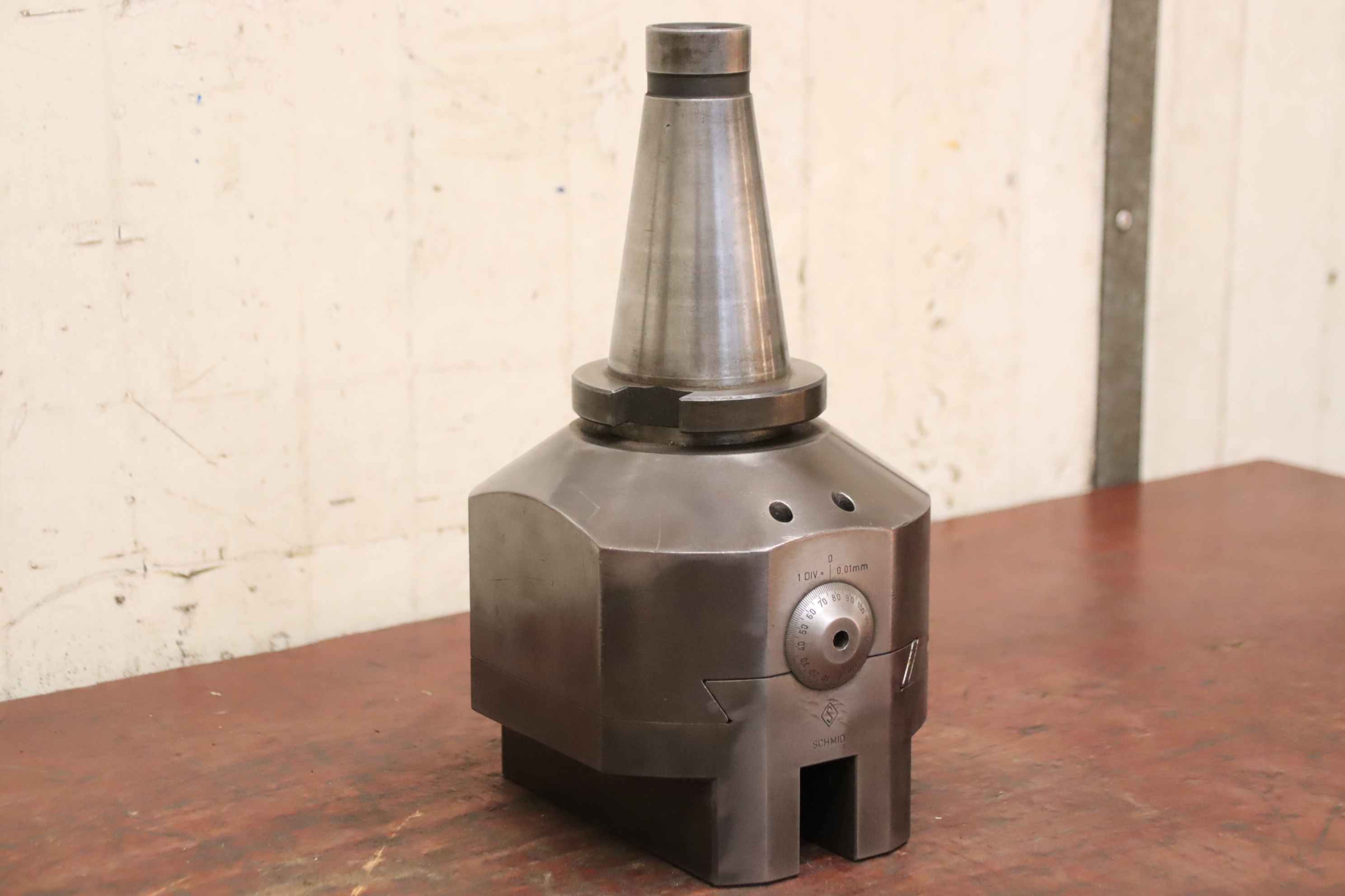 Boring head, spindle head, drilling head, grooving drilling head, grooving head, spindle drilling head, boring head, universal drilling head, boring tool, facing head -Manufacturer: Schmid, plan and boring head -Type: S.AdK 6 -Recording: SK50 -Adjustment accuracy: 0.01 mm -Dimensions: 175/150/H305 mm -Weight: 24 kg
