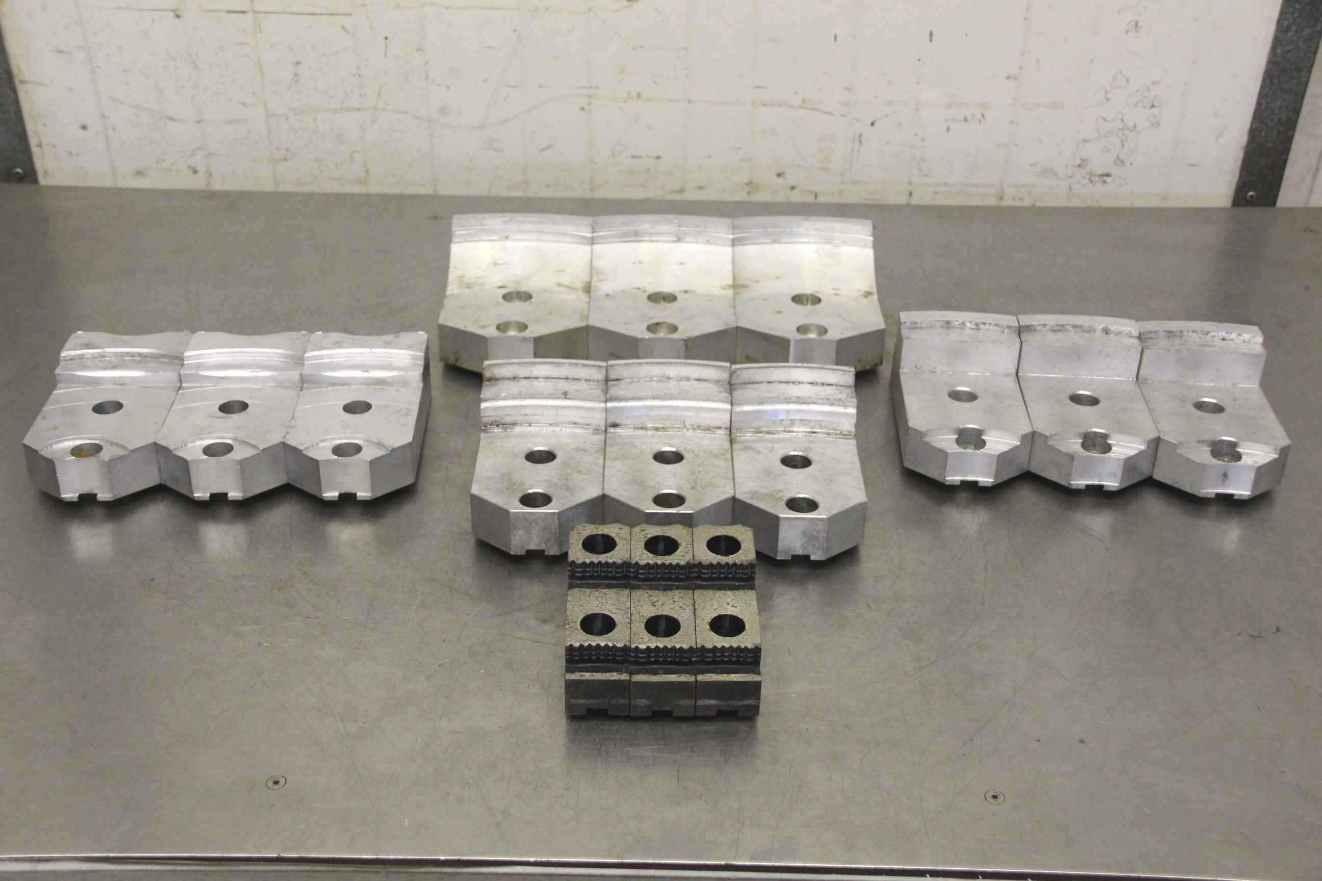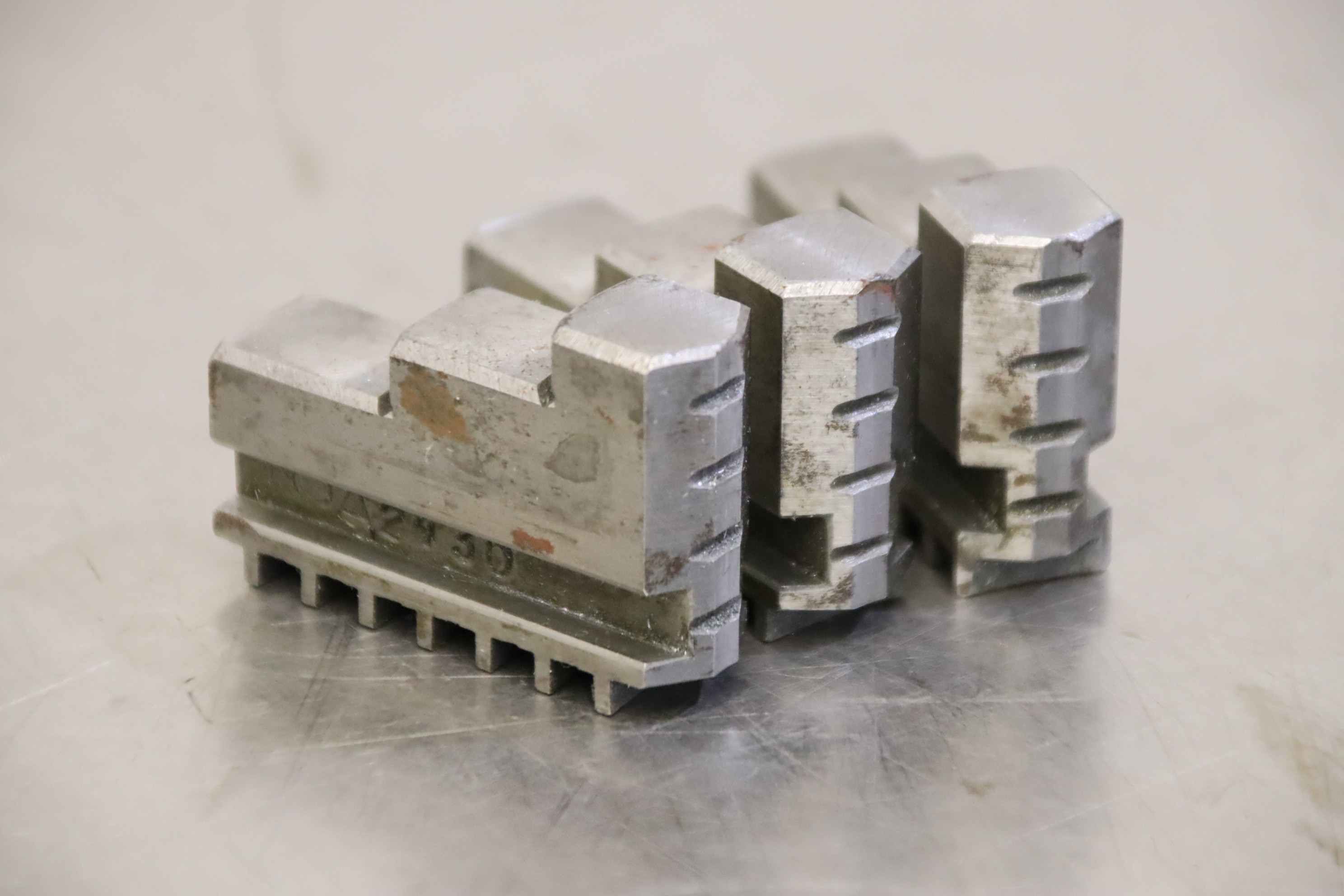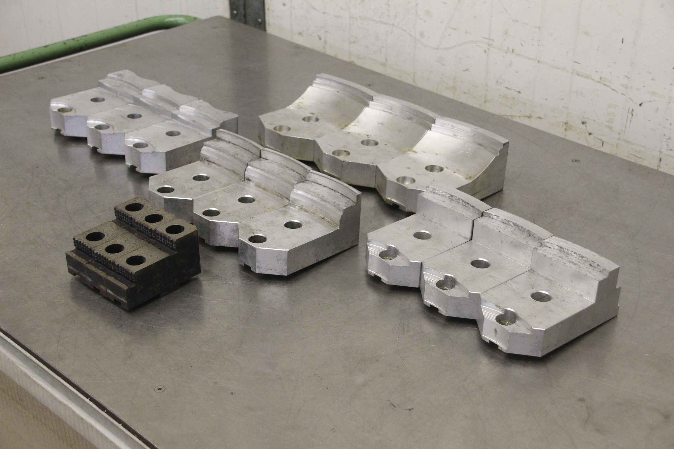 Interchangeable jaws, top jaws, three-jaw chucks, segment jaws-Top jaws: for power chucks-4 set: soft jaws, aluminum-1 movement: hard jaws-Hole spacing: 54 mm-Price/sale: only complete-Dimensions: 310/390/H110 mm-Weight: 18.7 kg