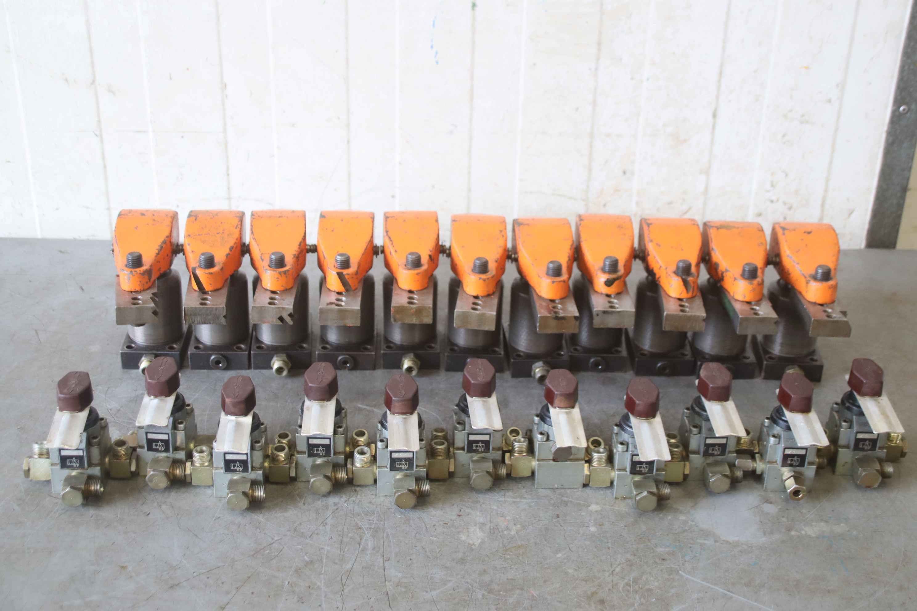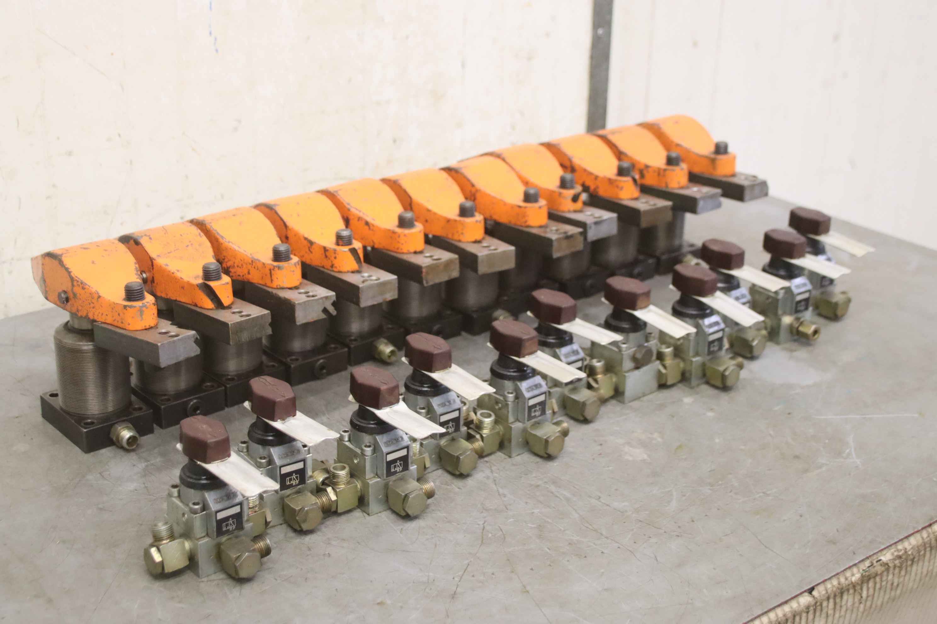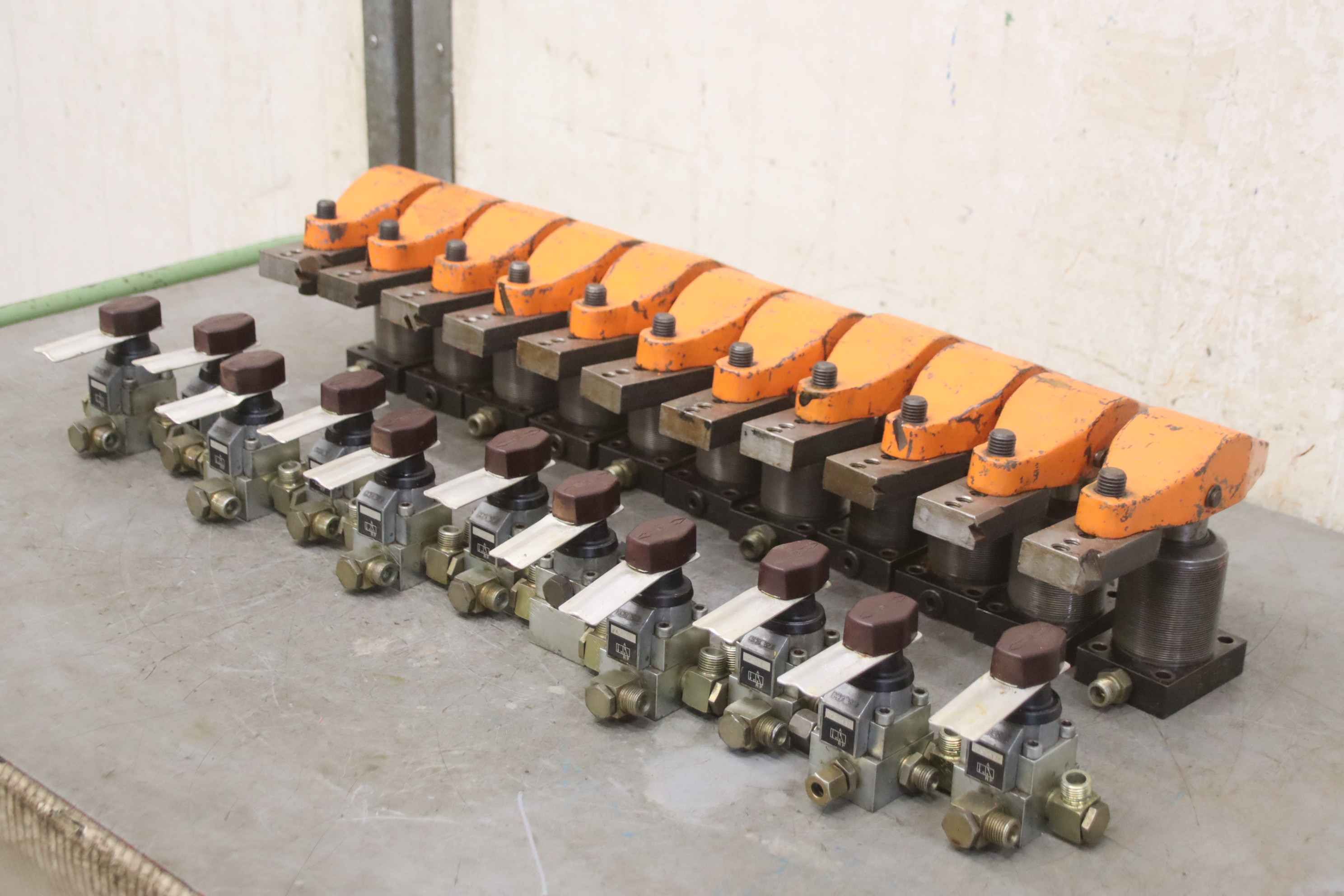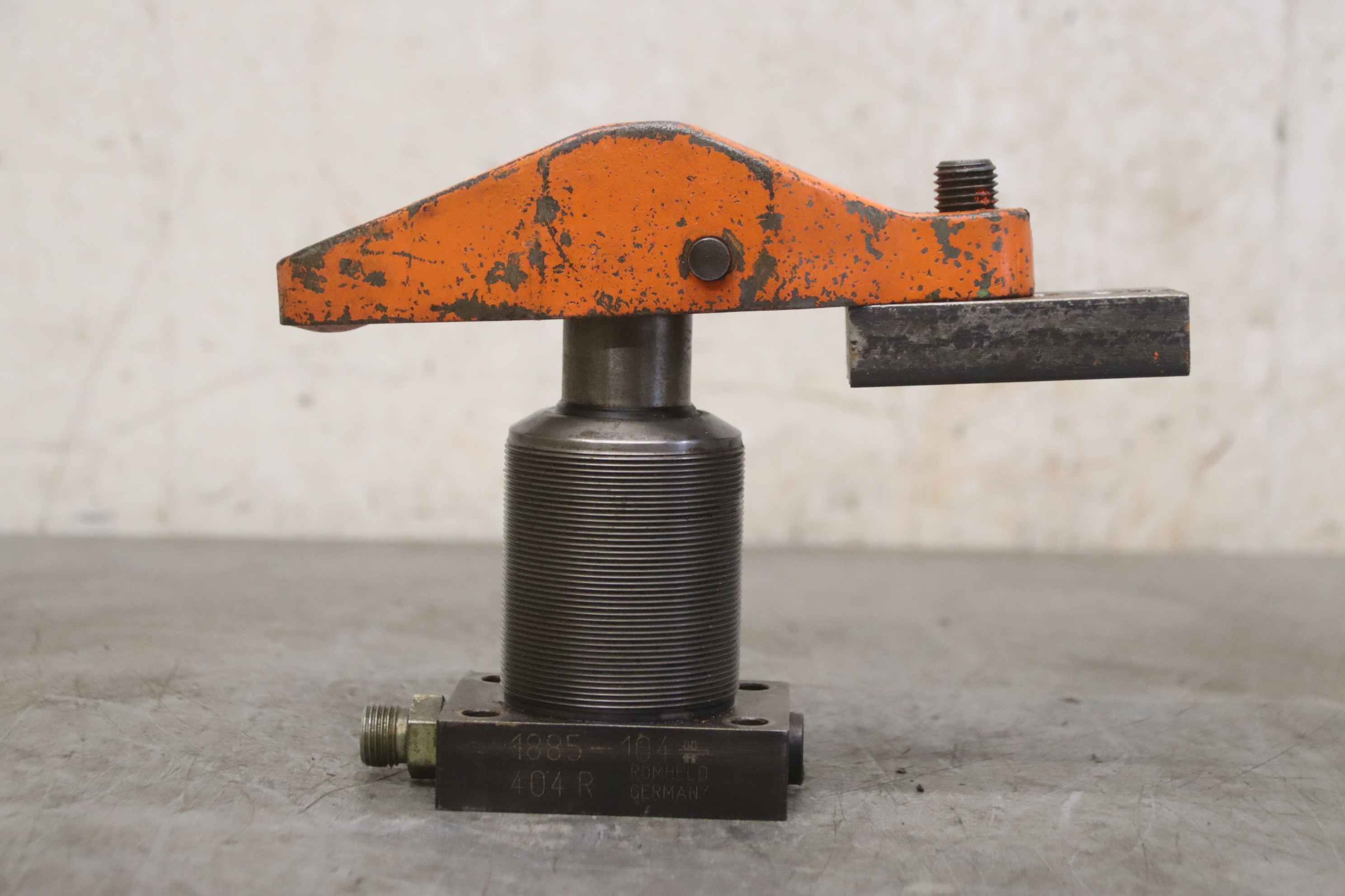 Clamping cylinder, hydraulic clamping cylinder, hydraulic clamp, hydraulic tensioner, swing clamp, hydraulic swing clamp-Hydraulic clamp: Hydraulic swivel clamps 11 pieces-Swivel clamp: Römheld 1885-104-Three-way valves: Hawe DZ3-1R-Price/tax: complete-Dimensions: 220/65/H165 mm / 100/100/H100 mm-Transport dimensions: 560/370/H160 mm-Weight: 64 kg