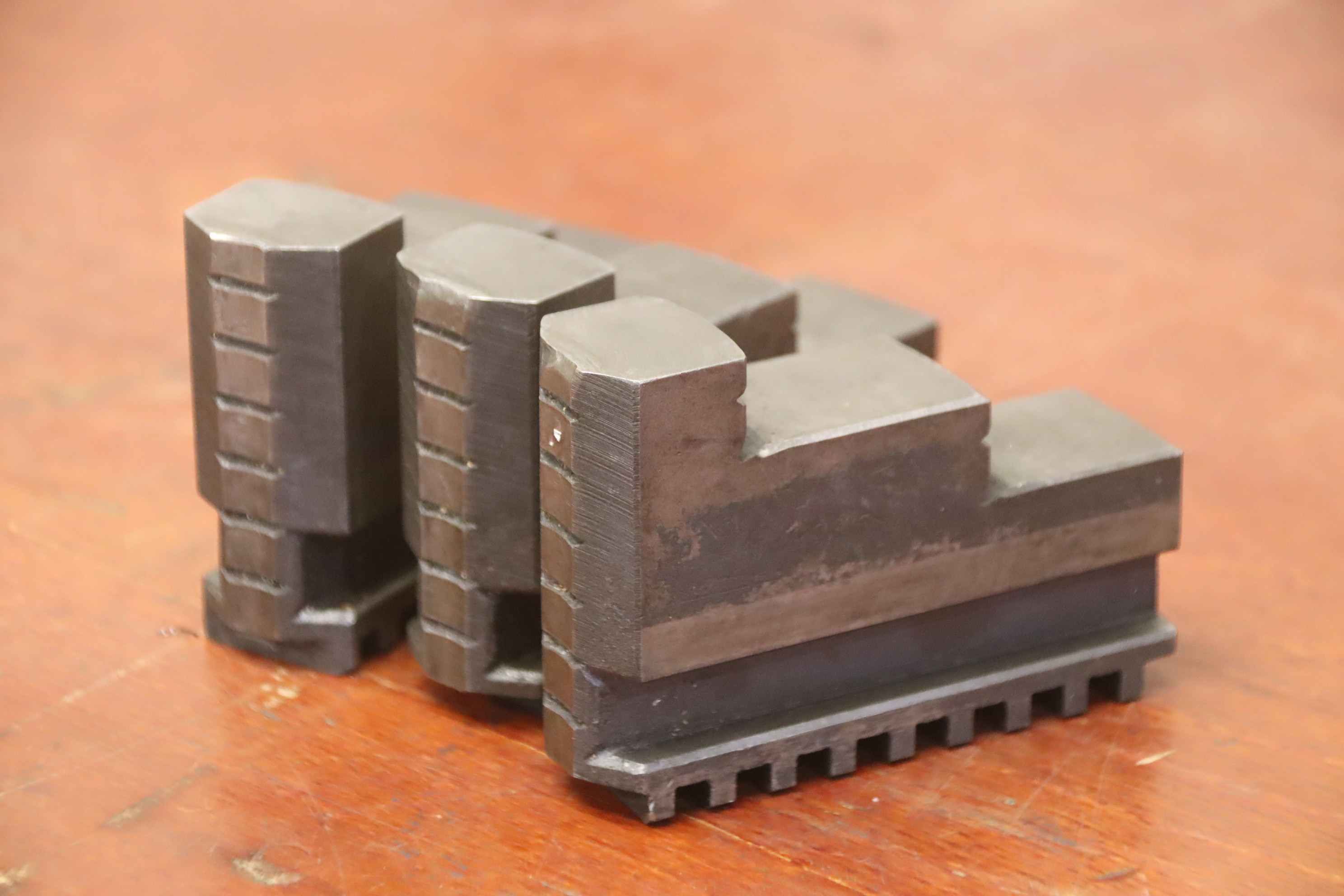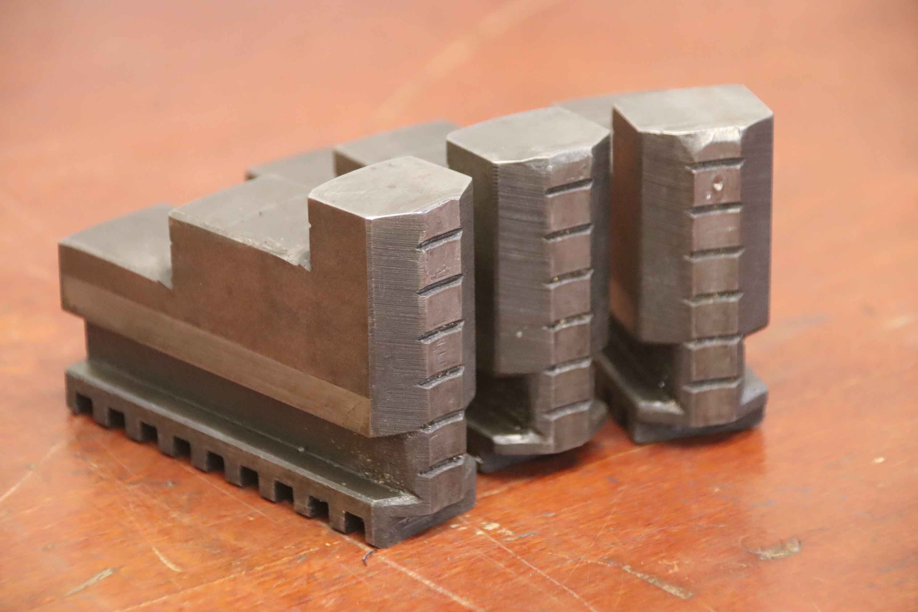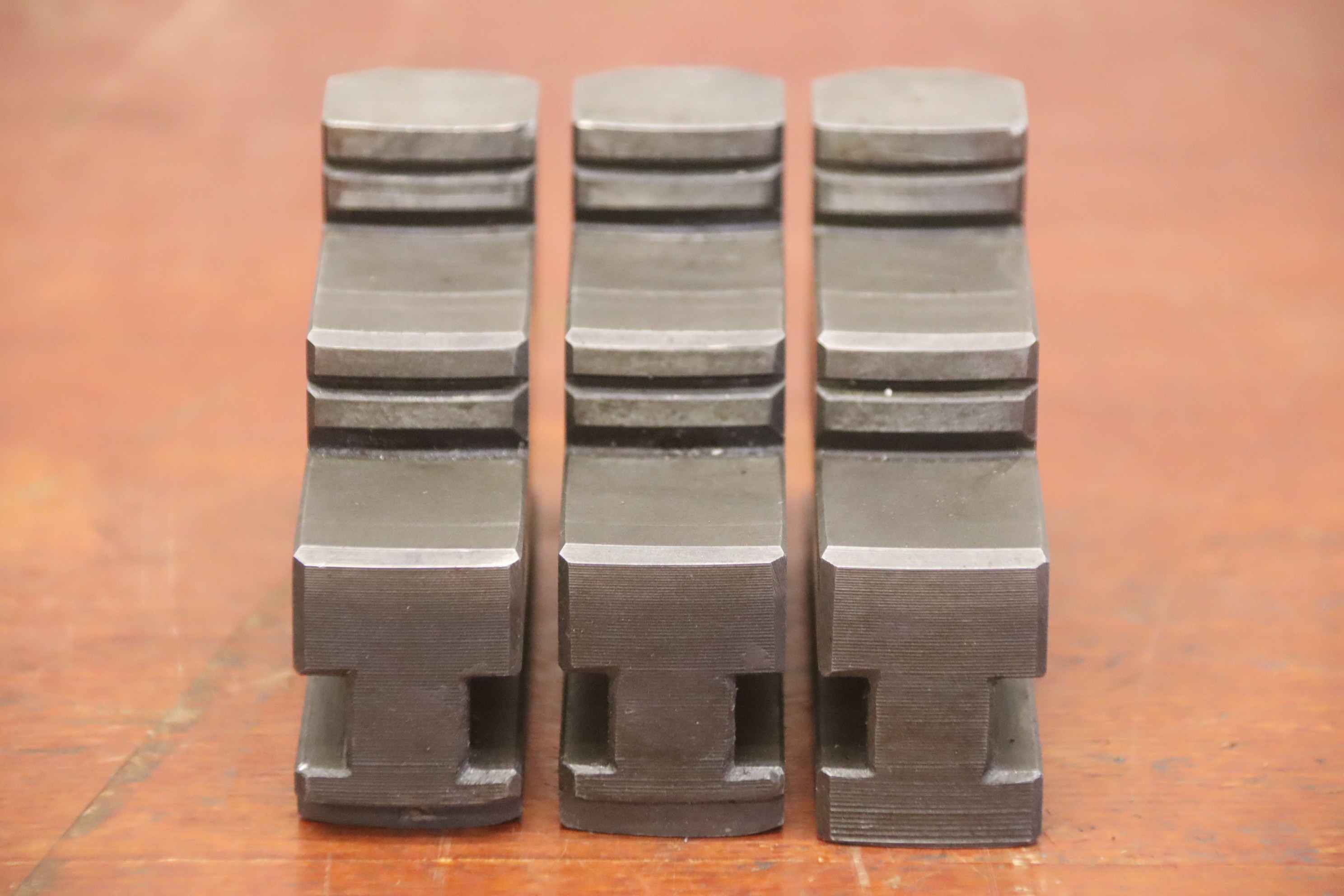 Interchangeable jaws, top jaws, three-jaw chucks, segment jaws, clamping jaws, step block jaws, step top jaws, block jaws, base jaws-Top jaws: Jaw set for three-jaw lathe chucks, hard-Jaw width: 27 mm-Dimensions: see photo technical. drawing-Total dimensions: 90/80/H65 mm-Total weight: 2.4 kg