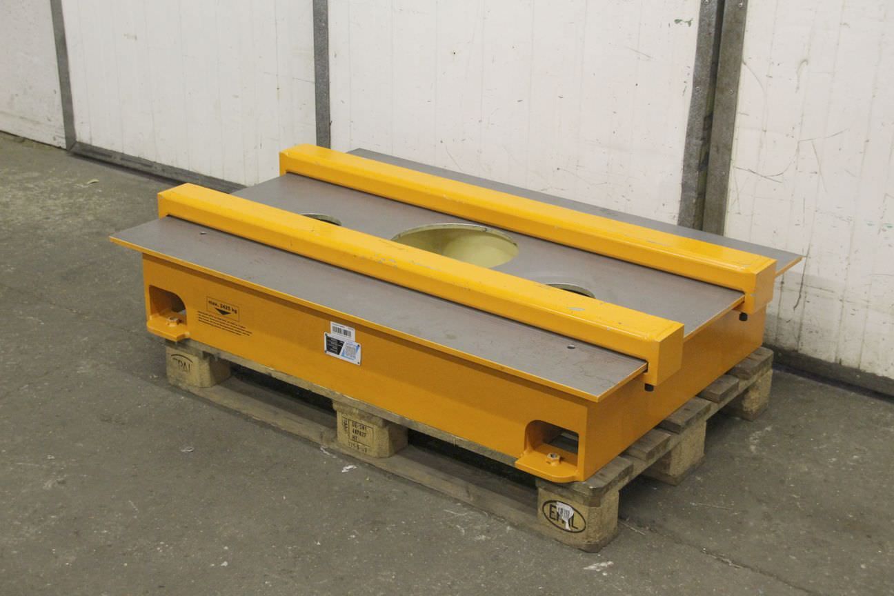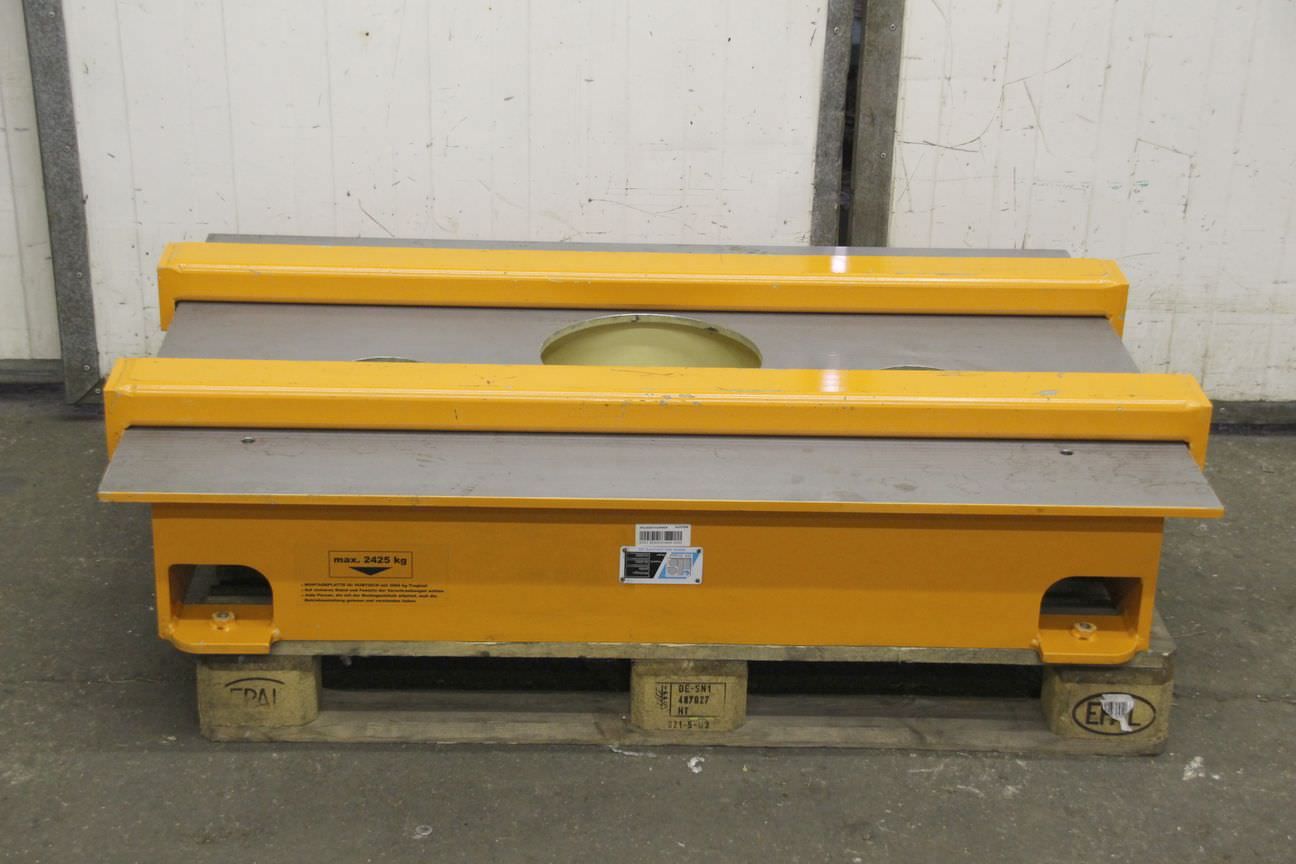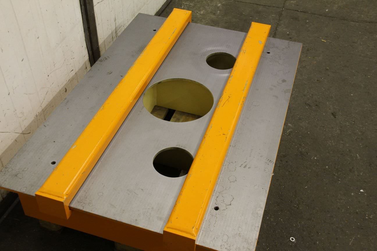 Mounting plate, scribing/marking plate, measuring plate, measuring table, welding table, welding table, straightening plate -Clamping plate: planed -orange stops: adjustable -Mounting plate with holes: 2x Ø 150 mm 1x Ø 300 mm -Width: 900 mm -Length: 1345 mm -Height: 228 mm -Sheet thickness: 13 mm -Plate: is equipped with supporting ribs -Number: 2x plates available Price: per piece -Transport dimensions: 1345/900/H280 mm -Weight: 370 kg/piece