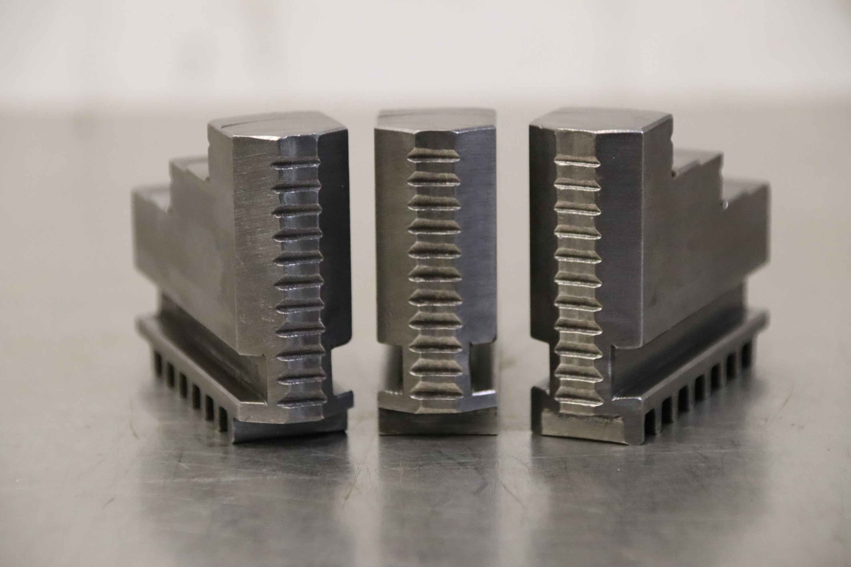 Interchangeable jaws, top jaws, three-jaw chucks, segment jaws, clamping jaws, step block jaws, step top jaws, block jaws, base jaws, 4-jaw set-Top jaws: Jaw set for three-jaw lathe chucks, hard-Jaw width: 20 mm-Dimensions: see photo technical. drawing-Total dimensions: 70/60/H55 mm -Total weight: 1.1 kg