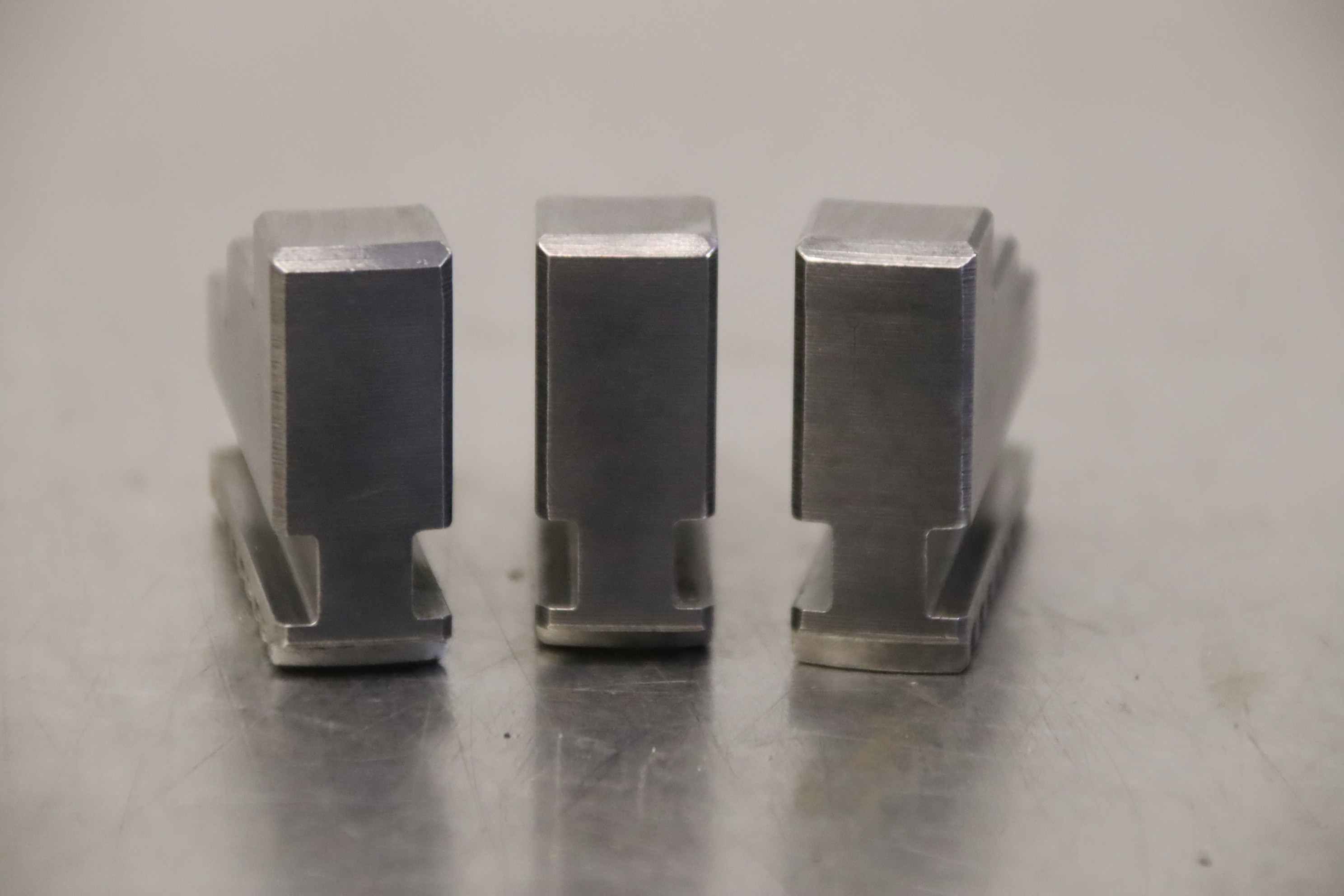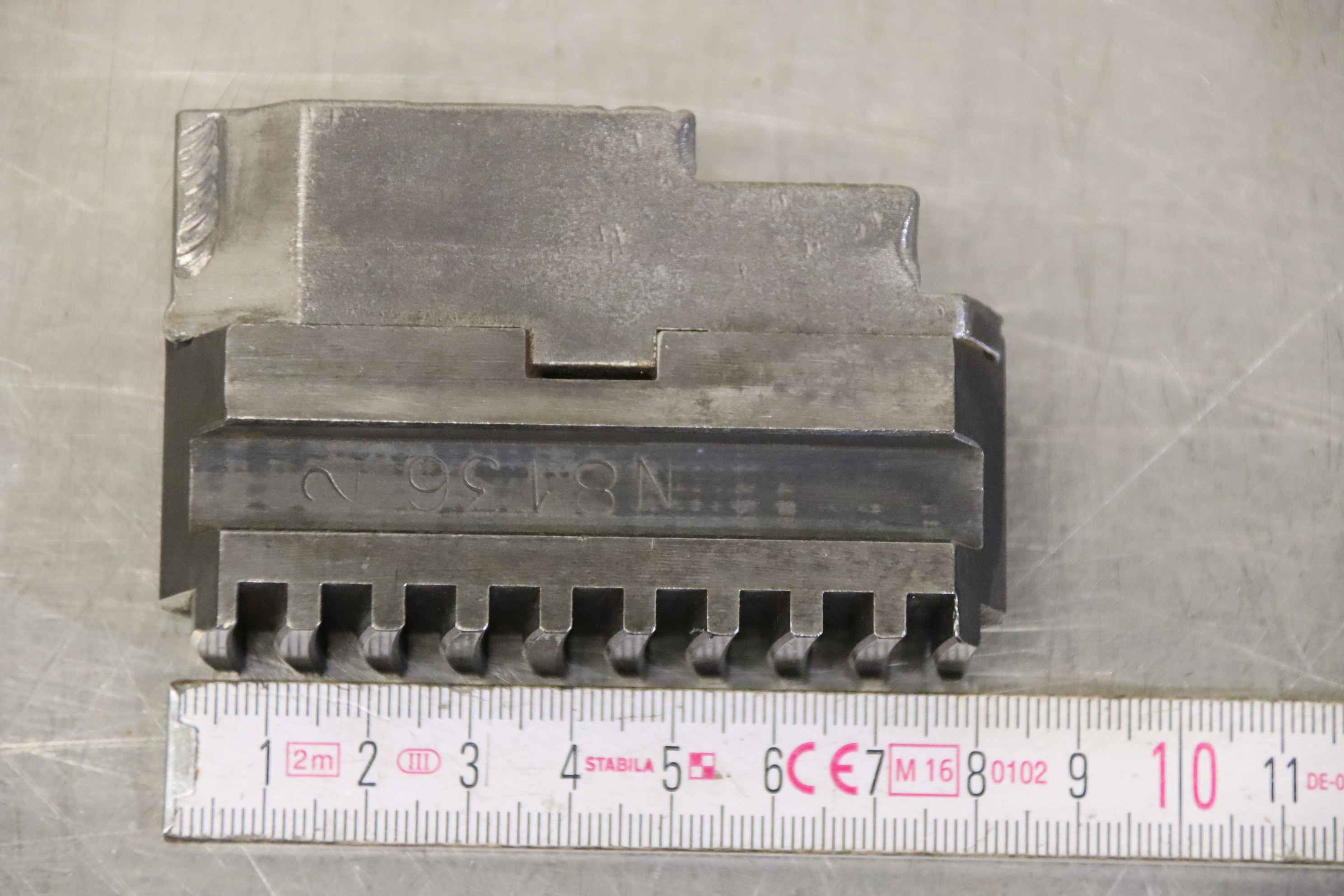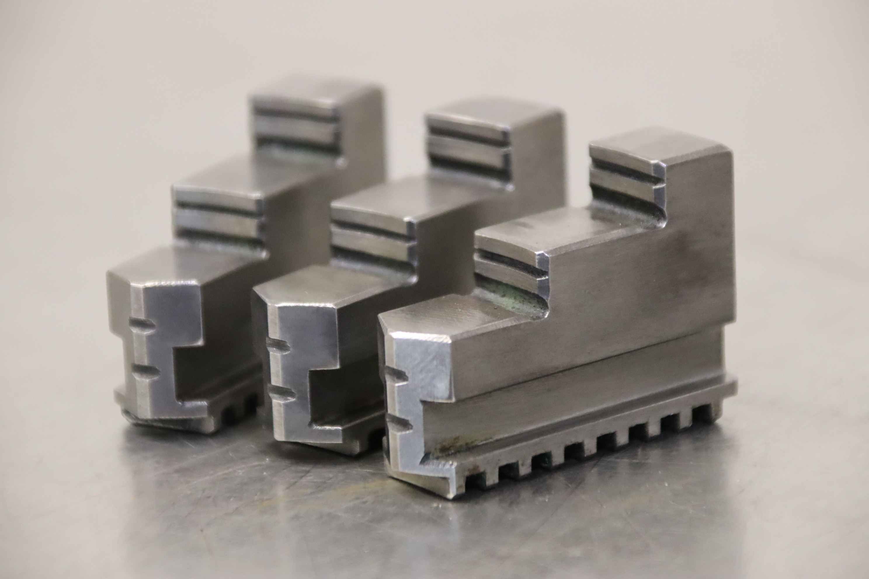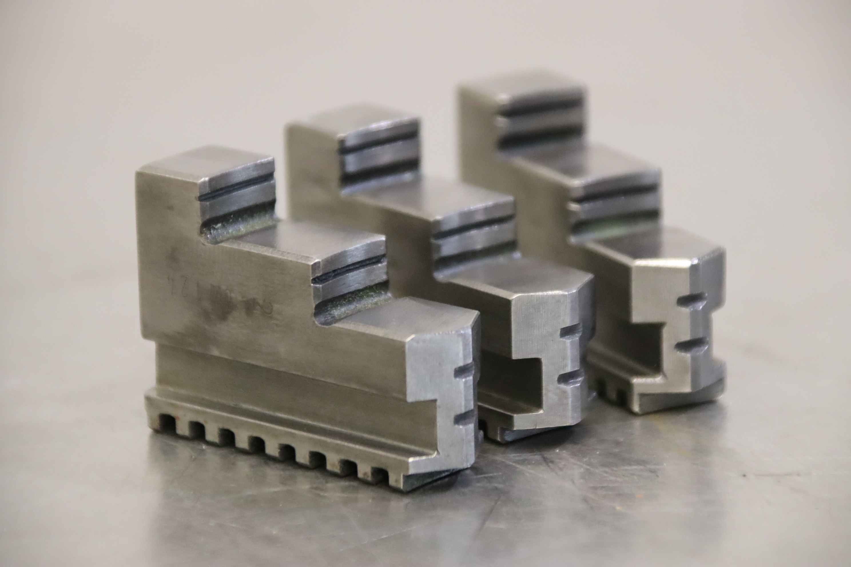 Interchangeable jaws, top jaws, three-jaw chuck, segment jaws, clamping jaws, stepped block jaws, stepped top jaws, block jaws, base jaws, 4-jaw set-Top jaws: Jaw set for three-jaw lathe chucks, hard-Jaw width: 14 mm-Dimensions: see photo techn. drawing-Total dimensions: 50/40/H35 mm-Total weight: 0,3 kg