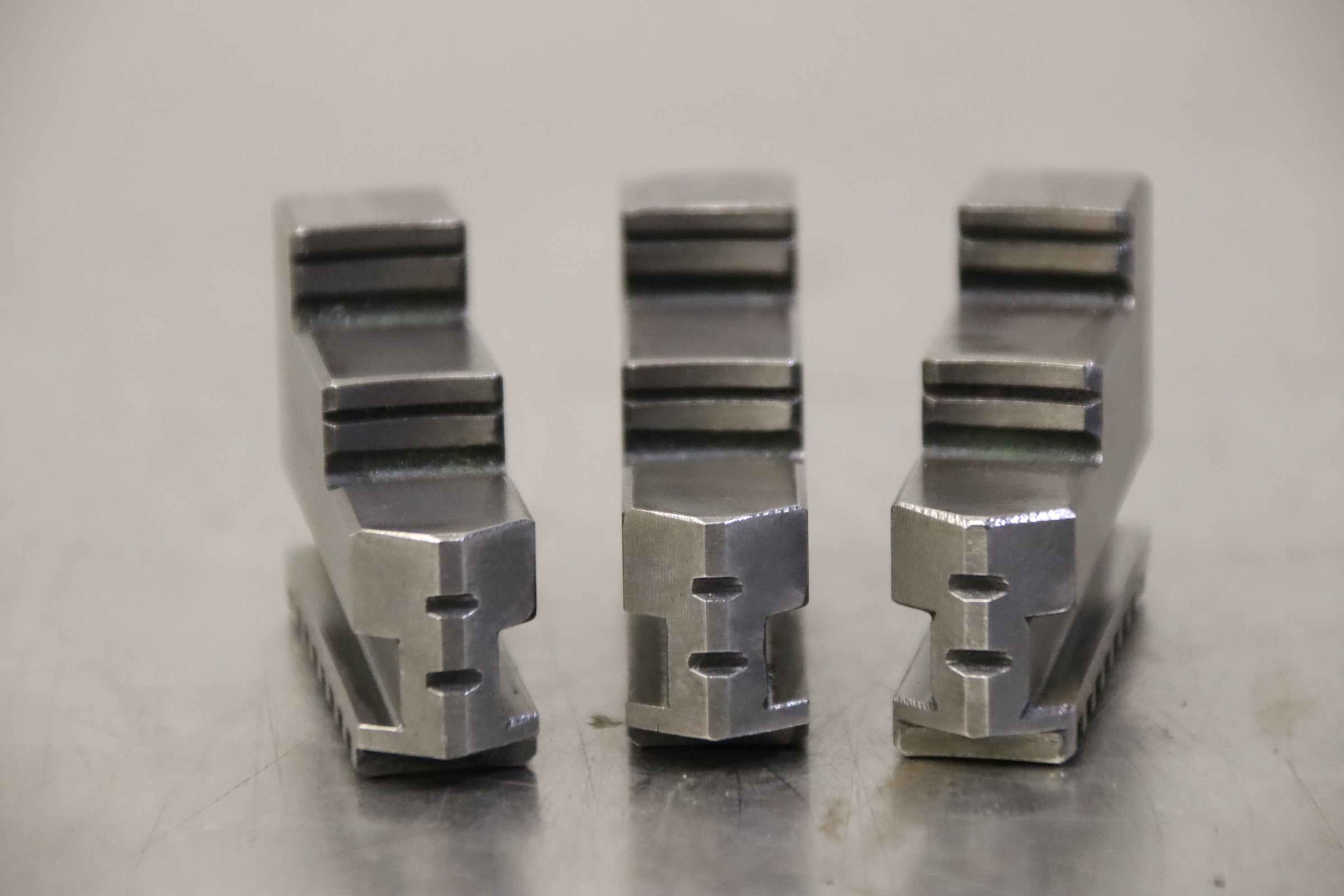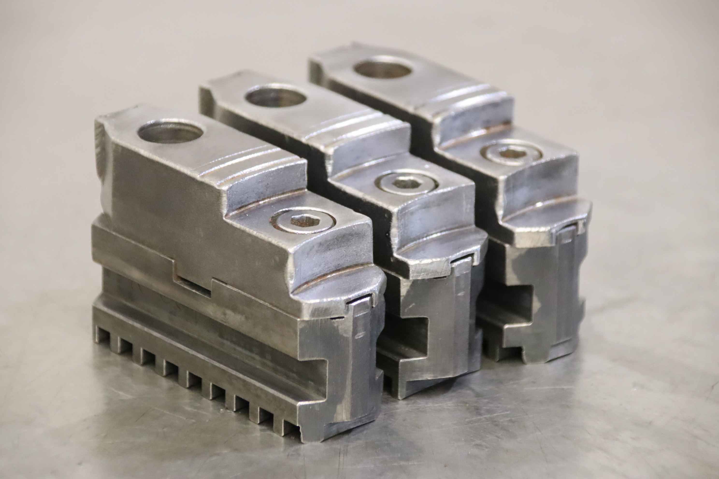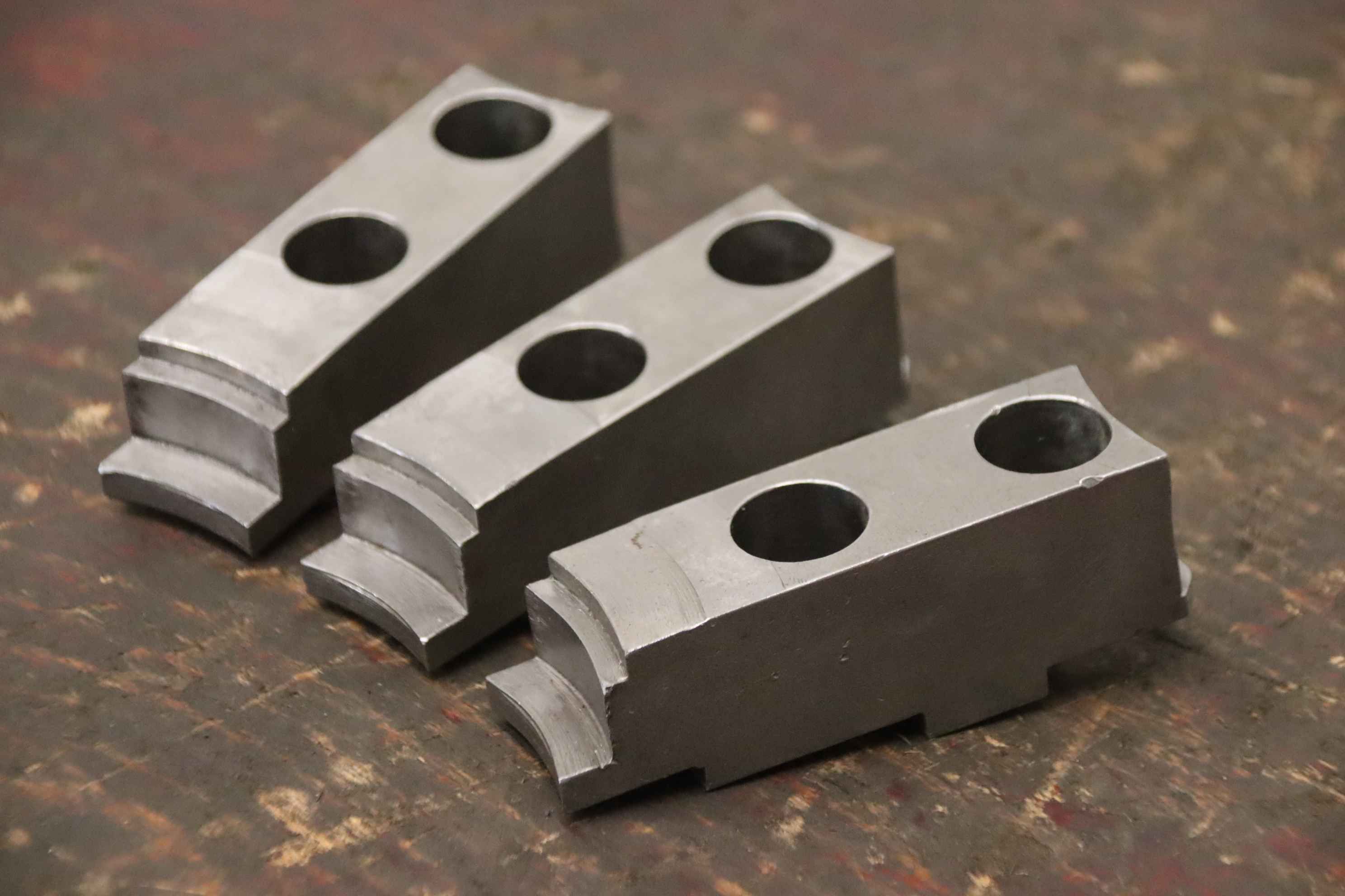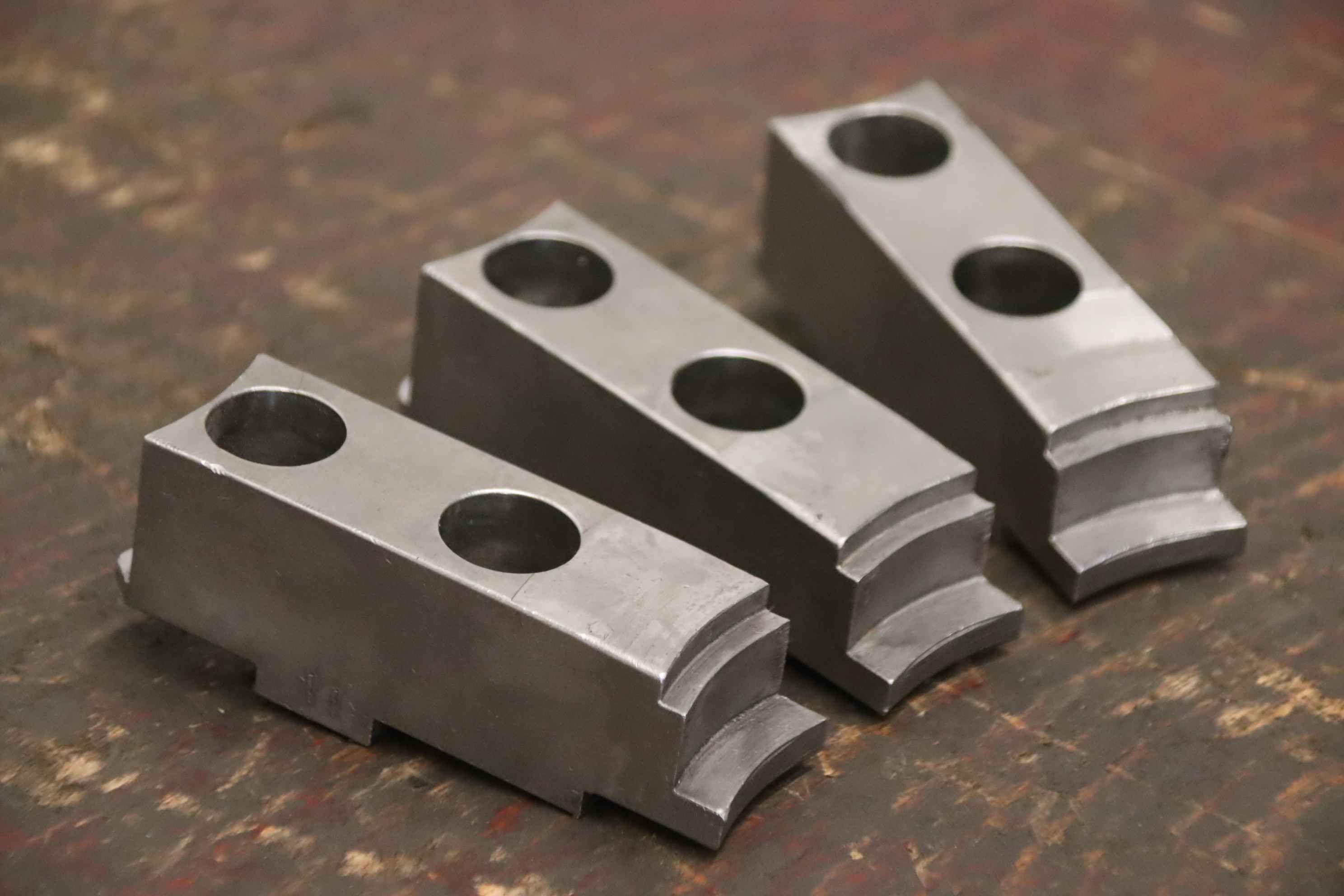 Interchangeable jaws, top jaws, three-jaw chucks, segment jaws, clamping jaws, step block jaws, step top jaws, block jaws, base jaws, 4-jaw set-Top jaws: Jaw set for three-jaw lathe chucks, soft-Jaw width: 26 mm-Dimensions: see photo technical. drawing-Total dimensions: 83/77/H53 mm-Total weight: 1.8 kg