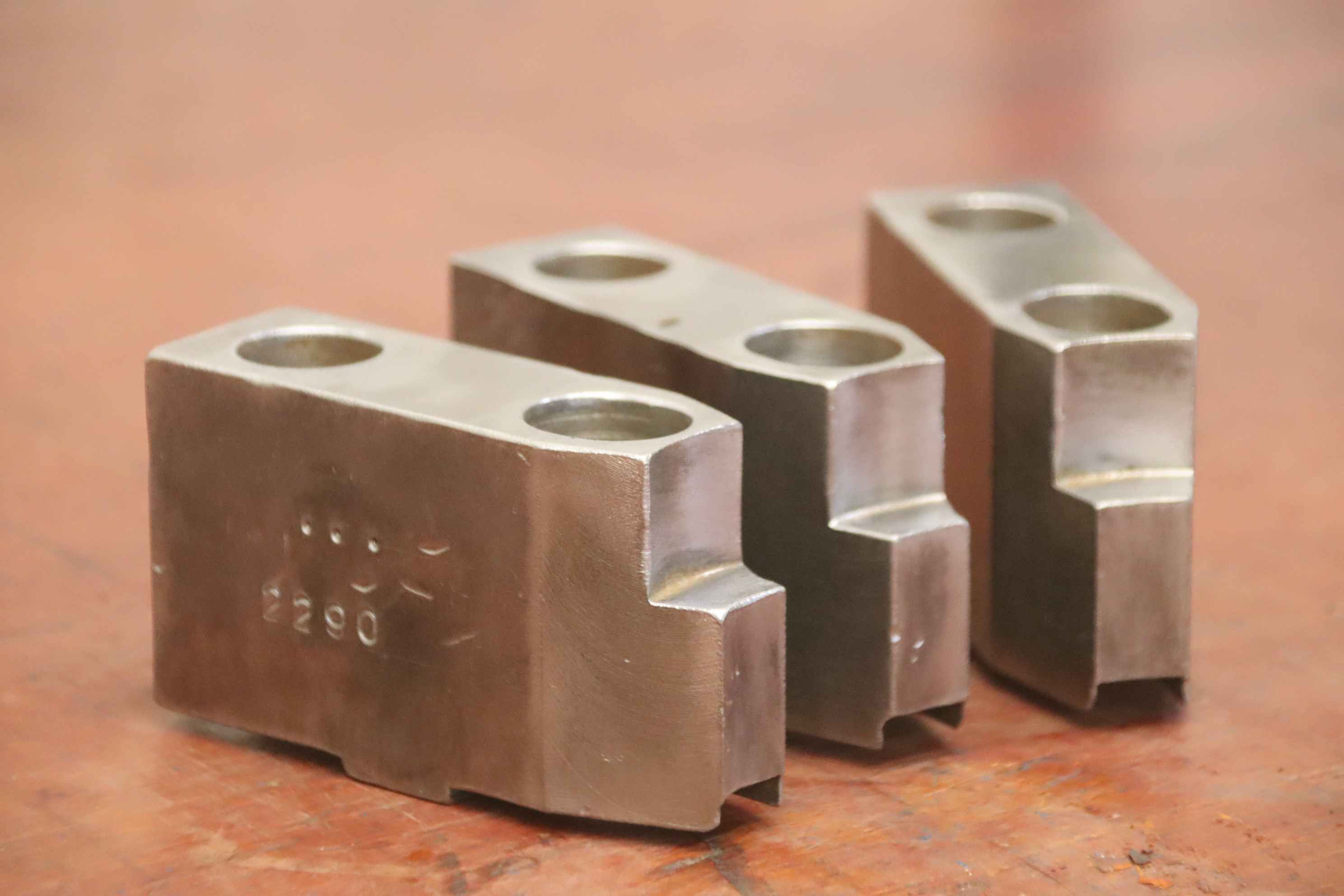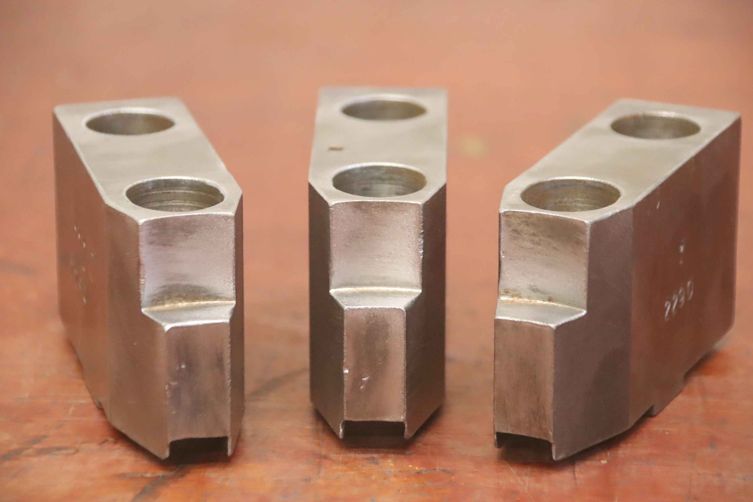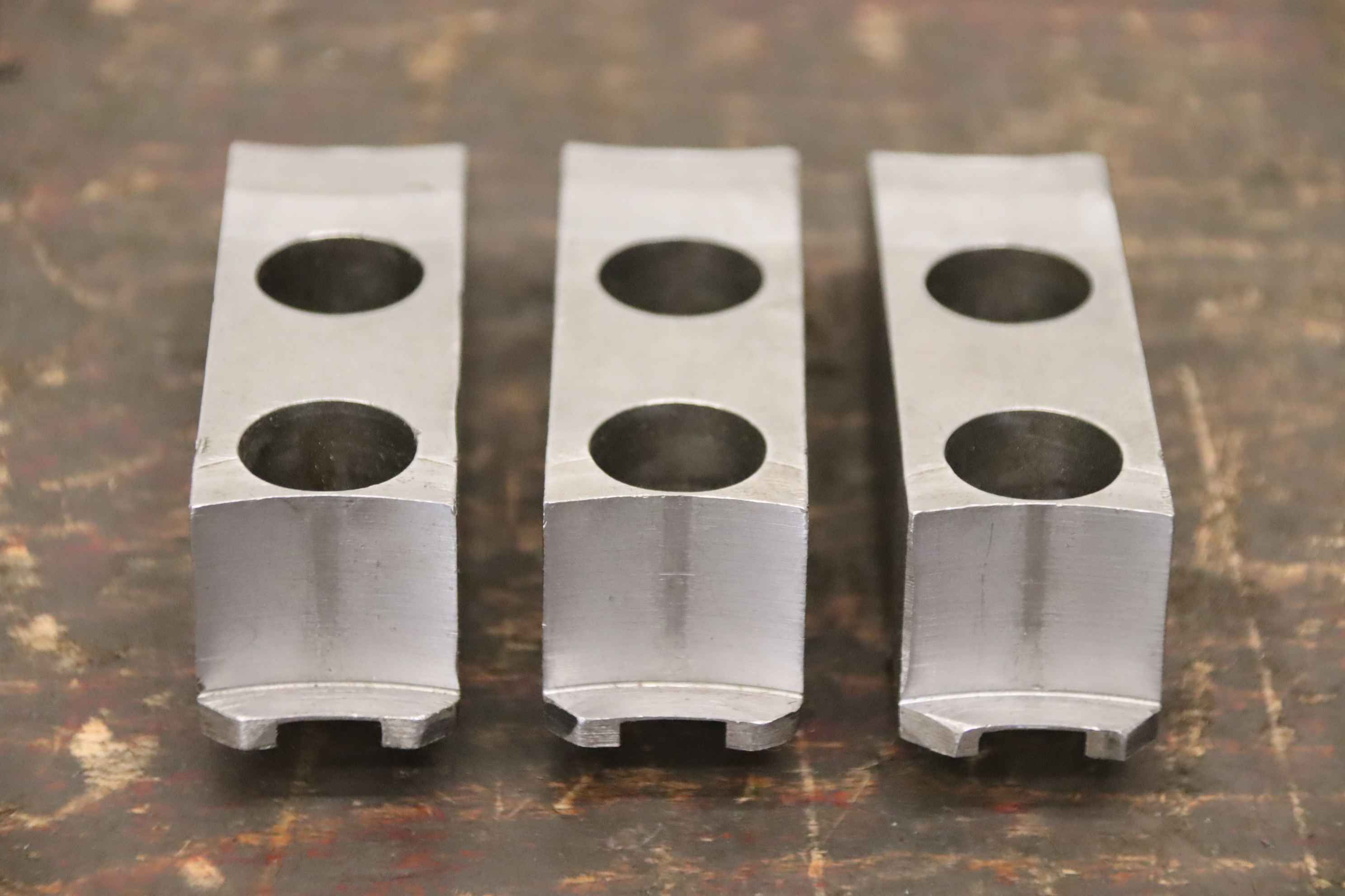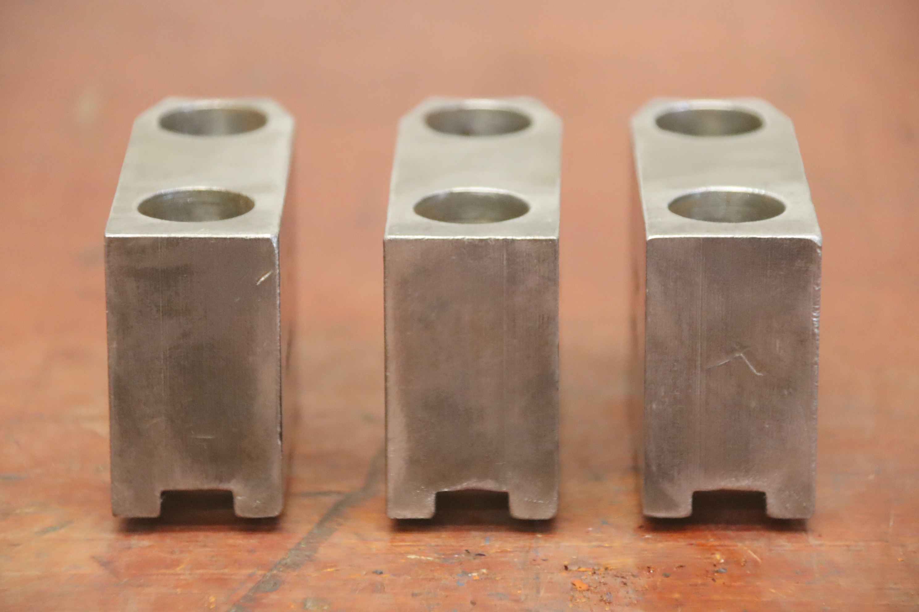 Interchangeable jaws, top jaws, three-jaw chucks, segment jaws, clamping jaws, step block jaws, step top jaws, block jaws, base jaws, 4-jaw set-Top jaws: Jaw set for three-jaw lathe chucks, soft-Jaw width: 26 mm-Dimensions: see photo technical. drawing-Total dimensions: 83/77/H53 mm-Total weight: 1.8 kg