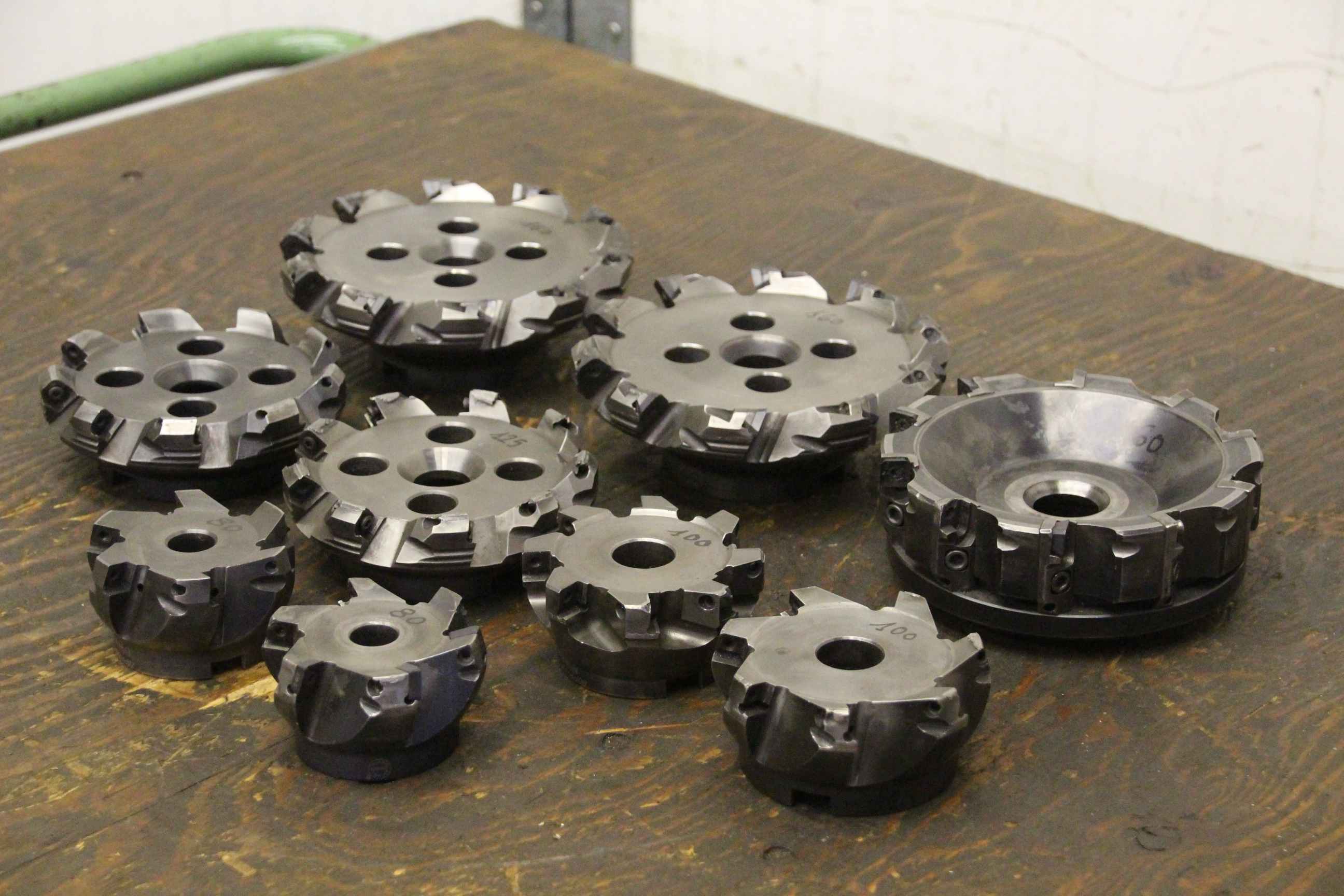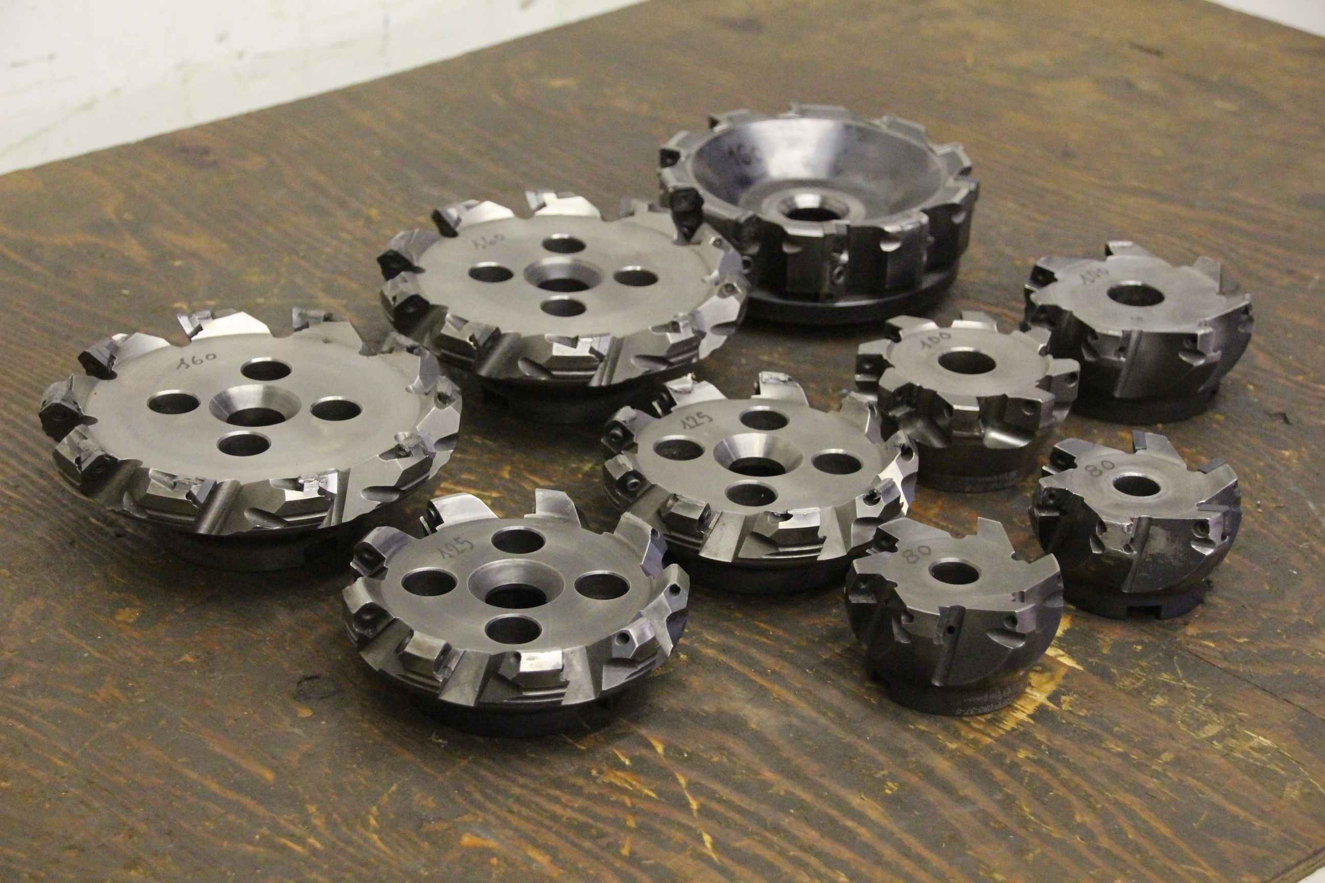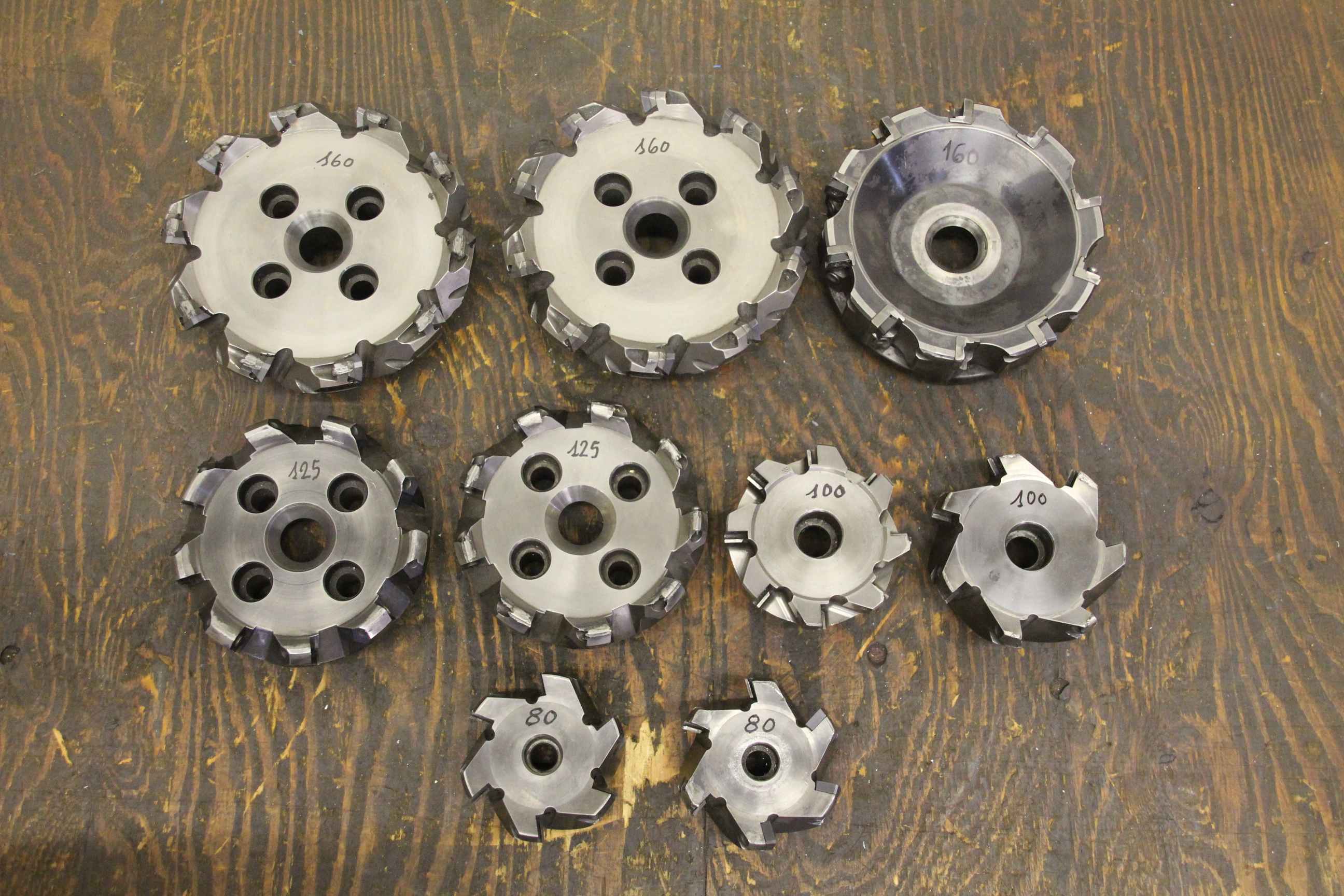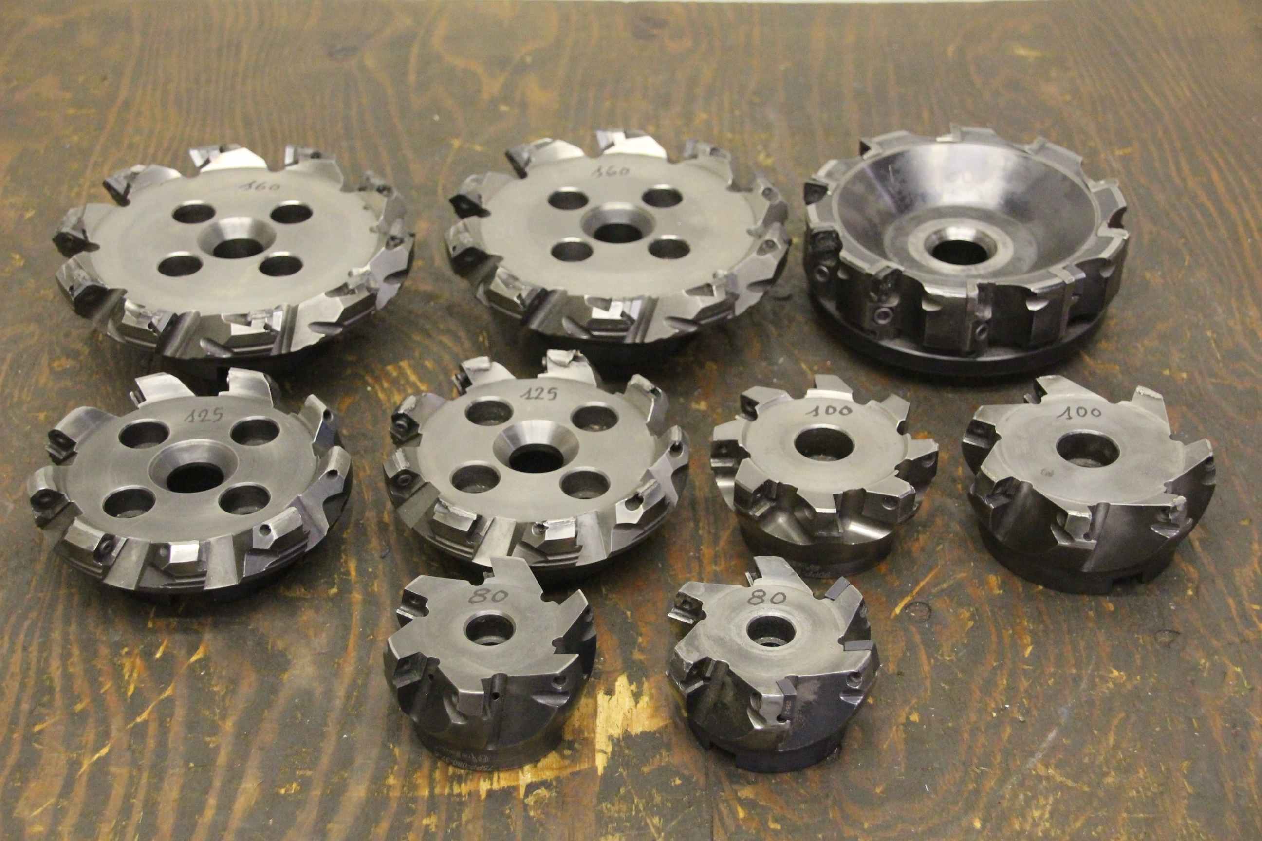 End mill, indexable insert milling cutter, hedgehog cutter, tool holder, milling holder, milling tool, cutter head -Handover: in its current condition as inspected -Cutting board: partially slightly damaged, see photos -Reversible plates: mostly missing, see photos -Type: 45-PP-160-140-10 Ø 160 mm 3 pieces -Type: 45-PP-125-113 Ø 125 mm 1 piece -Type: 45-PP-125-113-9 Ø 125 mm 1 piece -Type: 90-PP-100-22-8 Ø 100 mm 2 pieces -Type: 75-PP-080-37-6 Ø 80 mm 1 piece -Type: 75-PP-080-37 Ø 80 mm 1 piece -Dimensions: 395/295/H145 mm -Weight: 29 kg