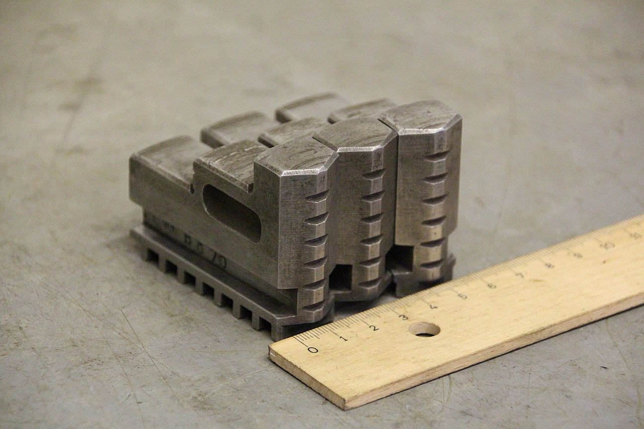 Interchangeable jaws, top jaws, three-jaw chucks, segment jaws, clamping jaws, stepped block jaws, stepped top jaws, block jaws, base jaws -Top jaws: Jaw set for three-jaw lathe chuck, hard -Jaw width: 20 mm -Dimensions: see photo technical drawing -Number: 2 sets of interchangeable jaws available -Price: per set -Dimensions total: 70/60/H54 mm / 69/60/H54 -Total weight: 1.1 kg/set