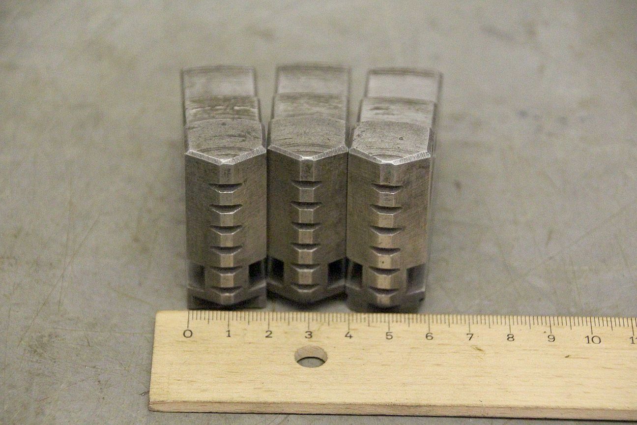 Interchangeable jaws, top jaws, three-jaw chucks, segment jaws, clamping jaws, step block jaws, step top jaws, block jaws, base jaws, interchangeable jaws, wedge bar chucks, interchangeable jaws power chucks-Top jaws: soft top jaws for wedge bar chucks, helical teeth-Jaw width: 22 mm-Dimensions: see photo technical. drawing-Total dimensions: 95/70/H70 mm-Total weight: 2.7 kg