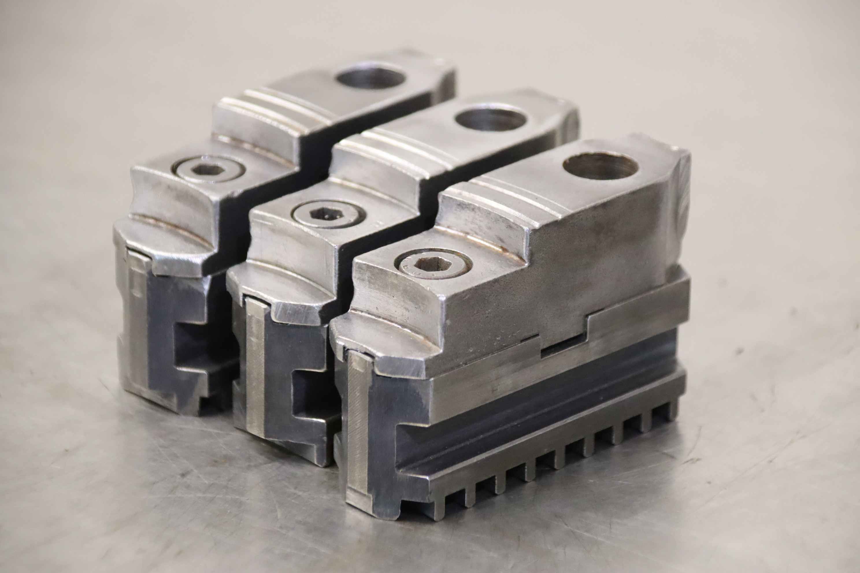 Interchangeable jaws, top jaws, three-jaw chucks, segment jaws, clamping jaws, stepped block jaws, stepped top jaws, block jaws-Interchangeable jaws: 3-piece soft top jaw set-Width: 22 mm-Dimensions total: 105/65/H45 mm-Total weight: 2.0 kg