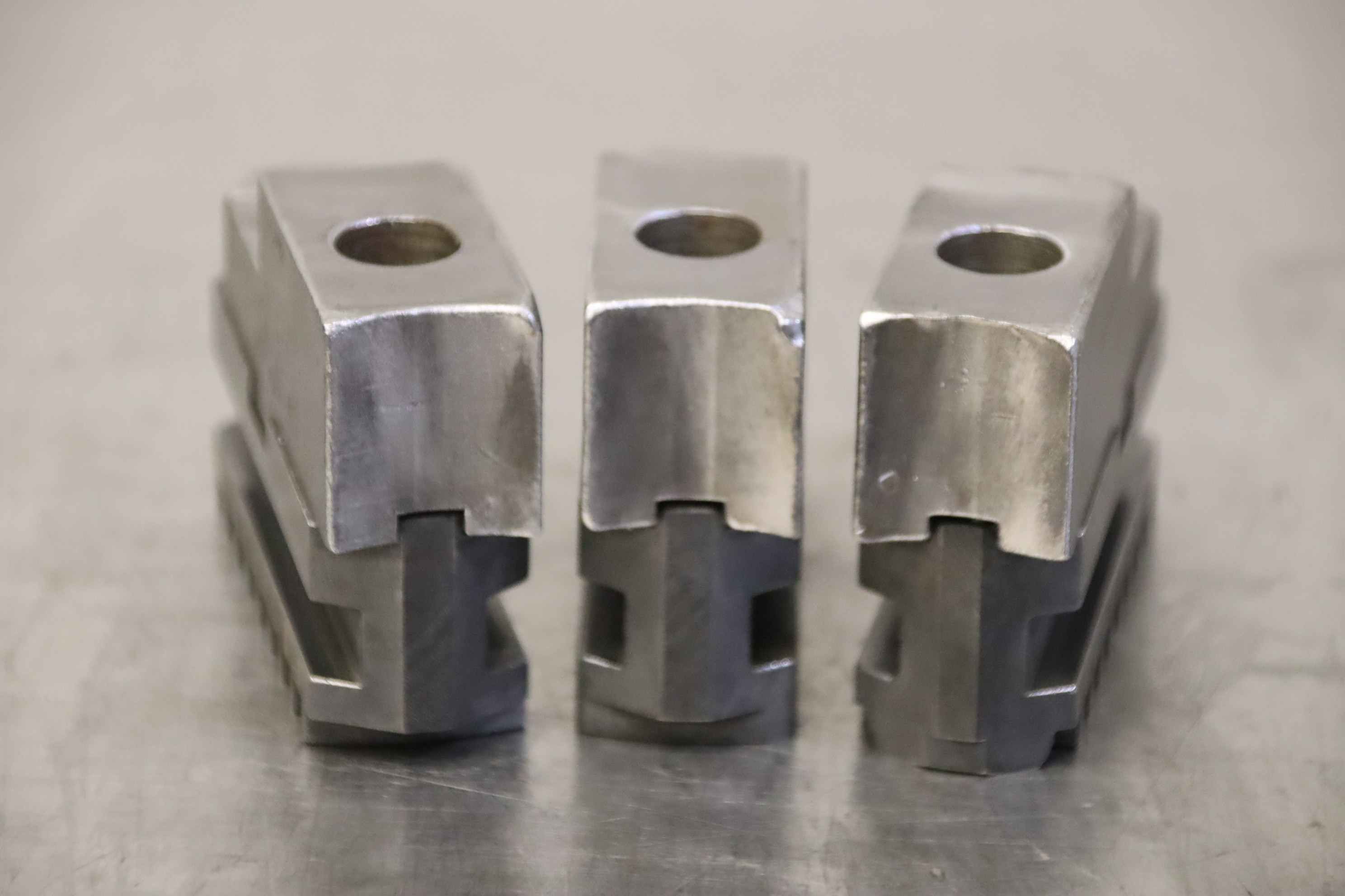 Interchangeable jaws, top jaws, three-jaw chucks, segment jaws, clamping jaws, step block jaws, step top jaws, block jaws, base jaws, interchangeable jaws, wedge bar chucks, interchangeable jaws power chucks-Top jaws: soft top jaws for wedge bar chucks, helical teeth-Jaw width: 22 mm-Dimensions: see photo technical. drawing-Total dimensions: 100/65/H65 mm-Total weight: 2.3 kg