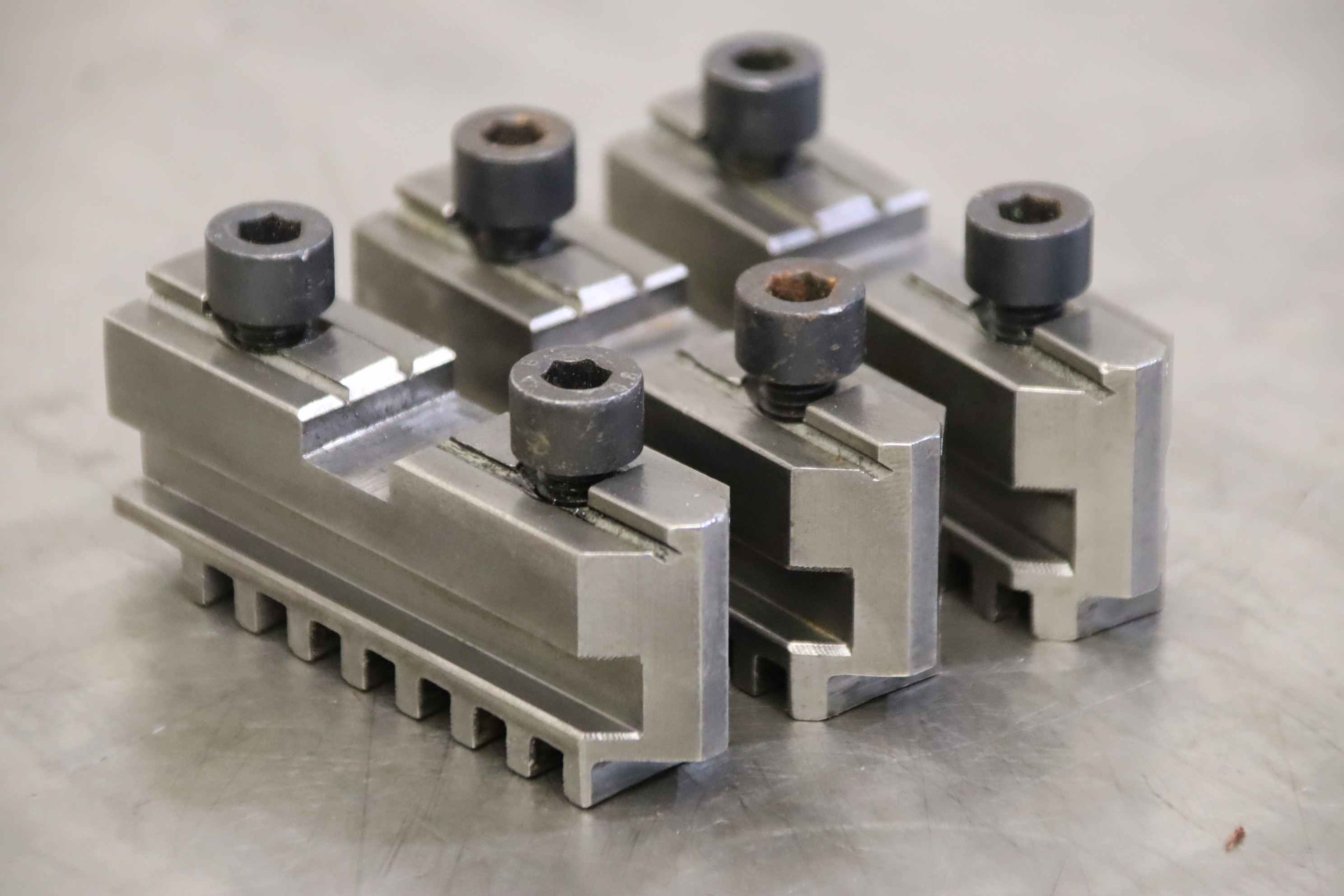 Interchangeable jaws, top jaws, three-jaw chucks, segment jaws, clamping jaws, step block jaws, step top jaws, block jaws, base jaws, 4-jaw set-Top jaws: Base jaws for three-jaw lathe chucks-Jaw width: 20 mm-Dimensions: see photo technical. drawing-Total dimensions: 79/60/H40 mm-Total weight: 0.8 kg