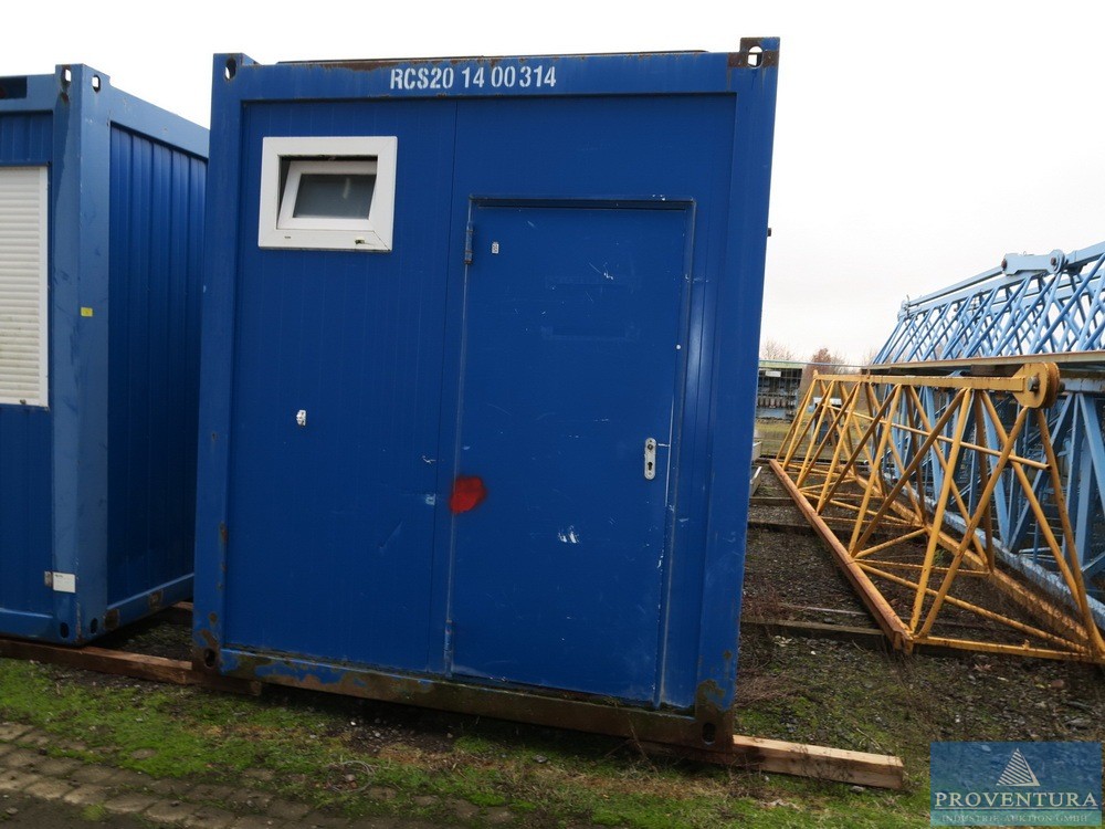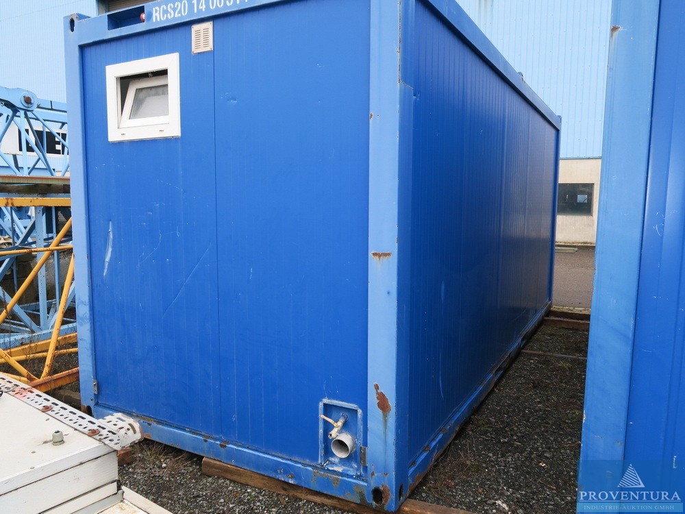 санитарный контейнер примерно 20 футов синий, примерно 606x244x280 см (LxWxH), интерьер с 4 туалетами, 4 писсуарами, 3 умывальниками с зеркалом, электрификацией и отоплением, плохое общее состояние, провисает потолок,