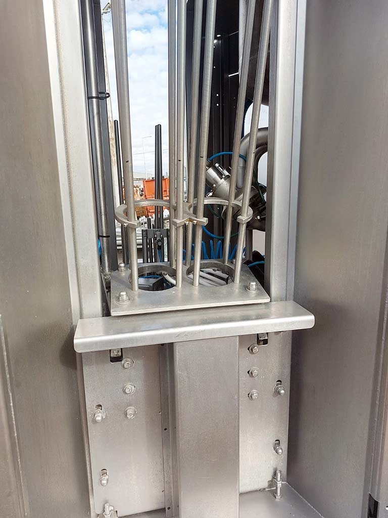 Ёмкость: 18000 бутылок в час, Особенности: регулировка высоты, устройство управления закрытием давления, механические/пневматические испытания натяжения цепи, устройство для инжекции высокого давления, устройство для промывания и набухани