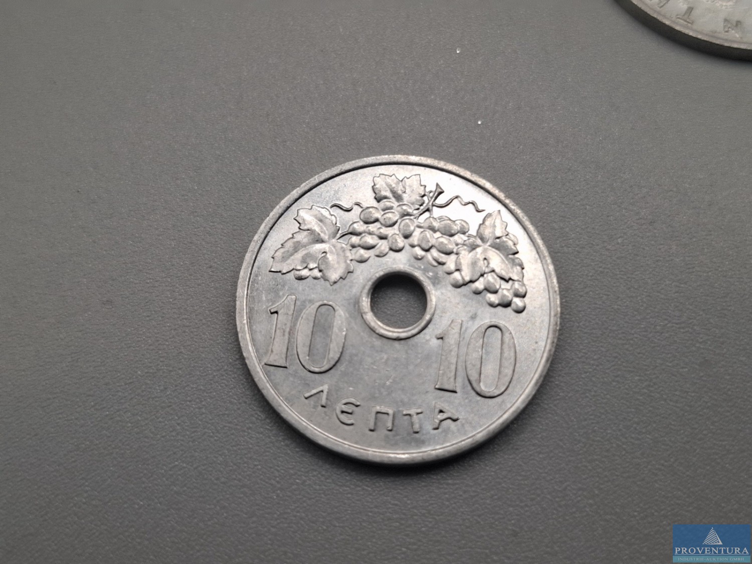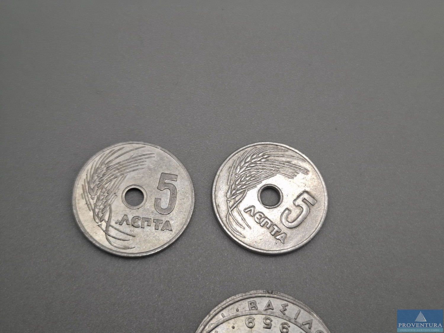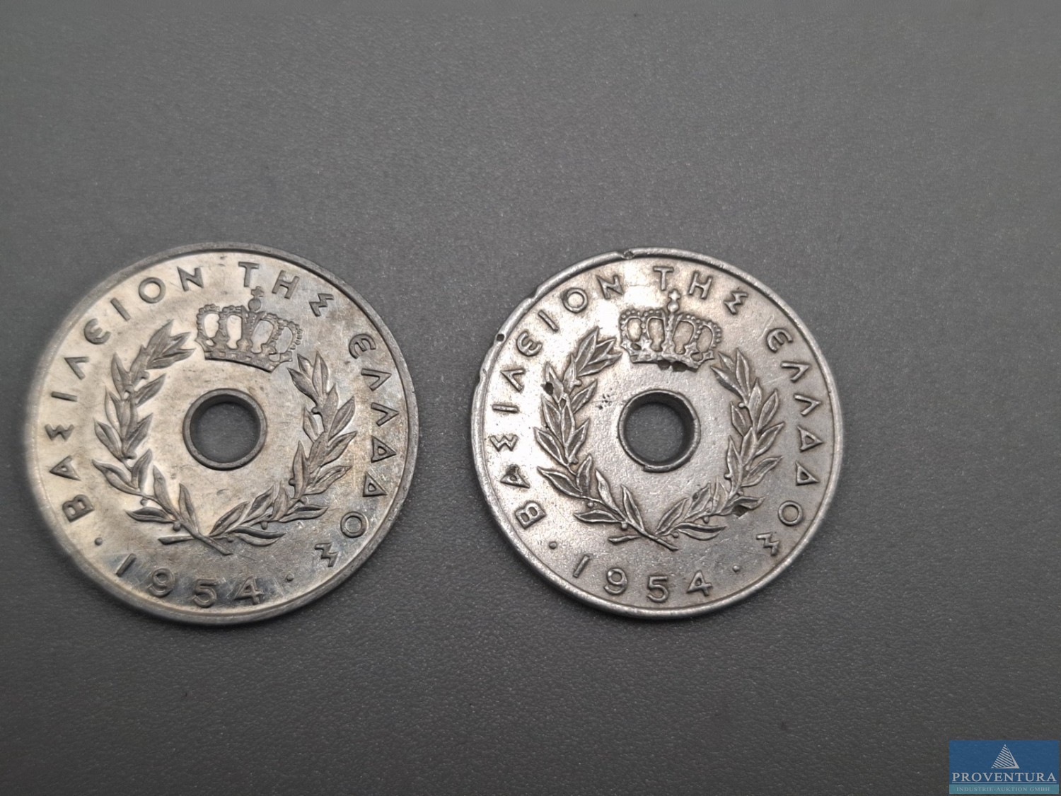 Монета обращения в Греции 1954-1973: 2x5 лепт, 14x10 лепт, 22x50 лепт, 15x1 драхма, 17x2 драхмы, 8x5 драхм, 12x10 драхм, 2x20 драхм, всего 92 монет